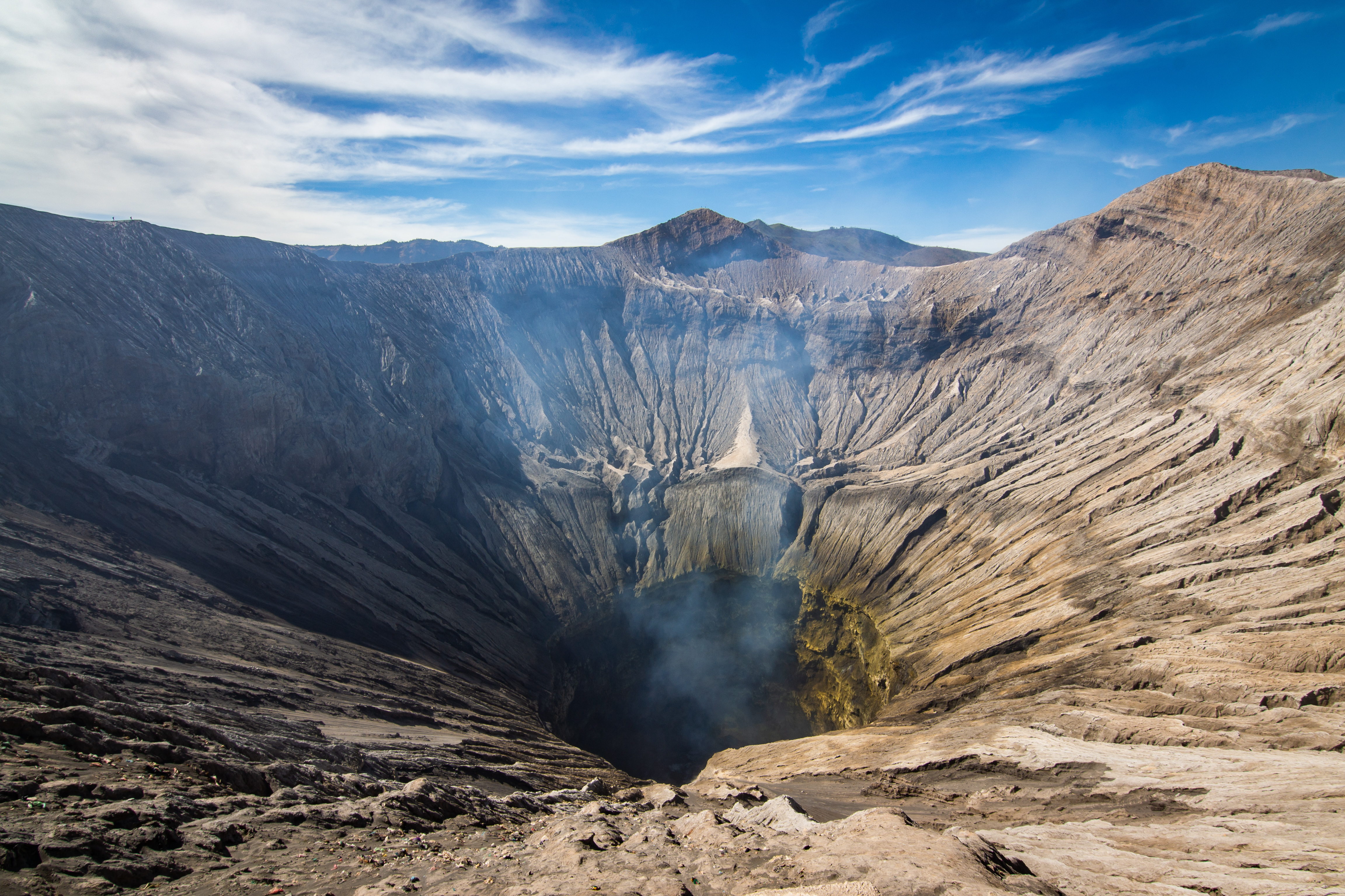 La montée jusqu’au cratère est dure, surtout après le trek effectué pendant la nuit. Mais la vue en haut est impressionnante, ainsi que le bruit. On a devant nous un énorme cratère dont des fumées s’échappent et un bruit constant qui vient vraiment des entrailles de la terre! Antoine décide de s’aventurer sur les bords du cratère et souhaite en faire le tour mais nous, nous préférons rentrer se reposer dans notre chambre. On descende et on négocie le prix des motos pour rentrer plus rapidement. A l’hostel, on essaie tant bien que mal de frotter nos vêtements recouverts de poussière!
