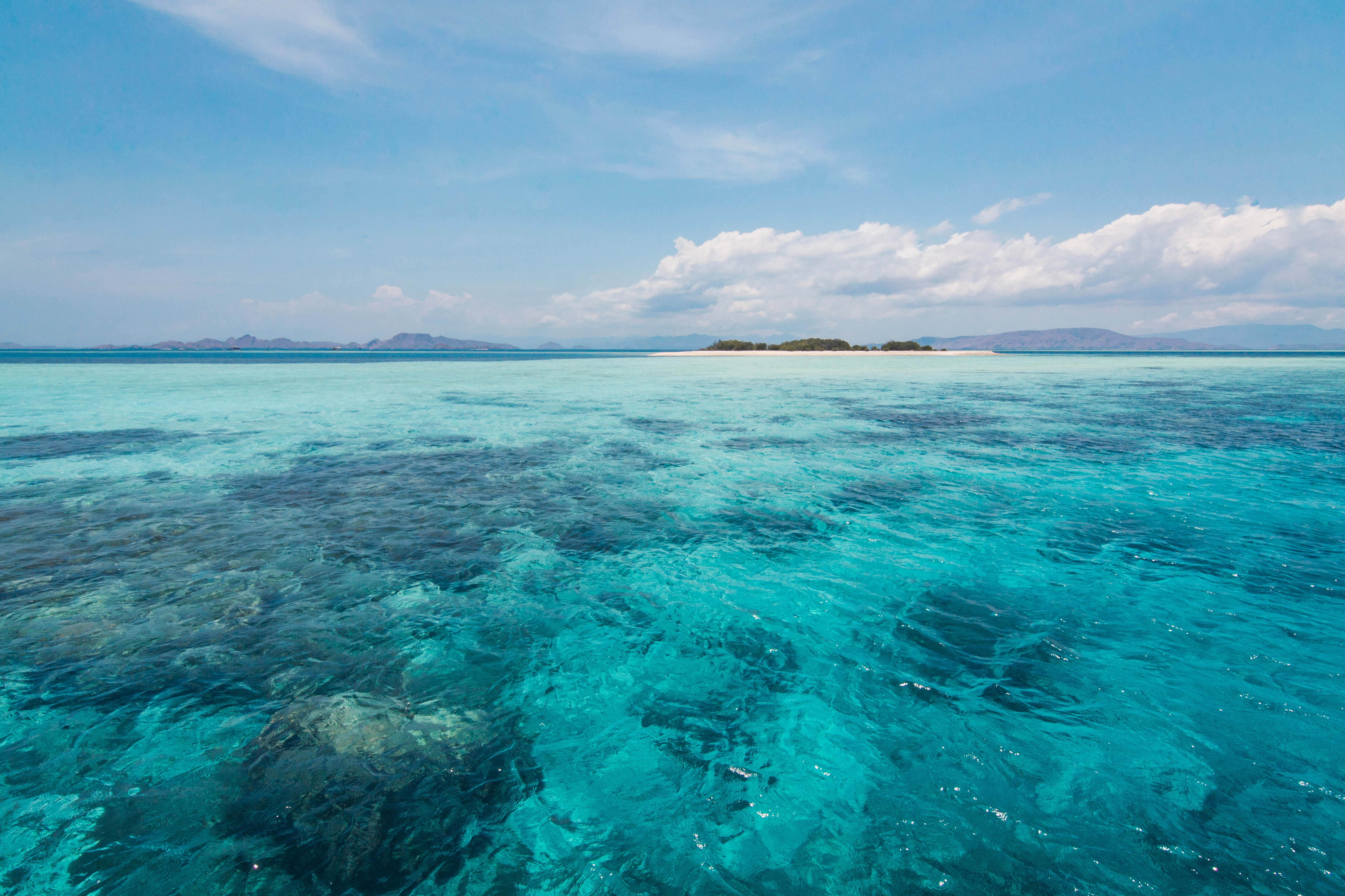 Banc de sable et snorkeling Eau cristalline dans le parc national de Komodo. Banc de sable à l’horizon