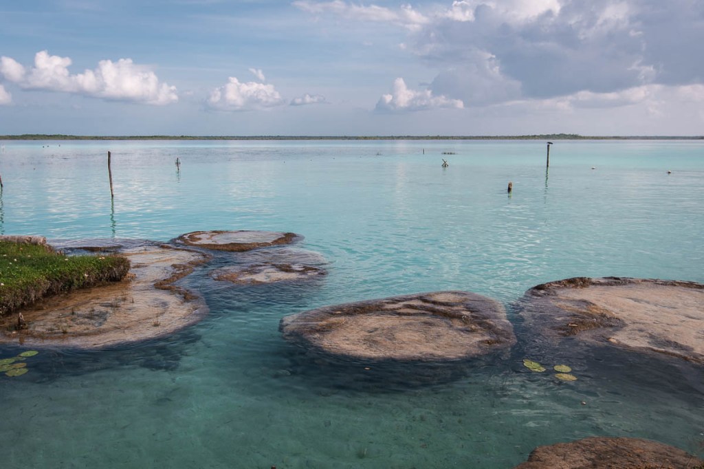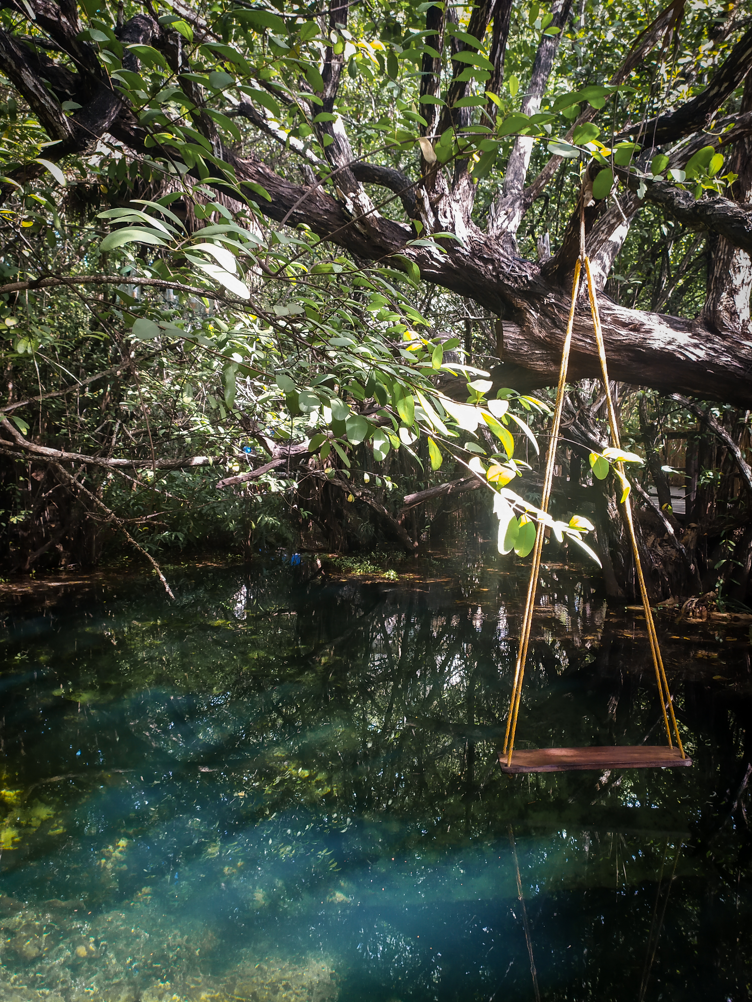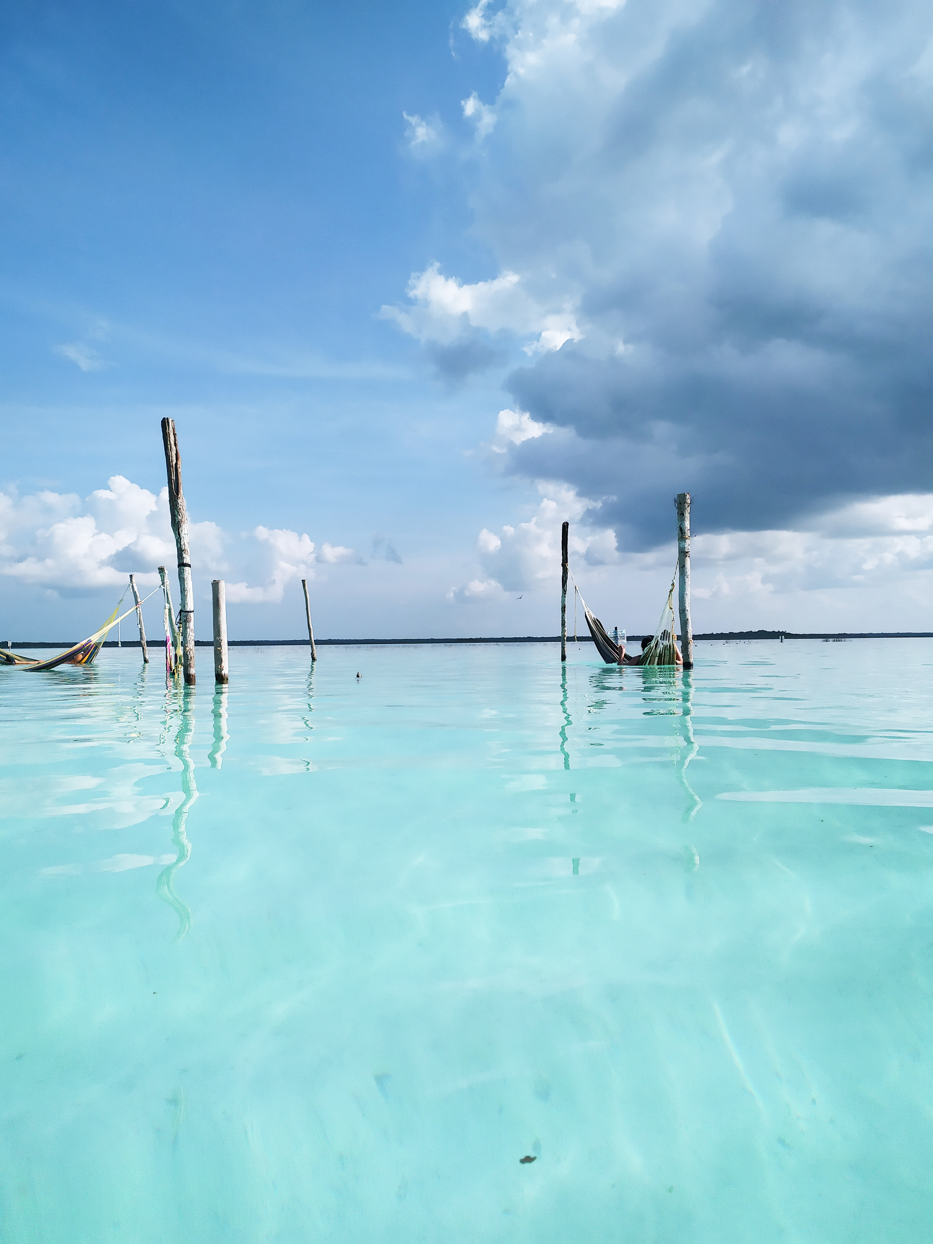 Après la baignade, je fais papote avec une française qui me donne rdv un peu plus tard à La Playita pour prendre un verre. L’endroit est cosy et très il a son propre accès à la lagune. Ensuite, je reprends mon vélo pour le cenote Cocalitos, un cenote rempli de stromatolites (structure laminaire souvent calcaire qui se développe en milieu aquatique peu profond, marin ou d’eau douce continentale #Wikipedia). Il y a aussi des hamacs et des balançoires, de quoi profiter de l’eau turquoise. Mais 1h plus tard, c’est la drache nationale, on s’abrite mais la pluie nous atteint de tous les côtés.