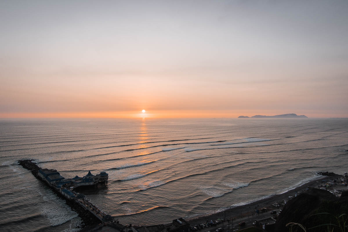 Le lendemain, je mange avec Alex et Augustin que j’avais rencontré en échange ici et qui travaillent maintenant au Pérou ! Le temps est fou à Lima, il fait grand soleil, c’est du jamais vu! J’en profite pour assister au coucher de soleil depuis le haut des falaises.