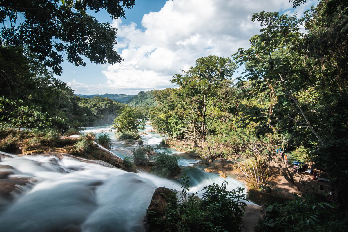 On roule ensuite encore 1h avant d’arriver à Agua Azul, un ensemble de cascades qui ressemble fort à Roberto Barrios mais en beaucoup plus grand et avec plus de courant. Je marche jusqu’à un bassin en amont de la cascade principale et je m’y baigne. Mais l’eau est très froide et le soleil n’est pas fort présent. Zoe et Sheima, l’hollandaise, me rejoigne. A un moment je me laisse guider par le courant et puis je m’en éloigne. Zoe fait de même mais se fait emporter vers le centre de la rivière et je lui dis de faire attention car il y a une petite cascade, pas très haute, mais il y a des rochers en bas. Elle parvient à agripper à l’îlot et on vient l’aider à sortir de l’eau. Que d’aventures!