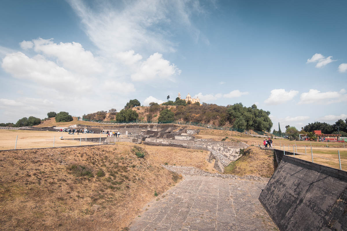 Samedi matin, les allemands de mon auberge se rendent à Cholula, une ville à quelques kilomètres de là. C’était, avant l’arrivée des espagnols, la ville la plus importante de la région. C’est là que se trouve la plus grande pyramide du monde (pas la plus haute mais la plus grande en superficie). Mais elle n’est pas facile à distinguer, on dirait plutôt une colline qu’une pyramide. La preuve, les espagnols ne s’en sont pas rendu compte de suite et on construit une église par dessus. On grimpe jusqu’à l’église. De là on a une vue sur la ville et au loin on aperçoit deux volcans: le volcan Popocatepetl (qui est entré en éruption quelques jours plus tard) et le volcan Iztaccihuatl.