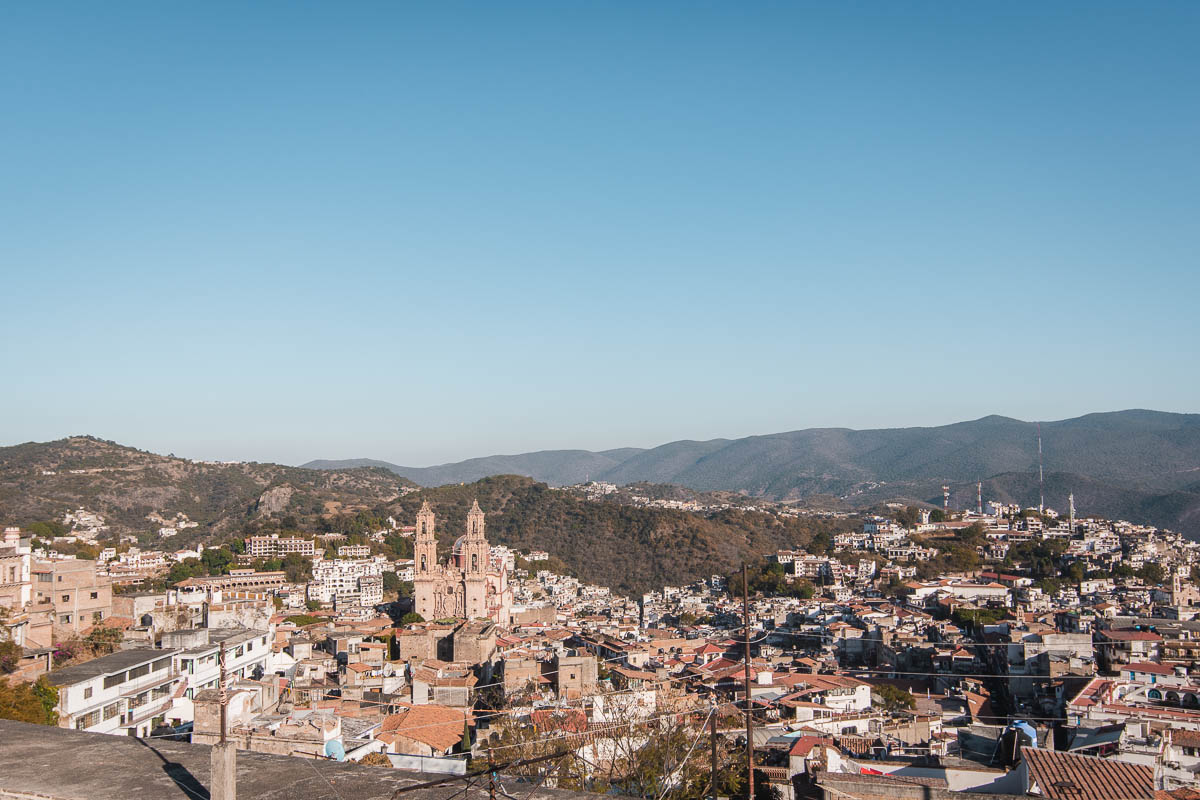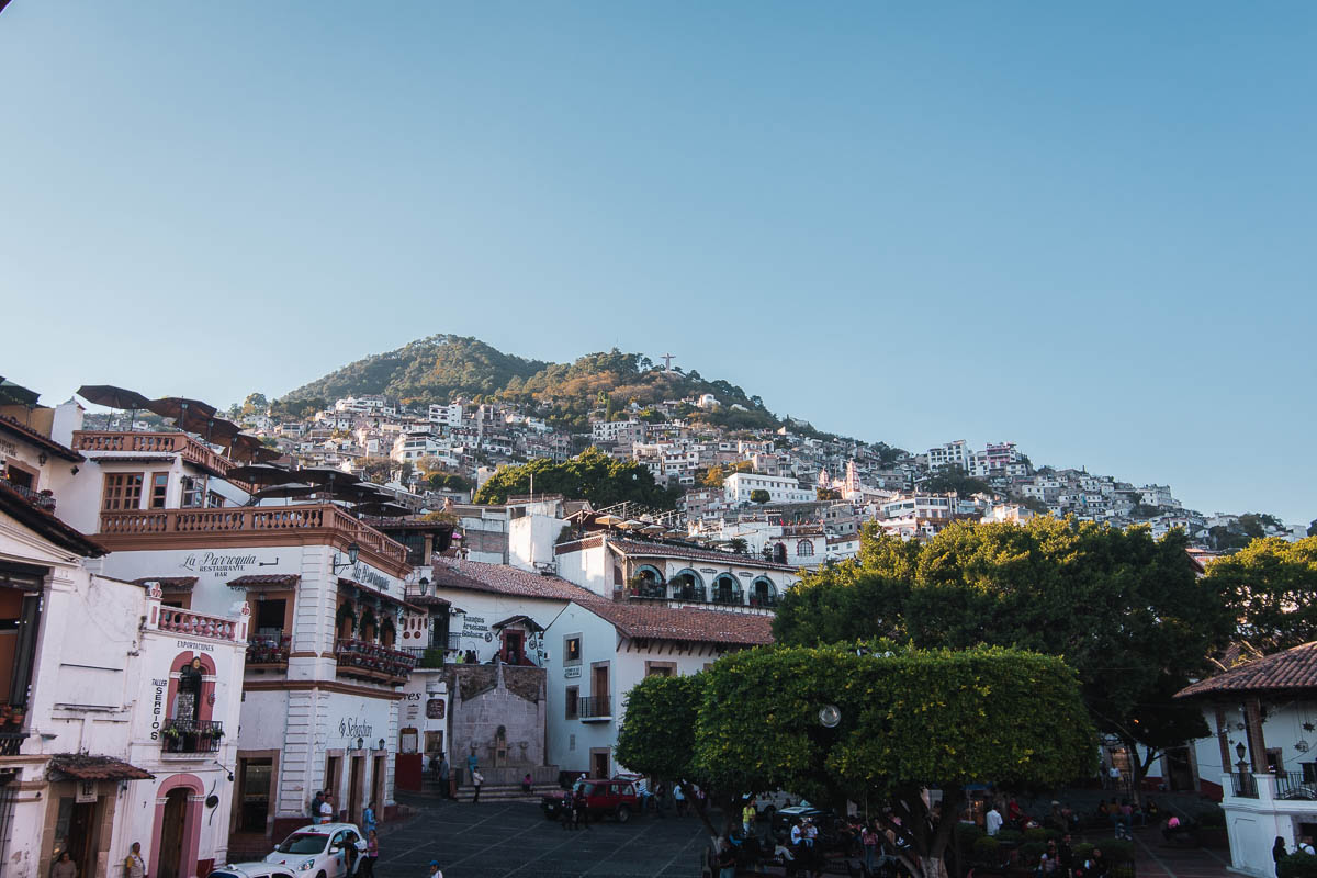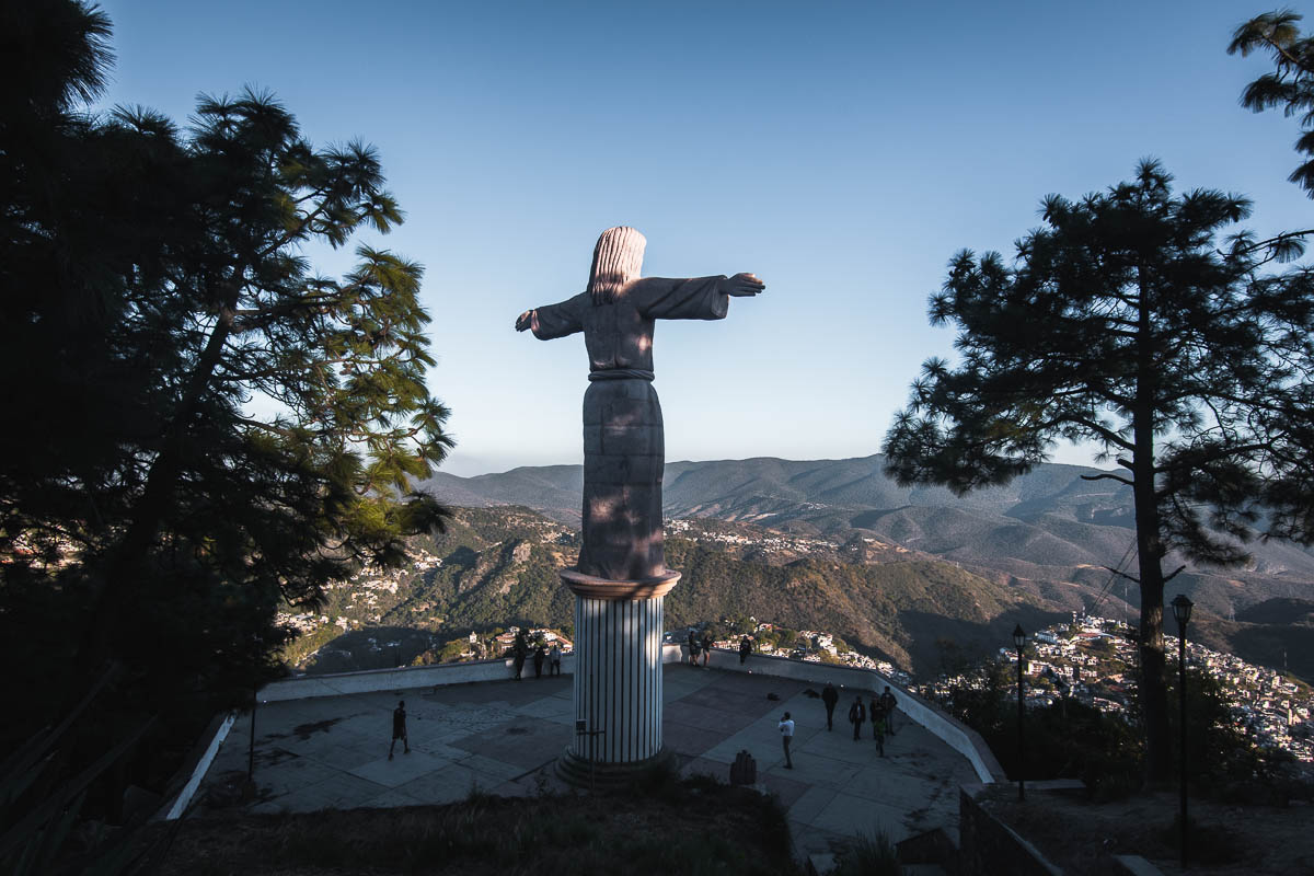 Mercredi, je prends un bus le matin pour Cuernavaca et de là un autre bus pour Taxco, une ville perchée à 1700m d’altitude. La ville s’étale sur la montagne et toutes les rues grimpent sans cesse. J’arrive en fin d’après midi et je vais toute de suite au point le plus haut de la ville: un christ qui surplombe Taxco. Pour y arriver, ce n’est qu’un enchaînement de rues pentues et d’escaliers. Pour la dernière partie, un taxi me dit qu’il va récupérer des clients au sommet et qu’il peut m’y amener gratuitement. Ici la plupart des taxis sont des coccinelles blanches, donc je ne dis pas non ! Bref j’arrive un peu moins fatiguée au sommet et j’admire le coucher de soleil.
