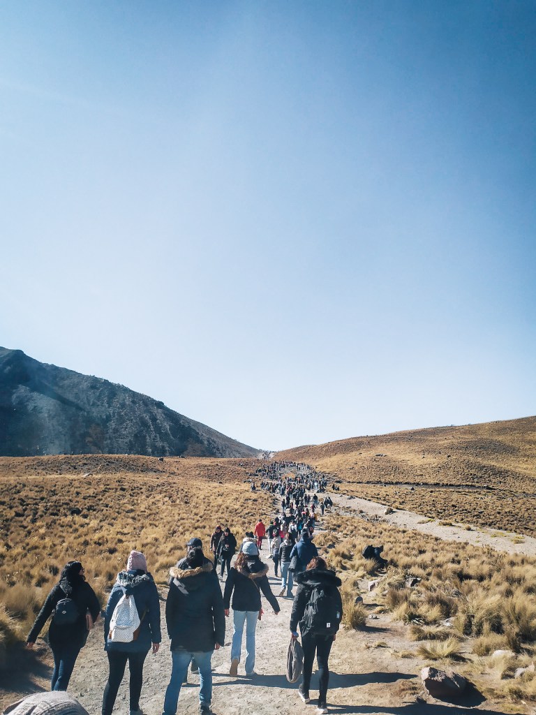 Je fais ensuite quelques courses pour mon souper et mon lunch du lendemain. Je ne traîne pas et file tôt au lit car une longue journée m’attend. Samedi matin je me lève à 6h30 pour prendre le premier bus de 7h20 pour Raisces. Le bus me dépose au début de la route qui monte jusqu’au volcan. De là, je fais du stop pour aller jusqu’au premier parking. On est samedi, il est à peine 8h du matin et il y a file interminable de voitures. Une famille mexicaine qui a un stand de nourriture plus haut s’arrête et m’amène jusqu’au parking. De là, je peux soit marcher 4h (7km mais le dénivelé ne rigole pas), soit prendre une camioneta (sorte de pick up qu’ils remplissent avec une quinzaine de personnes). Il est facile de deviner mon choix… Je fais donc la file (ca m’apprendra à visiter quelque chose un samedi) et un peu plus tard, j’embarque dans une voiture pour 25 minutes de trajet. On est déposé au dernier parking, à plus de 4000 mètres d’altitudes. La file pour les toilettes est super longue, je passe mon tour et je commence à grimper le dernier kilomètre qui mène au bord du cratère. Ce n’est pas très long mais l’altitude rend les choses difficiles.