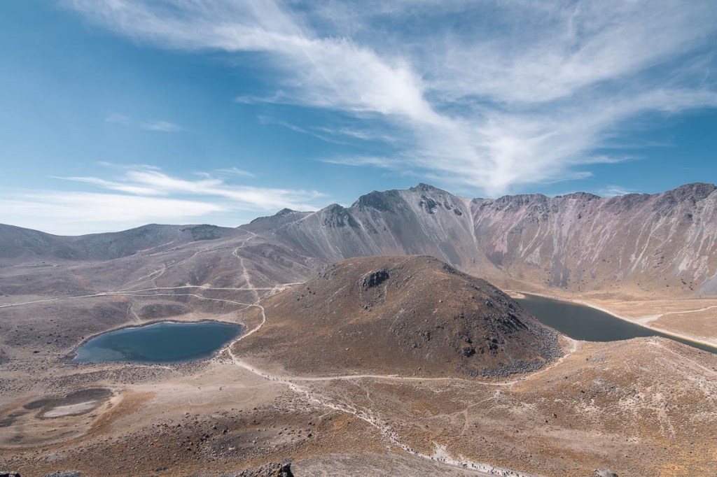 Une fois arrivé, j’essaie d’admirer la vue malgré les dizaines (centaines) de mexicains. Je décide de grimper un peu plus (vers le deuxième sommet le plus haut mais je n’irai pas jusqu’au bout, seulement jusqu’à 4360m) et cela vaut la peine. De la haut, j’aperçois bien les deux lacs (celui de la lune à gauche et du soleil à droite).
