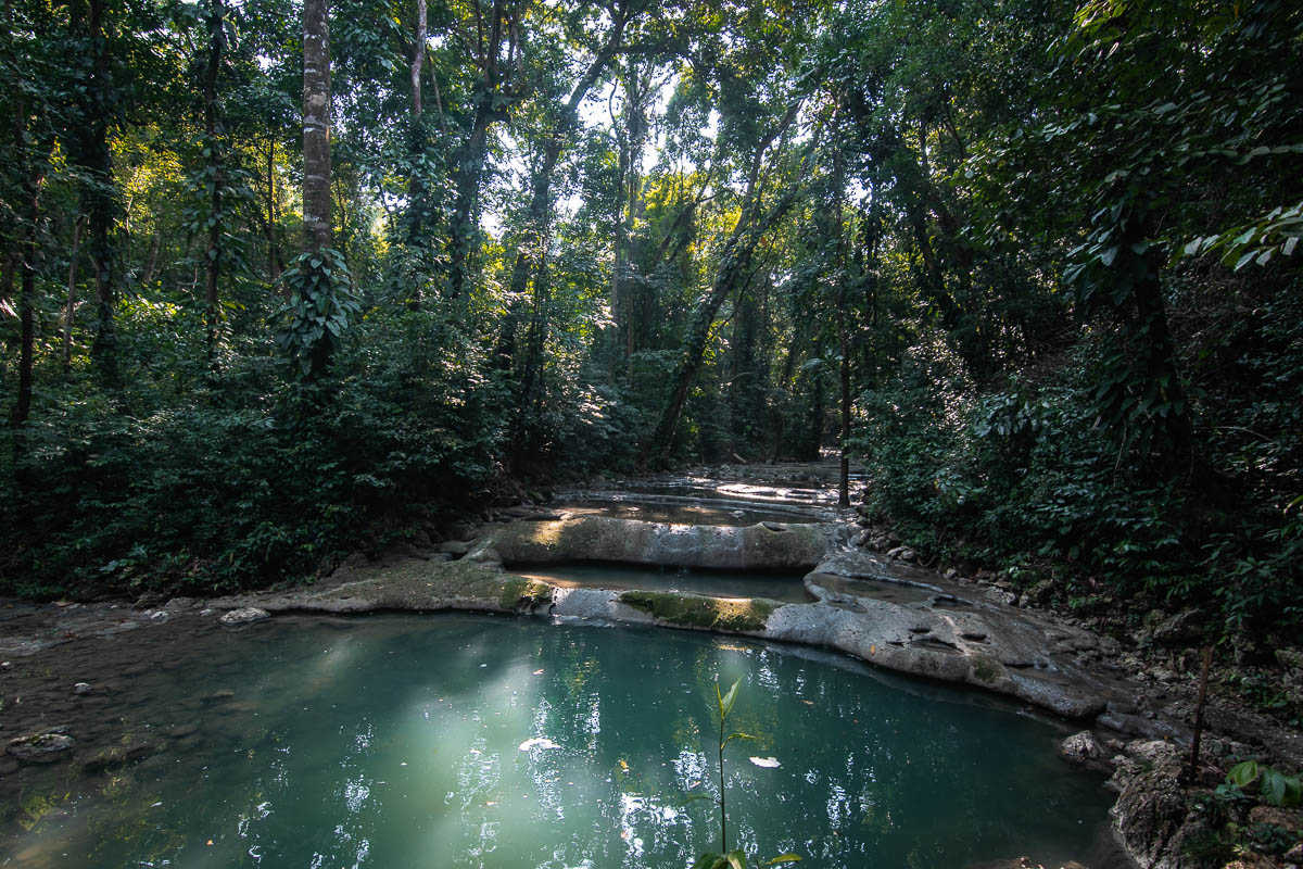 Mercredi, on marche 1h-1h30 jusqu’à un lieu de culte maya, Los Siete Altares, un ensemble de bassins. On traverse d’abord le village et ensuite on longe la plage. Au passage, on dîne avec vue sur mer. Vers 14h30, on arrive enfin et a tout le plus grand bassin juste pour nous seules! On nage, l’eau est fraîche, cela fait du bien ! De retour à Livingston, on prend l’apéro et puis on mange au bord de l’eau.