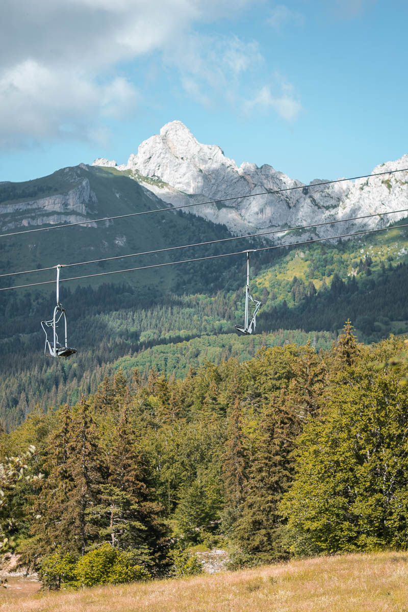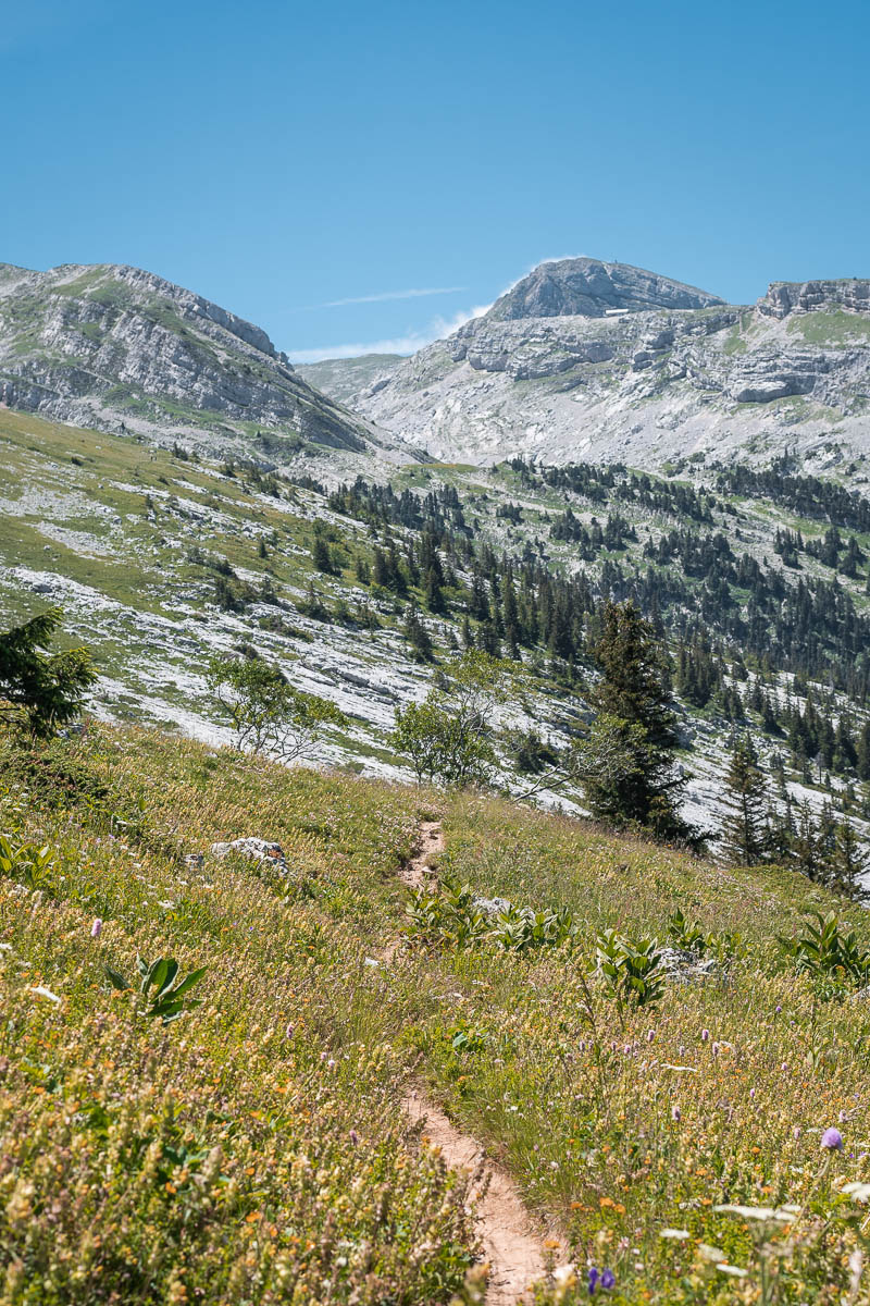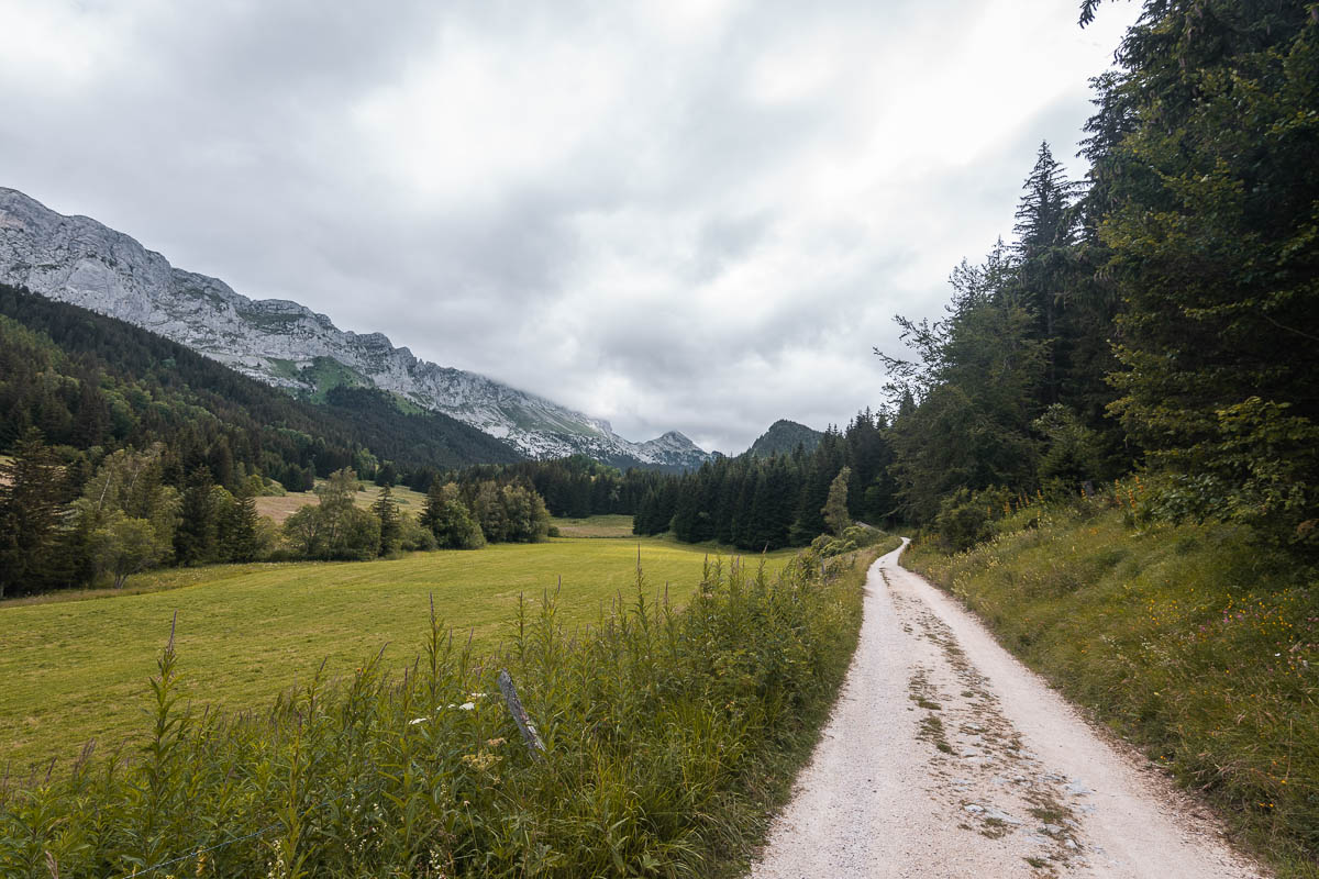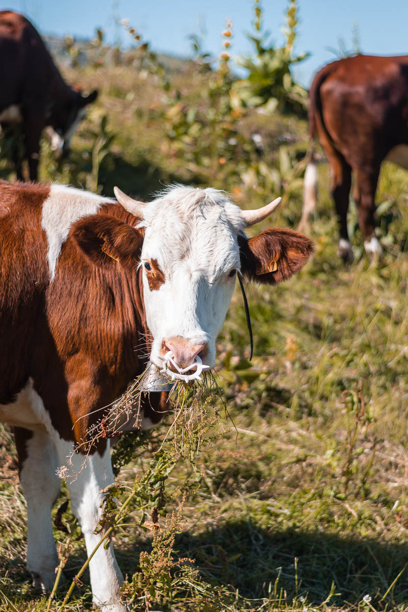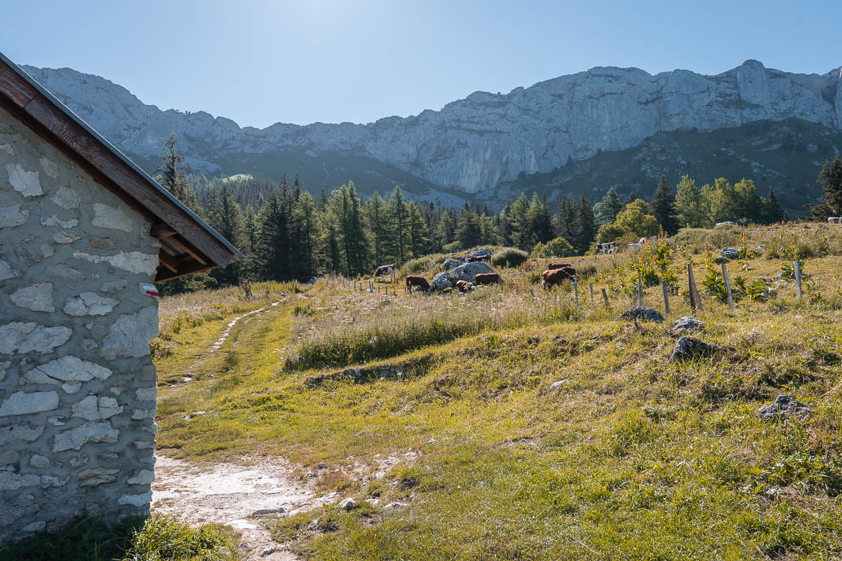 Mardi matin, après un déjeuner avec vue, je gare ma voiture au parking du départ de la randonnée. Il est 8h45, il n’y a pas encore grand monde. L’objectif d’aujourd’hui est le col Vert, à 1766m. Le début du chemin est le même que la veille, mais ensuite je vire vers la gauche, je traverse une prairie et puis j’entre dans la forêt. Là, à deux reprises, je vois un énorme lièvre détaler devant moi. Il était vraiment grand! Ça grimpe un peu mais pas encore trop. J’arrive ensuite sur un plateau et je fais une pause à un refuge, près des vaches. Avec leur cloche autour du coup, elles en font du bruit !
