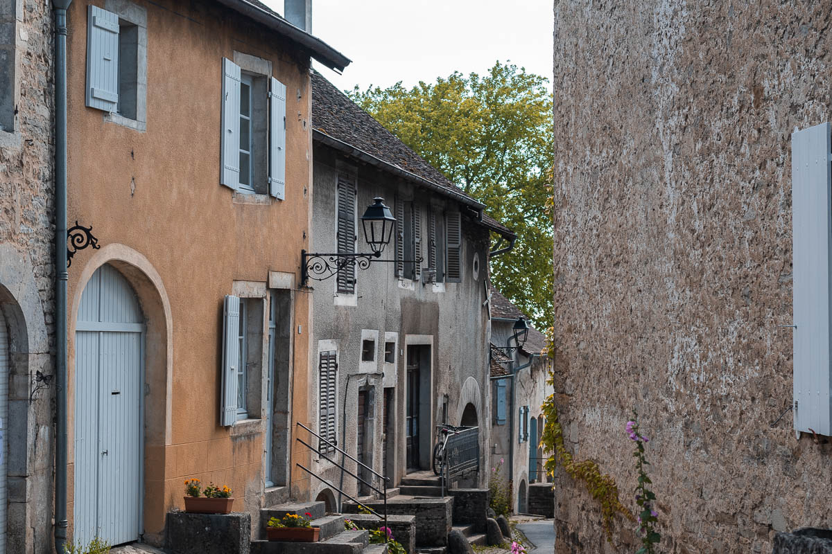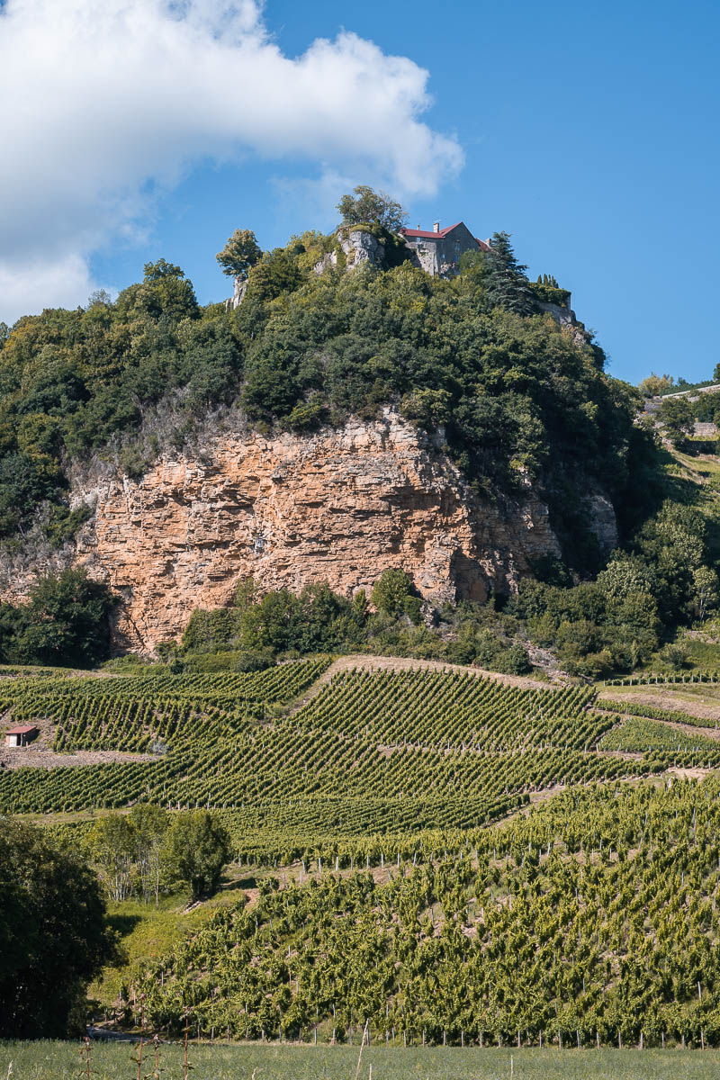 Dimanche 05 juillet, je pars assez tôt car j’ai quelques heures de routes devant moi. Un petit arrêt au Luxembourg pour faire le plein, un arrêt pique-nique un peu plus loin et peu à peu le paysage se transforme et l’arrivée des vignes m’indique que je suis près d’un de mes premiers spots: Château-Chalon. Connu pour son Vin Jaune, ce village est perché sur une falaise et est classé parmi les plus beaux de France. Outre de charmantes ruelles, il offre de très belles vues sur les vignobles alentours. Un dimanche en fin de journée, il y a un peu de monde, donc je fais vite le tour après m’être parquée. Ensuite je descends et fais quelques photos en dessous du village.