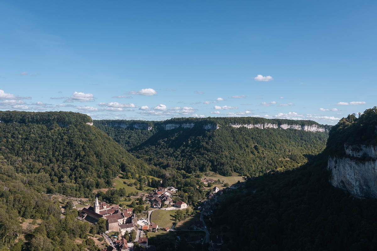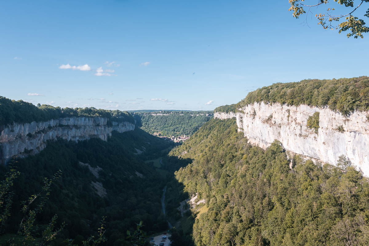 Je reprends la voiture et roule quelques minutes jusqu’à mon prochain spot, le village de Baume les Messieurs perdu au milieu de trois reculées assez impressionnantes. Je roule en direction d’un premier point de vue avant d’aller à un autre.
