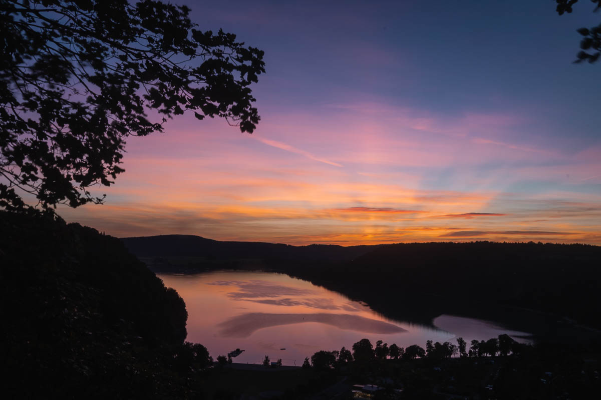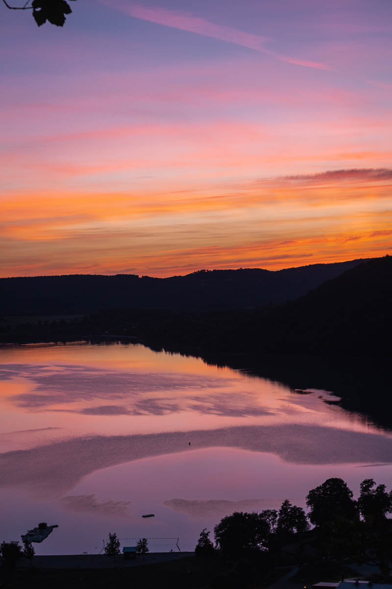 Je comptais marcher jusqu’à la cascade de Tufs mais je me rends compte que je dois descendre au pied des falaises (et puis remonter) et le courage n’est pas avec moi. Je pourrais rouler jusque là mais c’est un très long détour donc je me dis que je repasserai le lendemain matin. Je me dirige donc vers le dernier spot pour la journée, le lac Chalain. J’avais repéré sur l’appli Park4night, un parking tout près d’un point de vue mais une fois sur place, l’endroit ne me plait pas. J’apprécie quand même la vue mais je reprends la route pour aller à un autre endroit.
