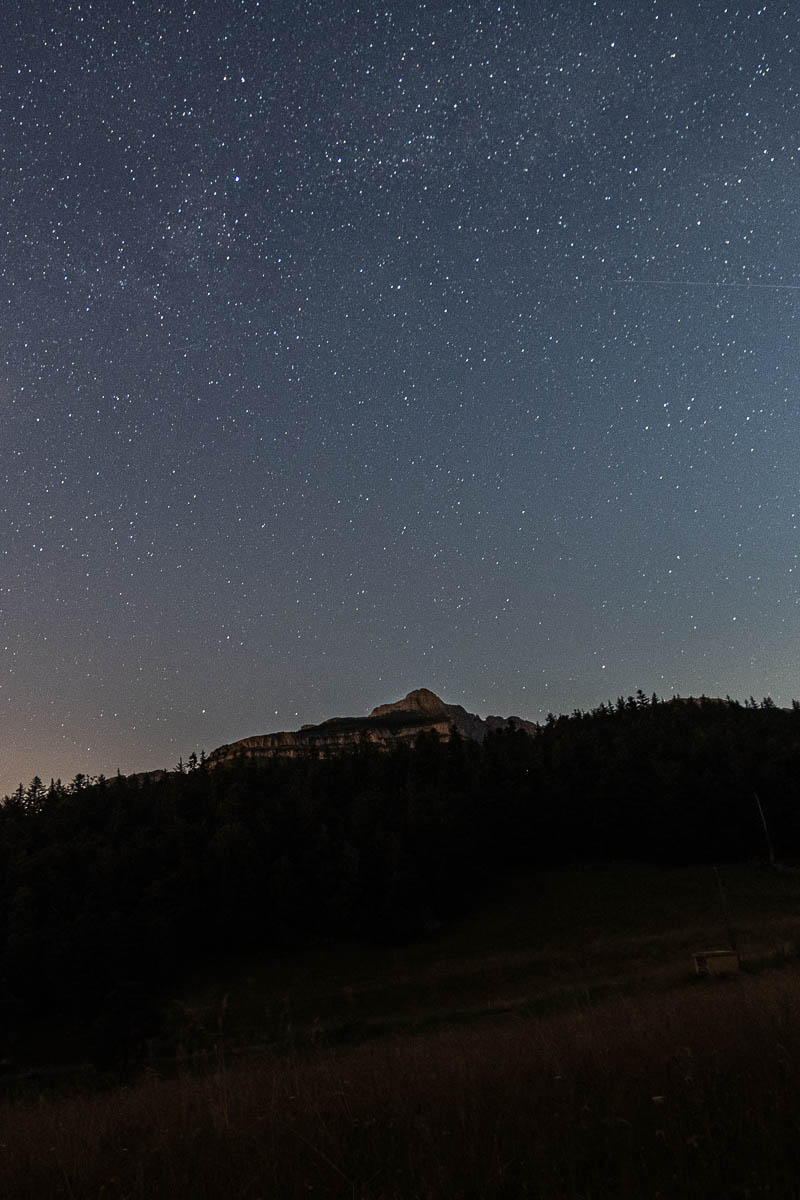 Une fois de retour au parking, je parque ma voiture quelques centaines de mètres plus loin, au bout d’un petit chemin. De là j’ai une vue magnifique sur toute la chaîne de montagnes. Je mange en profitant du coucher du soleil et puis je fais quelques photos des étoiles.