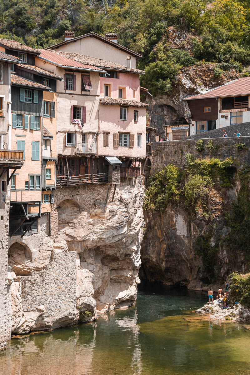 Le lendemain, la pluie me réveille, moi qui comptais descendre jusqu’au lac et puis passer à la cascade, c’est compromis. Je décide donc de tout de suite rouler en direction du sud, vers le massif du Vercors. Les petites routes s’enchaînent (j’ai programmé mon gps pour éviter les péages) et vers 13h, j’arrive à Pont-en-Royans, un village situé à l’entrée du massif du Vercors, connu pour ses maisons de couleurs suspendues. Je fais un tour du village, je lunch au bord de la rivière et puis je continue et je m’enfonce dans le massif.