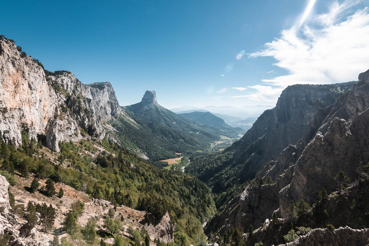 Après une belle nuit sous les étoiles, je me réveille assez tôt (il manque des rideaux dans cette voiture…) et donc à 8h15, je suis déjà en route pour la randonnée jusqu’au Pas de l’Aiguille. Il existe plusieurs randonnées qui font le tour du mont Aiguille ou qui traverse le plateau du Vercors mais mes jambes commencent à souffrir. Je décide donc de juste monter jusqu’au Pas et puis de redescendre. Enfin « juste » monter, c’est un dénivelé de 400 mètres. Heureusement petit à petit, la vue sur le mont Aiguille se dévoile et j’en prends plein les yeux.