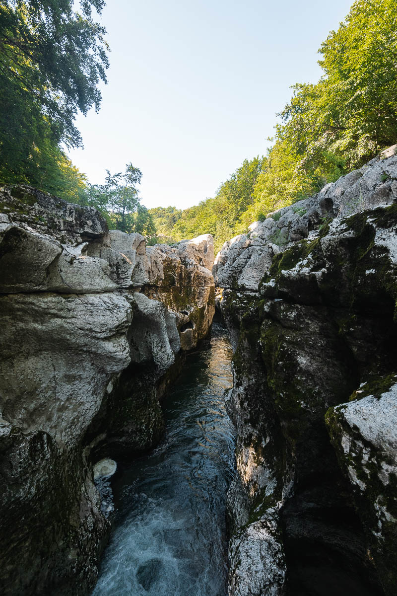 Samedi matin, je me réveille sous un ciel fort nuageux. Je commence la journée par monter (en voiture, pas en vélo comme les nombreux cyclistes que je croise) le col du grand colombier. En haut, la vue n’est pas très dégagée donc je redescends assez vite. Je fais le plein dans la vallée et puis je continue vers le Jura et je m’arrête aux pertes de la Valserine. La rivière a creusé la roche et a crée toutes sortes de formes. Je m’amuse à escalader les rochers (en faisant attention de ne pas tomber).