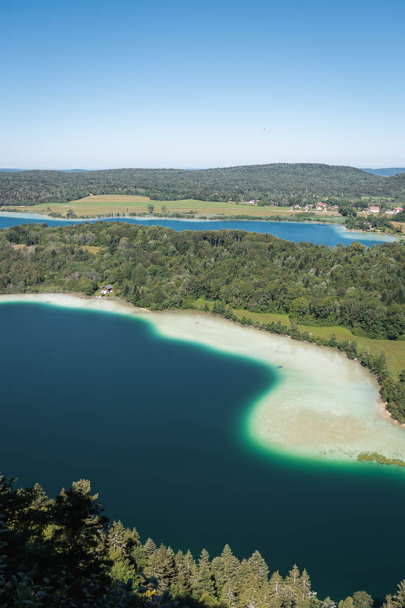 Je passe par la ville de St Claude qui a l’air d’être assez jolie mais on est samedi, il y a du monde et donc je ne fais que traverser la ville. Je voulais m’arrêter un peu au nord, aux gorges de l’abîme mais les parkings sont fulls, je n’ai pas envie de me garer loin et de tout marcher (je n’ai plus du tout envie de marcher en fait 😀 ). Du coup je fais demi tour et je roule jusqu’au lac de Vouglans qui est tout bleu. D’abord je m’arrête à un point de vue sur le barrage et le lac et ensuite je continue vers un autre viewpoint.
