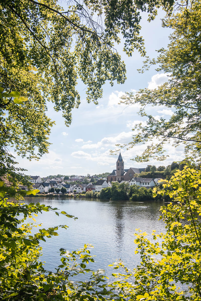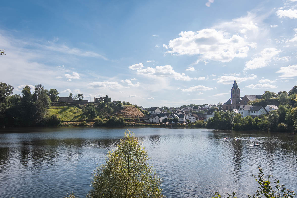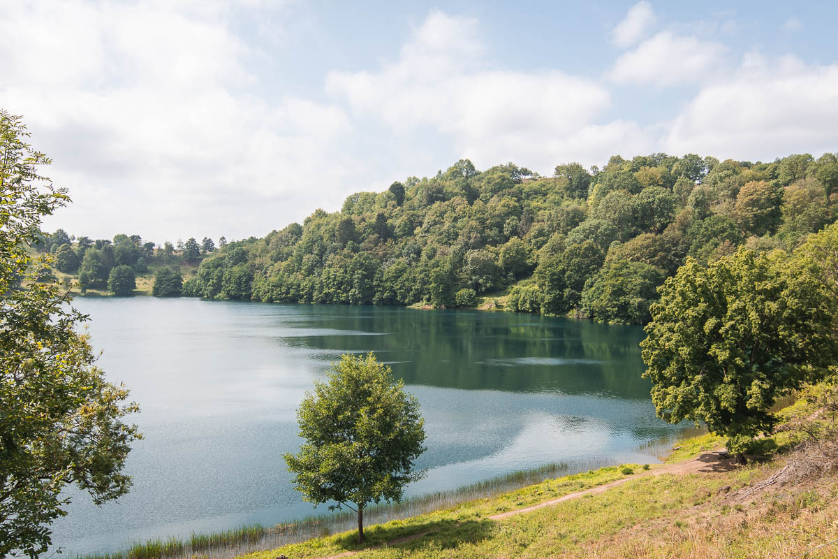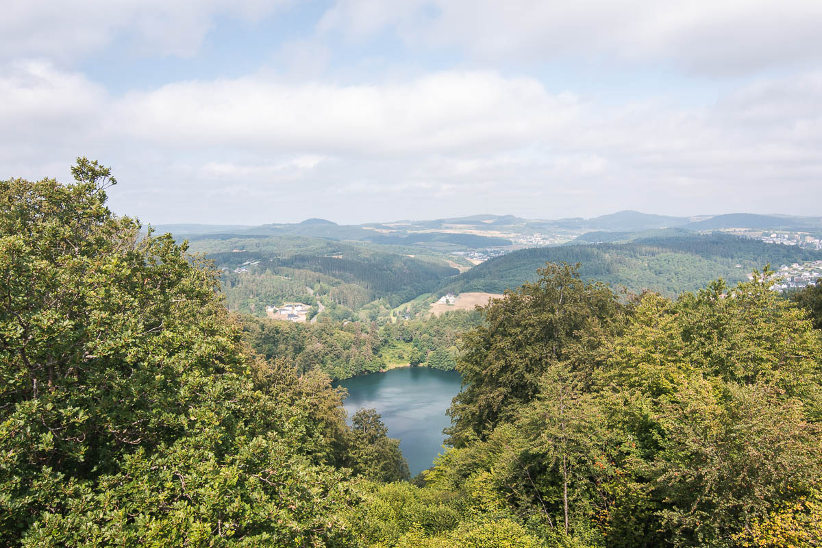 On continue vers Ulmener Maar, un lac dont on fait le tour à pied. Il est juste bordé par et les vestiges d’un château.
