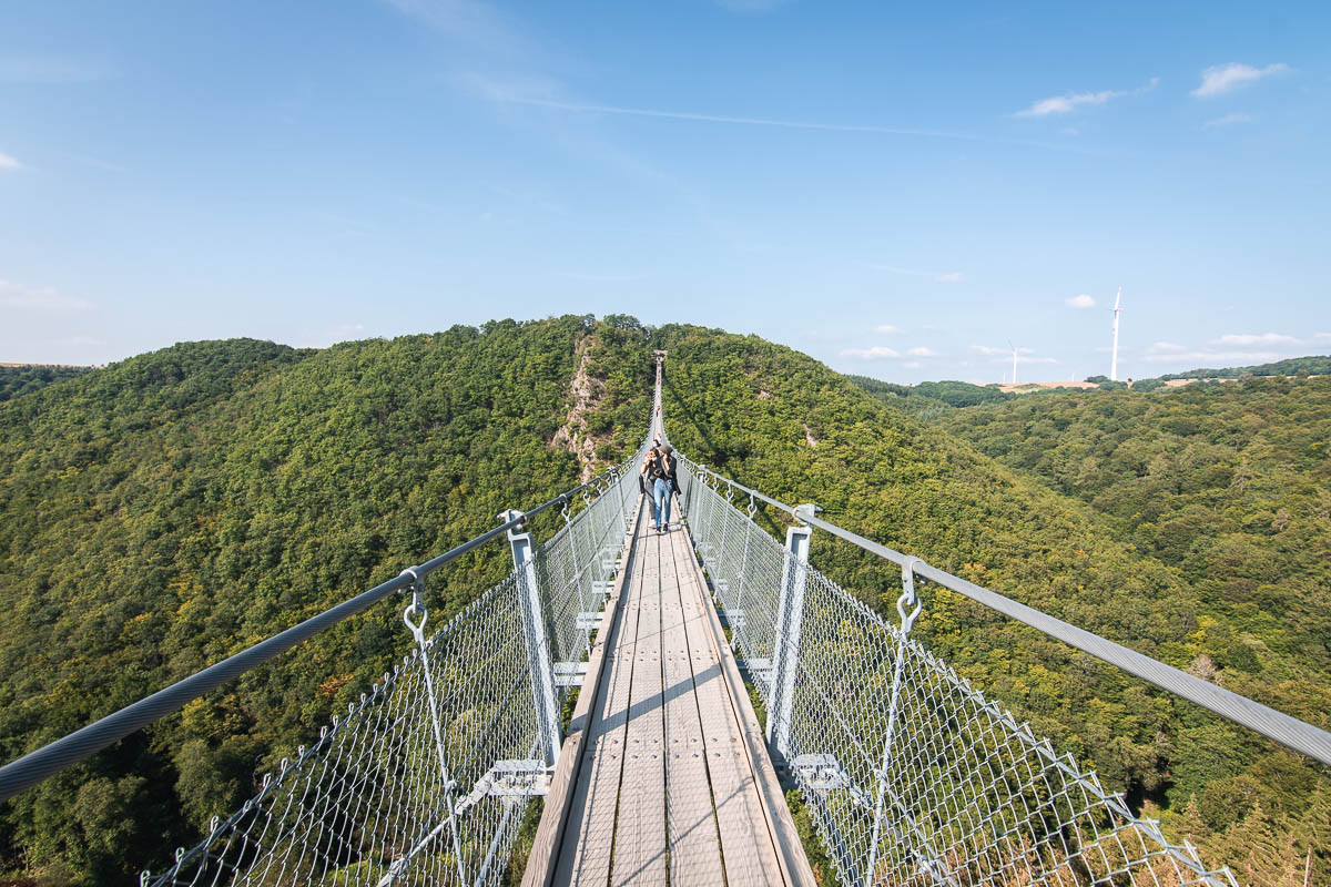 On roule ensuite vers un pont suspendu de 360 mètre de haut et de 100 mètres de long, le pont de Geierlay. On est en fin d’après midi mais les parkings sont remplis dans le village. On trouve malgré tout une place et on commence à marcher vers le pont. On voit plein de personnes marcher dans le sens inverse donc on se dit qu’il n’y aura plus grand monde mais une fois qu’on arrive près du pont, il y a une file. Vu la popularité du pont, ils ont installé un système pour éviter qu’il y ait trop de monde en une fois sur le pont et qu’on soit trop proches les uns des autres. Donc c’est masque obligatoire et on attend son tour. On traverse le long pont et une fois de l’autre coté, on attend qu’on puisse rentrer. Le pont est sympa mais avec une telle foule, il n’en vaut pas la peine !
