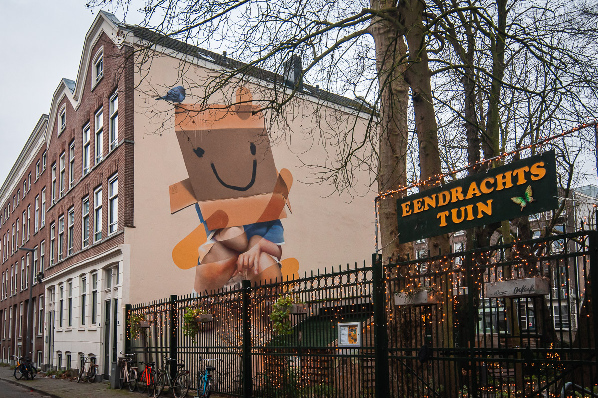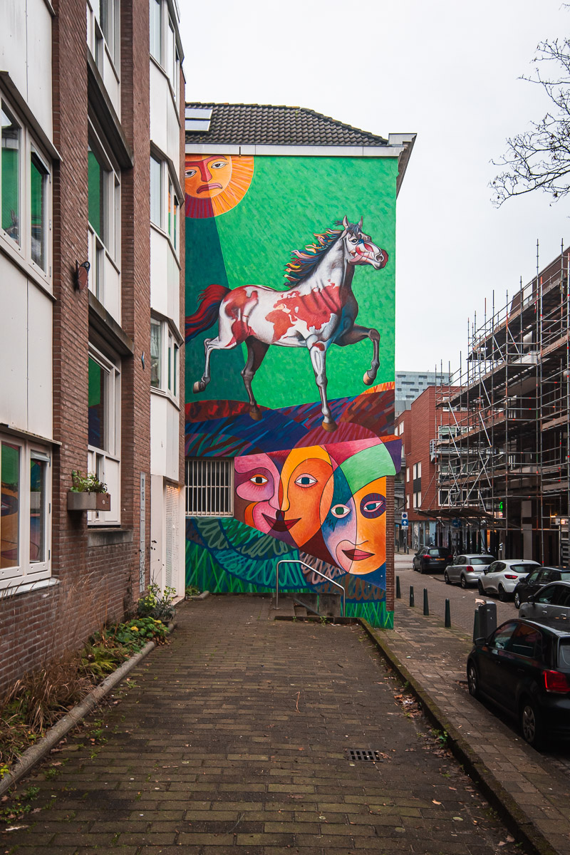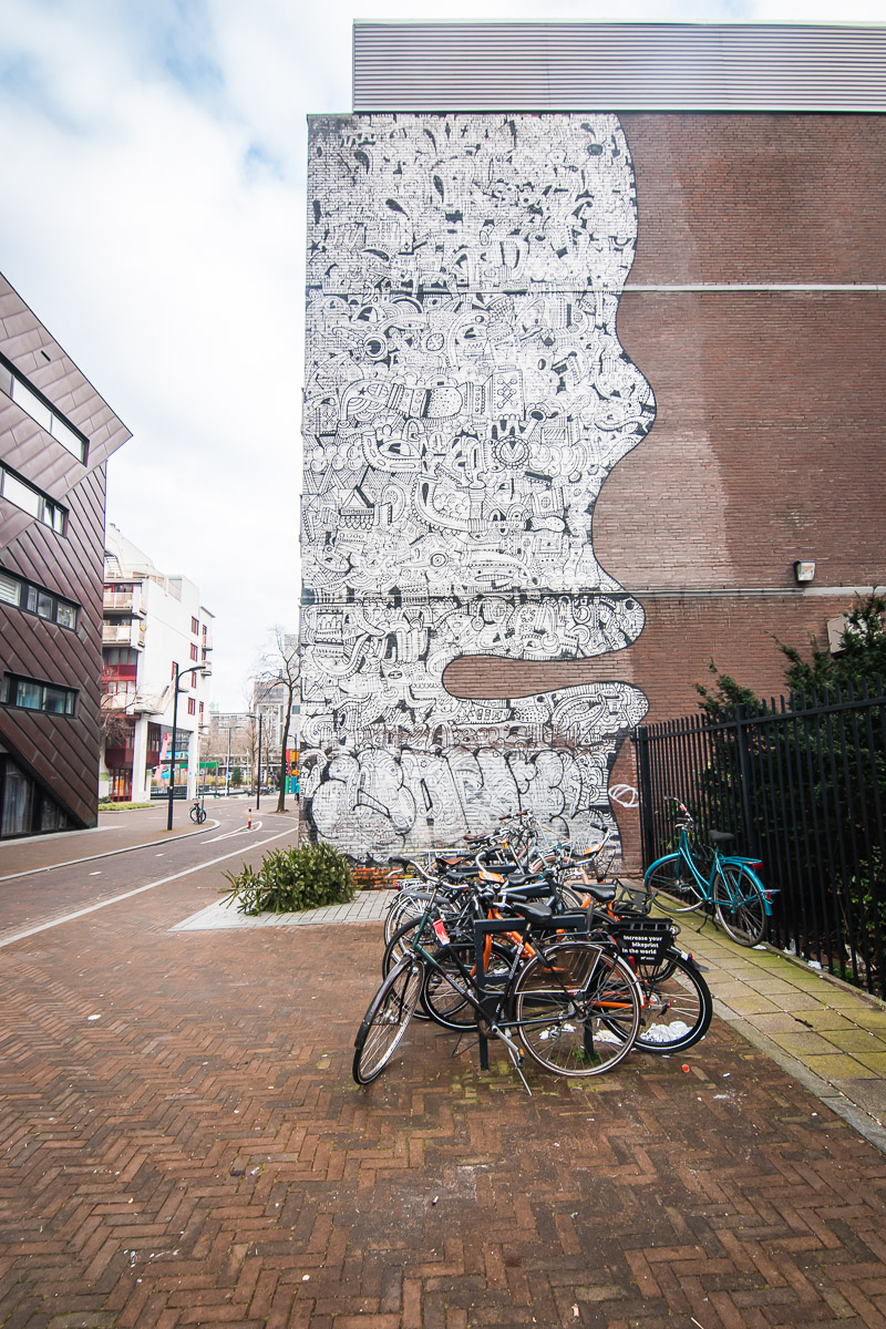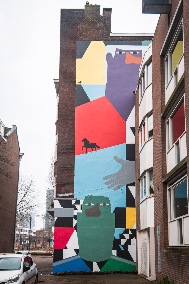 Le lendemain matin, je télécharge une application qui permet de découvrir le street art de Rotterdam. La ville a été fortement touchée par les bombardements lors de la Seconde Guerre Mondiale. La ville a décide de laisser ses architectes s’exprimer dans le design de bon nombre de batiments et permet aux artistes de s’exprimer sur les murs. L’application propose plusieurs parcours ainsi que des explications audio. C’est une chouette manière de découvrir la ville. Je fais donc un premier parcours près de mon auberge.