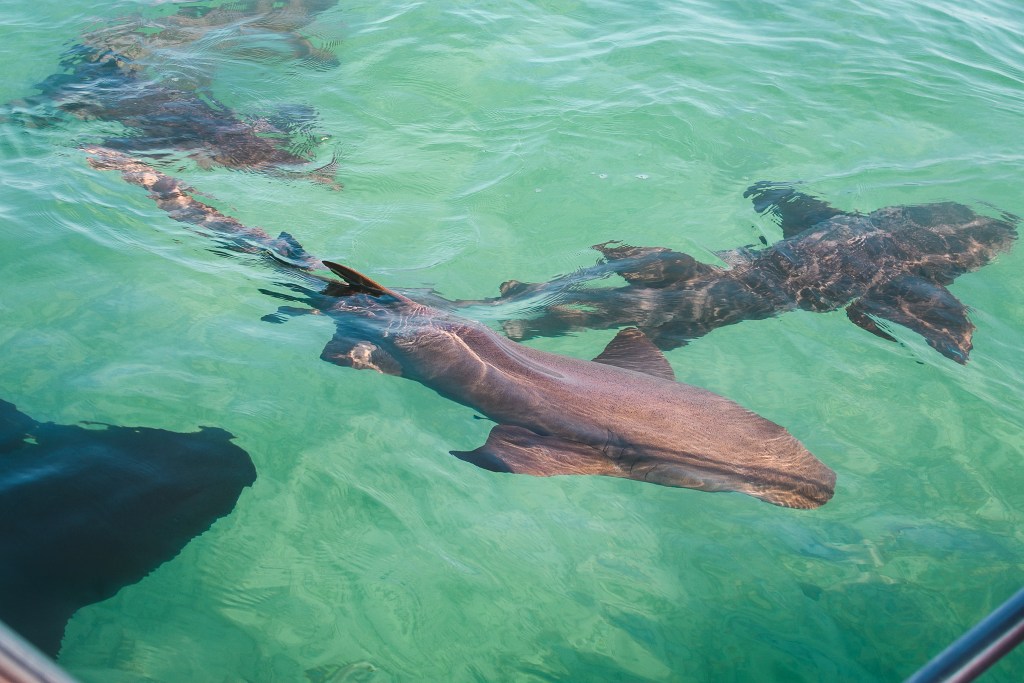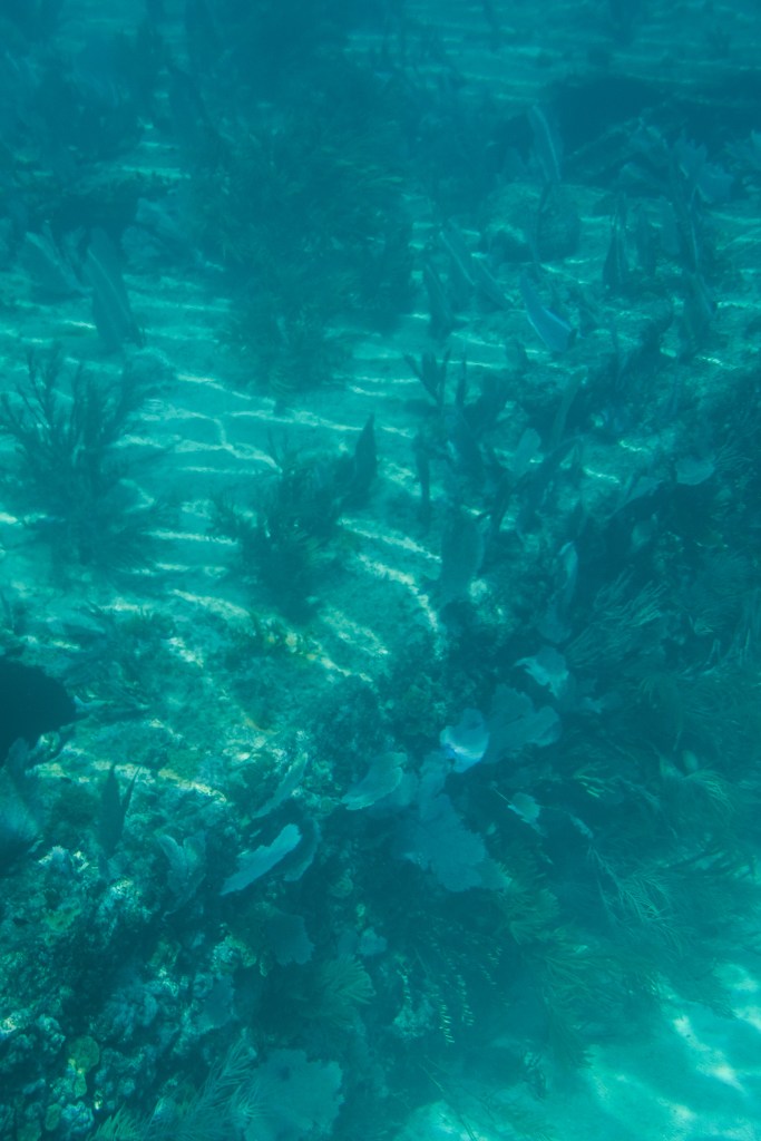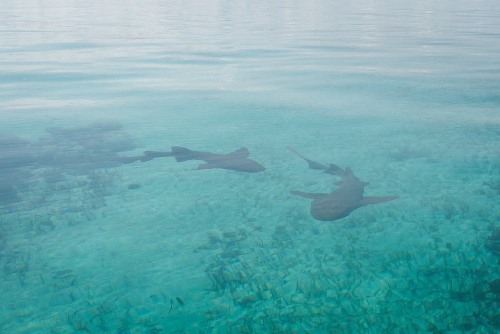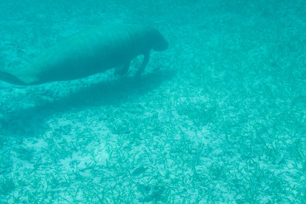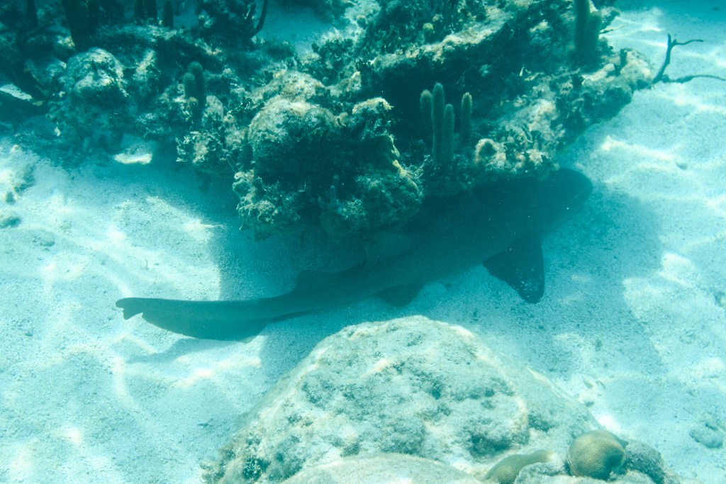 Le 11 novembre, on déjeune rapidement et puis on va au point de rendez vous pour commencer notre tour. On a de la chance, on sera seulement 7,5 sur le bateau: un couple de Belges venant de Liège et leur petite Charlie, un couple d’Autrichiens, notre guide et nous deux. Notre premier arrêt nous amène à la shark alley. Les requins nourrices reconnaissent le bruit du bateau et arrivent en nombre mais dès qu’ils remarquent qu’on ne leut donne pas de nourriture, ils s’en vont. On part nager à leur recherche mais la visibilité est très mauvaise du à la pluie des derniers jours. On aperçoit quand même des requins et des poissons mais pas aussi bien que l’on aimerait. La journée se poursuit, on fait du snorkeling au dessus près de Hol Chan (un passage dans la barrière de corail que les bateaux utilisent) où l’on voit une raie et son petit, une tortue et des poissons de toutes les couleurs. Ensuite on fait un petit tour au dessus d’une épave et puis on lunch au dessus de Coral Garden, en compagnie de requins venus nous rendre visite. En plongeant, le guide repère un lamentin que nous suivons aussi.