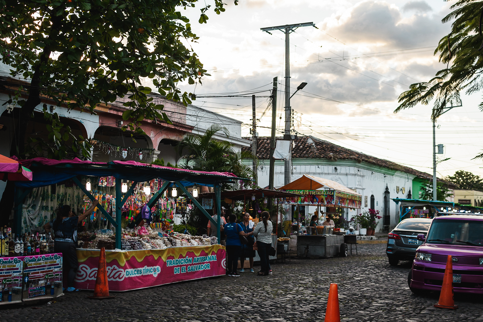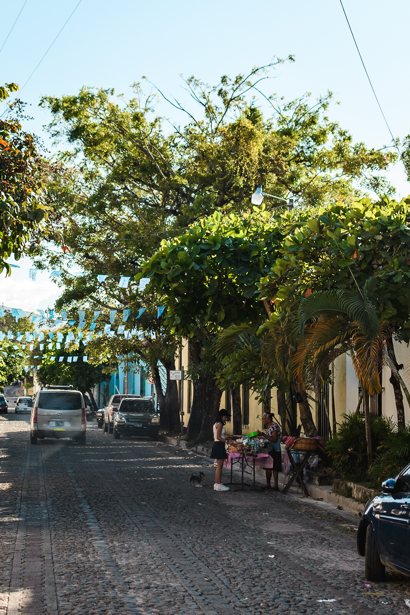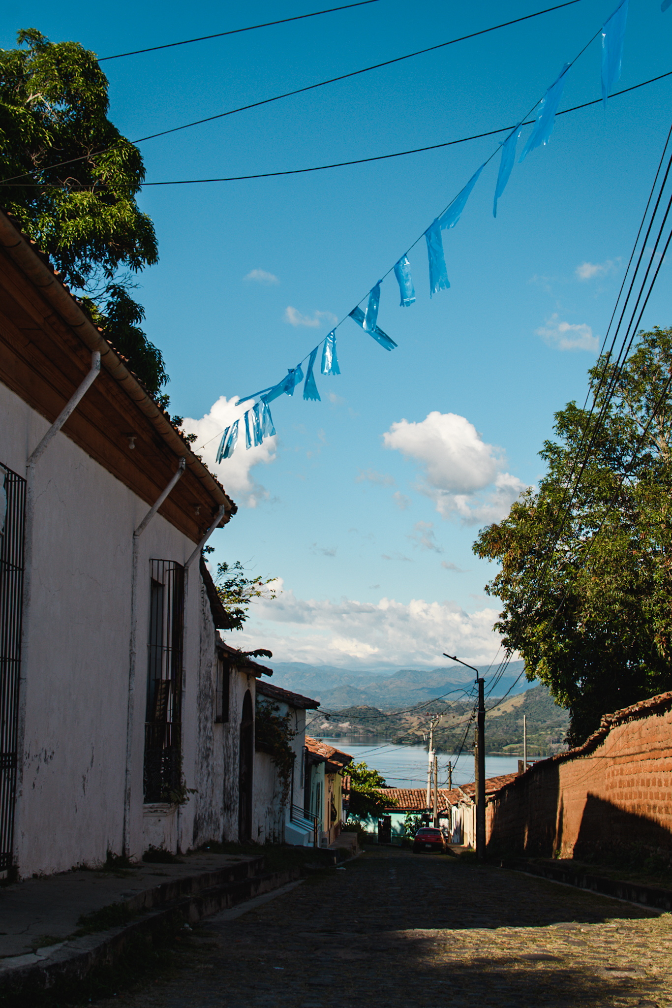Vendredi matin, il est temps de quitter notre villa renommée: United Nation Villa, de se dire au revoir et de reprendre la route. Certains vont au Nicaragua, d’autres restent encore un peu à la plage. De mon côté, je prends un bus vers la capitale, puis deux autres pour changer de terminal et un dernier qui m’amènera jusque Suchitoto. Les locaux font papote dans le bus, et s’étonnent quand je ne suis pas des US et que je parle espagnol. Je suis même invitée à passer le week-end chez l’un d’eux mais j’ai poliment refusé. Bref je débarque dans cette petite ville qui surplombe un lac artificiel. C’est une des premières villes du El Salvador. Les ruelles sont pavées et les maisons colorées. Tout est fort calme (il y a un match de foot en cours…) mais j’apprends vite qu’une fête se prépare et que ça va être la fête toute le week-end avec des feux d’artifices, des parades etc. J’ai hâte de voir ça même si je pense que je ne vais pas beaucoup dormir. En attendant, je me balade dans le village en fin d’après-midi. Je marche jusqu’à un point de vue sur le lac et je trouve ensuite un restaurant avec un beau pnorama. Je m’accorde une margarita et quelques frites, il faut bien profiter de cette jolie vue. Le soir je mange des pupusas en regardant l’agitation sur la place (il y a une foire, un défilé etc). Deux locaux s’installent à côté de moi car il manque de la place. Ils me disent: « tu ne viens pas d’ici toi ». Je leur montre la Belgique sur la carte et discute un peu mais leur espagnol n’est pas facile à comprendre. Je rentre à l’hôtel avant le début de la danse qui a l’air d’être l’attraction du week-end.