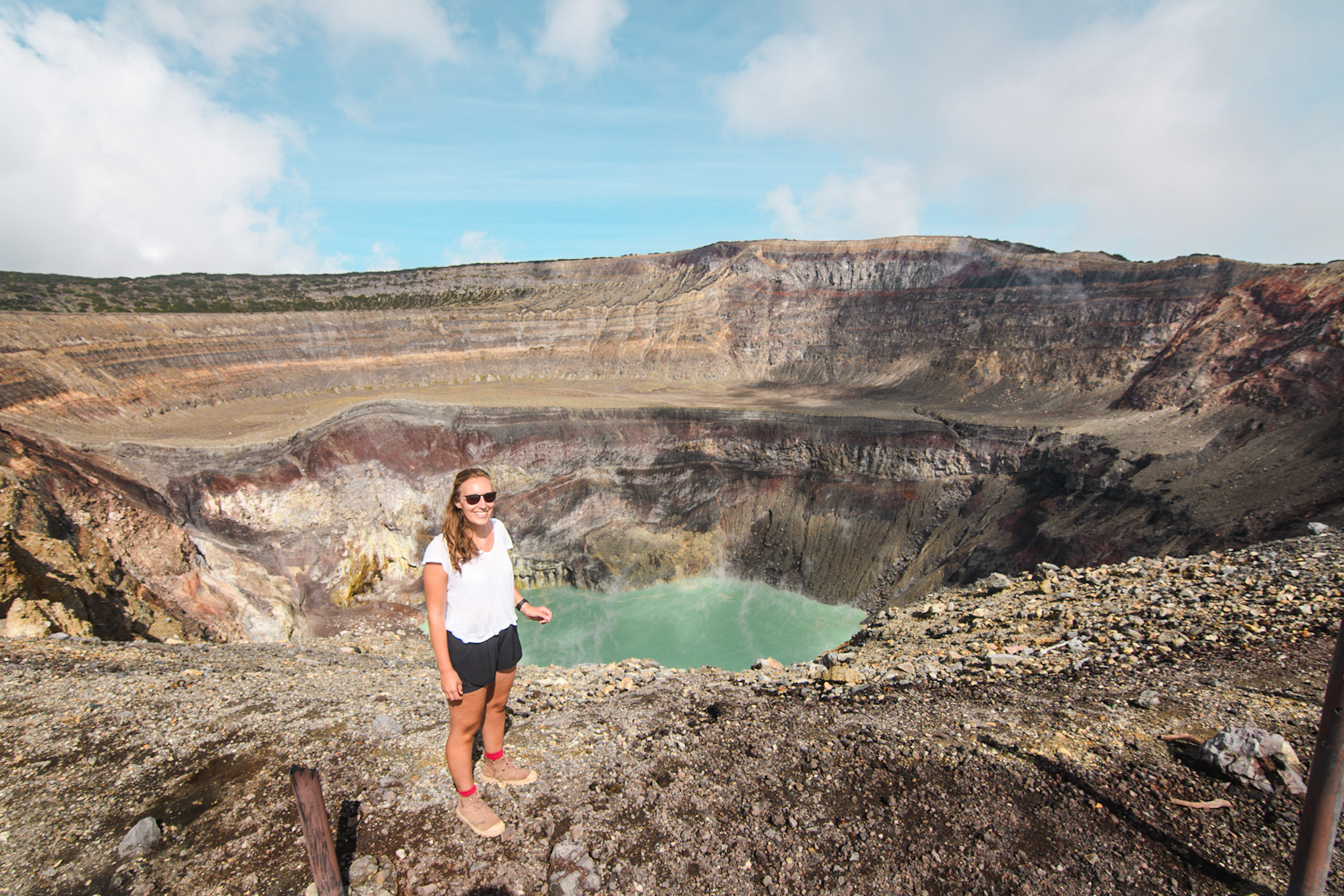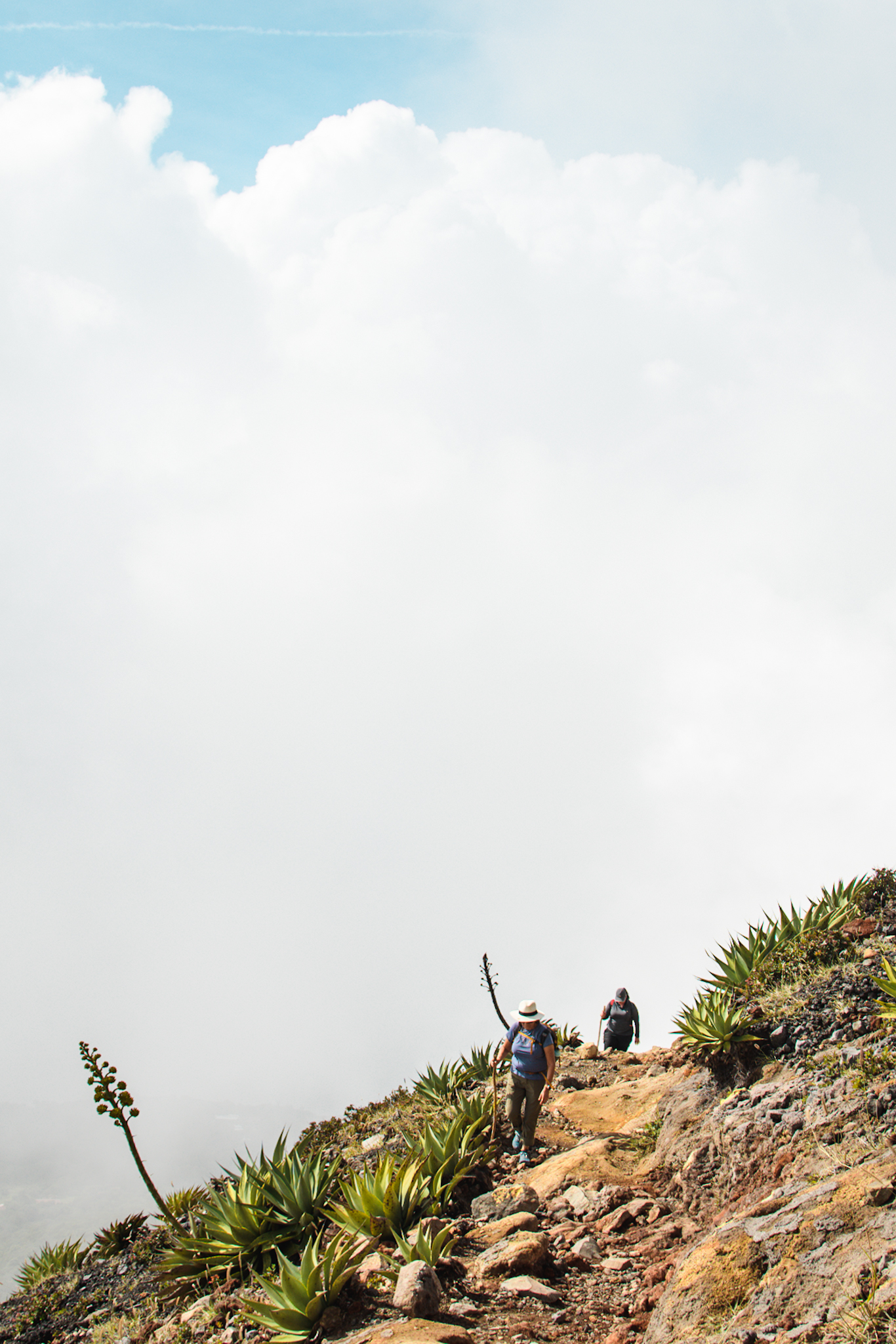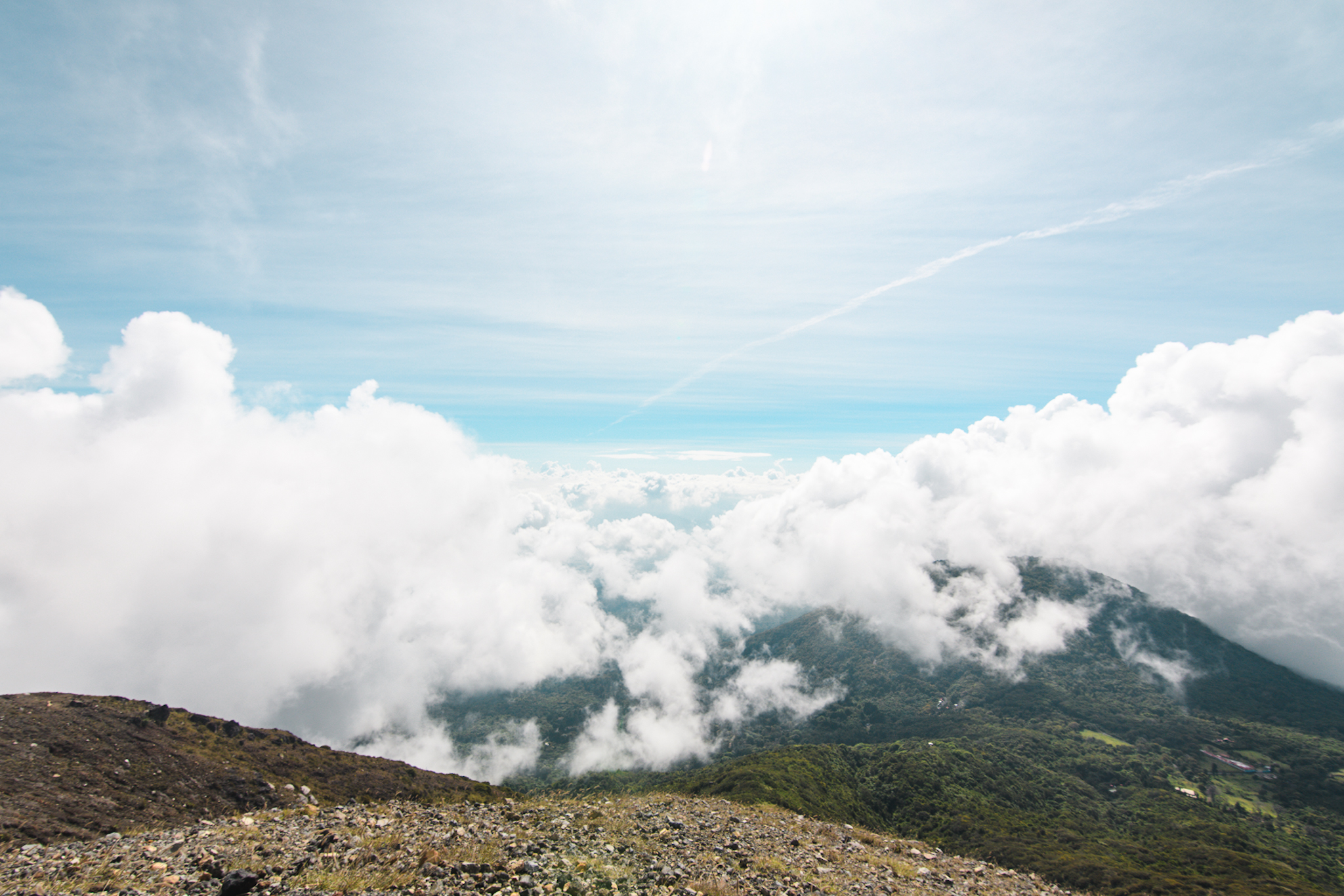 La randonnée n’est pas très compliquée. Il y a environ 450m de dénivelé. Les deux tiers se font dans la forêt/dans les nuages, le reste en plein soleil dans les cailloux. On arrive au somemet en un peu moins de 2h. Le volcan est un des plus actifs du El Salvador et le plus haut (2381m), la dernière éruption date de 2005. Au creux du cratère se trouve un lac de soufre. Ça sent un peu l’oeuf pourri. Depuis le sommet, on aperçoit entre les nuages le cerro verde et le volcan Izalco mais malheureusement on ne verra pas le lac Coatepeque. Après quelques photos, on redescend. Je suis contente d’avoir eu un bon guide qui nous a expliqué pas mal de choses, les guides locaux sont connus pour ne rien expliquer.