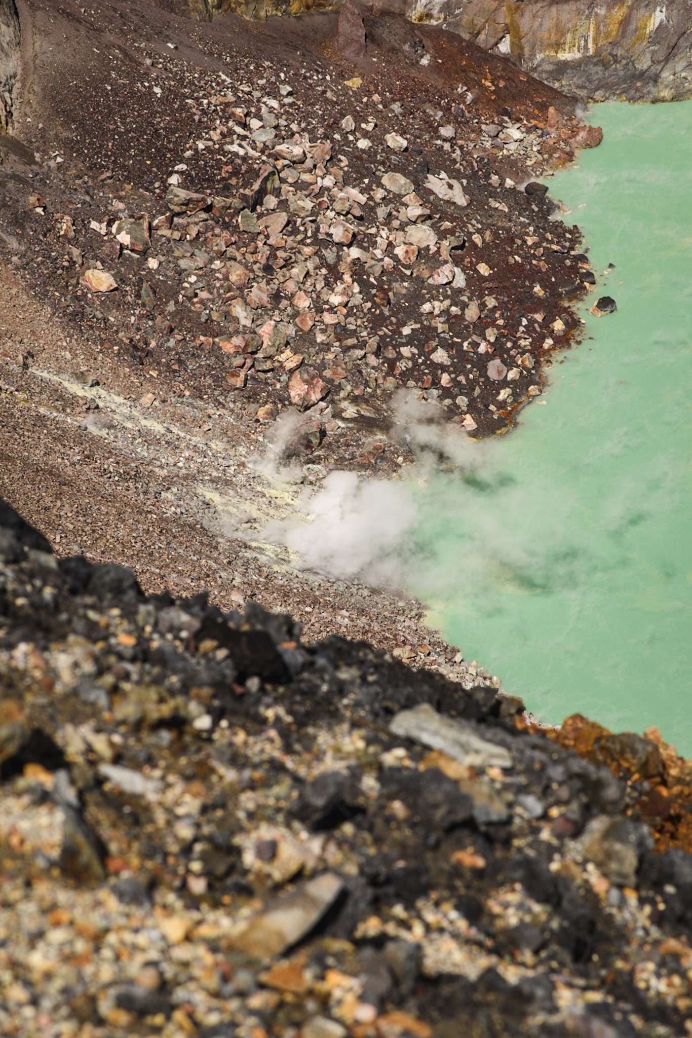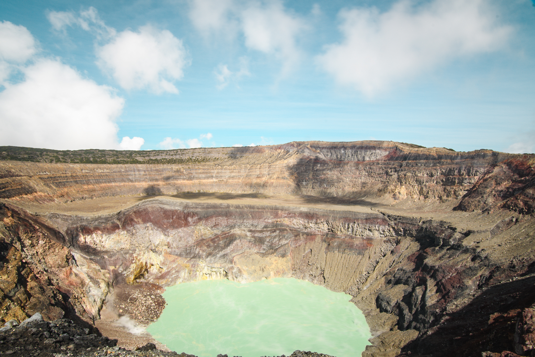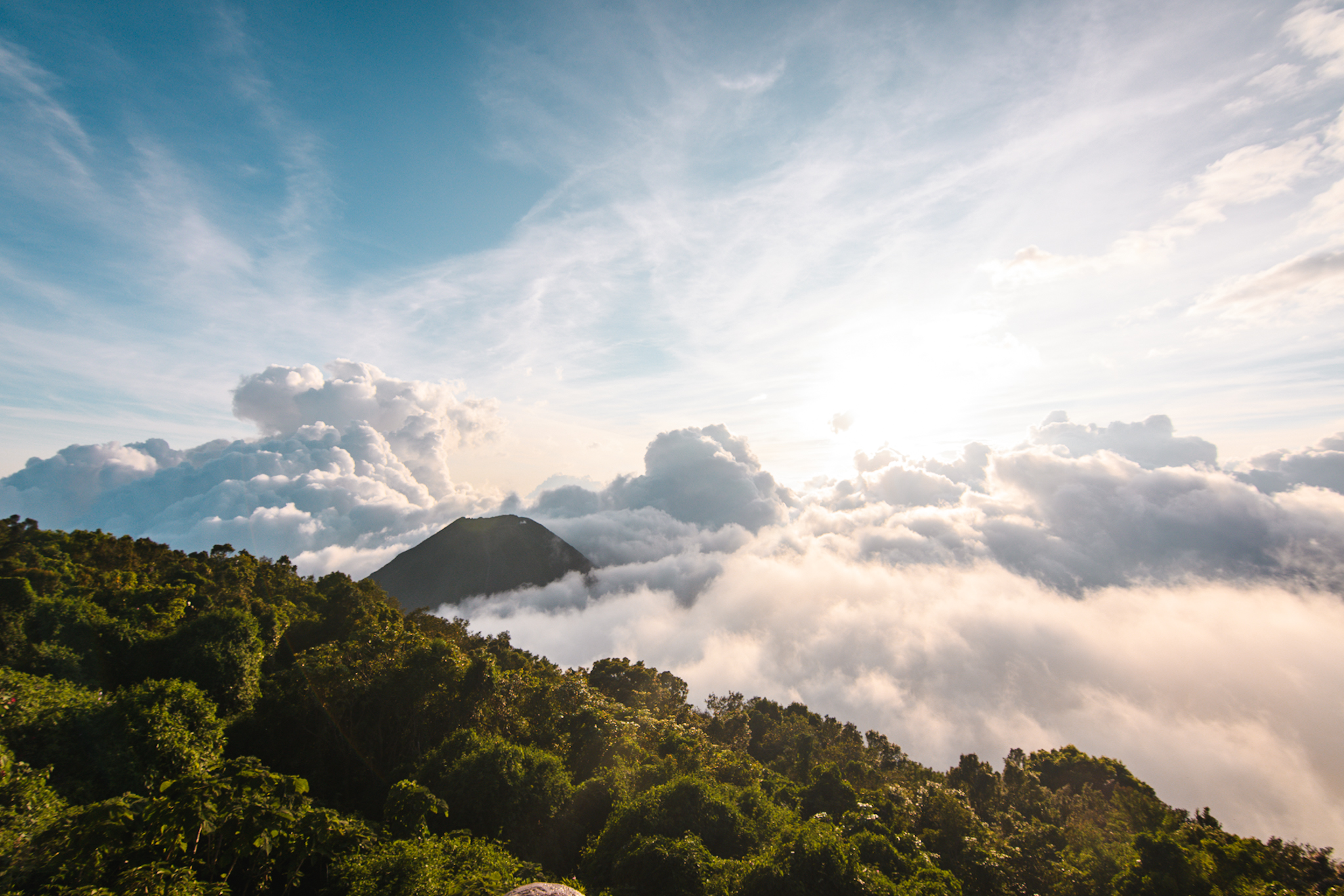 La randonnée n’est pas très compliquée. Il y a environ 450m de dénivelé. Les deux tiers se font dans la forêt/dans les nuages, le reste en plein soleil dans les cailloux. On arrive au somemet en un peu moins de 2h. Le volcan est un des plus actifs du El Salvador et le plus haut (2381m), la dernière éruption date de 2005. Au creux du cratère se trouve un lac de soufre. Ça sent un peu l’oeuf pourri. Depuis le sommet, on aperçoit entre les nuages le cerro verde et le volcan Izalco mais malheureusement on ne verra pas le lac Coatepeque. Après quelques photos, on redescend. Je suis contente d’avoir eu un bon guide qui nous a expliqué pas mal de choses, les guides locaux sont connus pour ne rien expliquer.