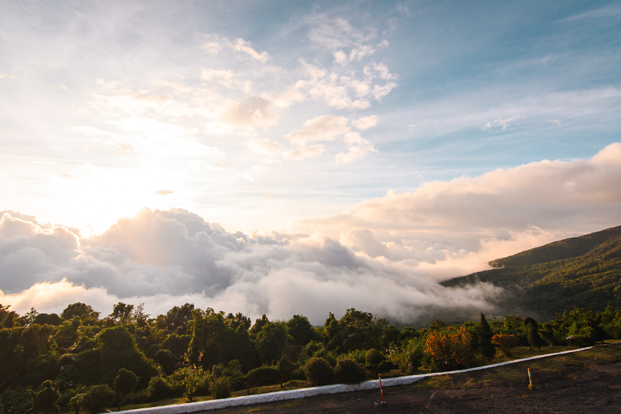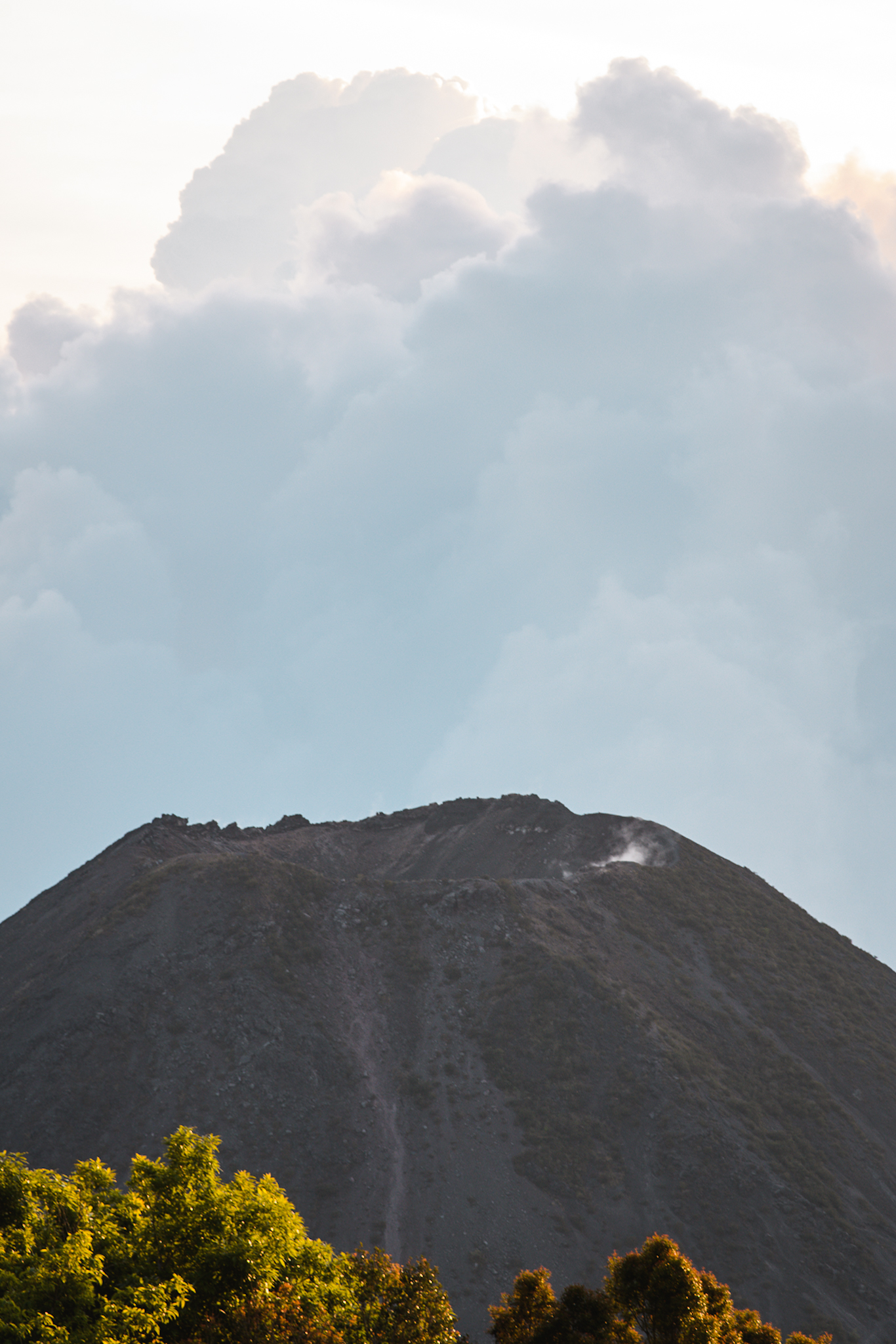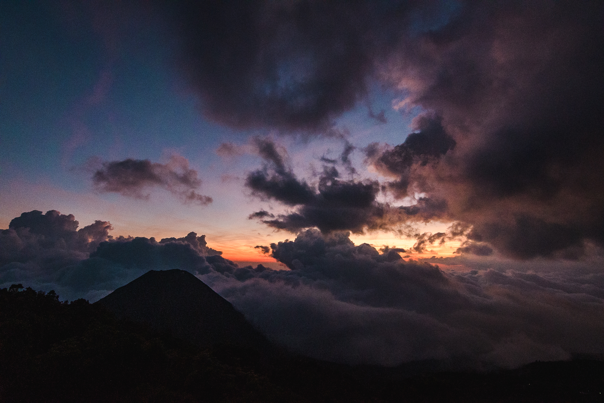 Bref, je sais qu’il y a plusieurs bus qui vont jusqu’au cerro verde mais à part le timing du premier, il est compliqué de trouver des informations. Je crois comprendre qu’un bus part vers midi. Je me rends donc à la station mais la personne au guichet m’indique que le bus ne part qu’à deux heures. Je decide d’attendre sur place etant donné que j’ai mon gros sac avec moi. Bref vers 16h, j’arrive enfin à destination. Il fait plus frais et je me change. C’est mon premier jeans depuis le début du voyage. Je marche une demi heure vers l’entrée du parc national d’où j’espère voir le coucher du soleil. Les gardes à l’entrée me laissent passer sans payer étant donné que je ne reste que peu de temps, et paierai l’entrée le lendemain. Du point de vue je peux voir le cerro verde ainsi que le volcan Izalco, un jeune volcan encore actif. Les nuages arrivent et cachent en partie le coucher du soleil mais l’ensemble reste très beau. Une fois qu’il fait nuit je redescends jusqu’à mon auberge. Il n’y a personne dans mon dortoir et j’ai donc une chambre privée.