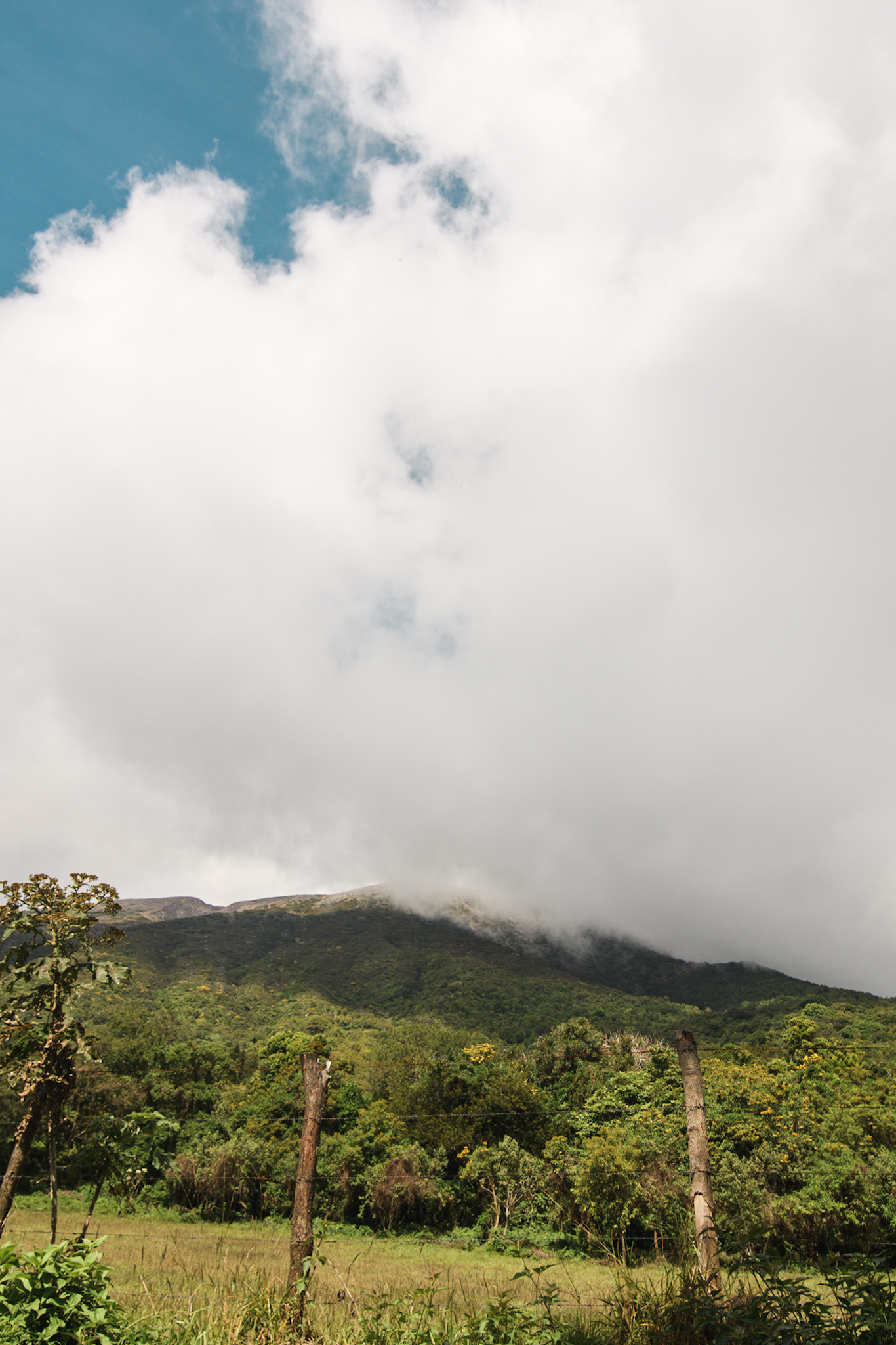Mardi matin, je me réveille dans les nuages. J’espère que ça va se dégager. Je m’habille et vers 8h, j’arrive à l’entrée du parc. Il faut officiellement un guide pour grimper mais certains ont réussi à le faire sans. Le problème c’est qu’il n’y a encore personne sur le chemin et le garde me dit que s’il y avait déjà du monde, il aurait pu faire une exception mais la ce n’est pas possible. Heureusement une quinzaine de minutes plus tard, un guide national arrive avec deux américaines un peu plus âgées et il accepte que je les rejoigne. Il me dit juste qu’ils iront lentement. Cela me va très bien, pour une fois je serai la première du groupe.