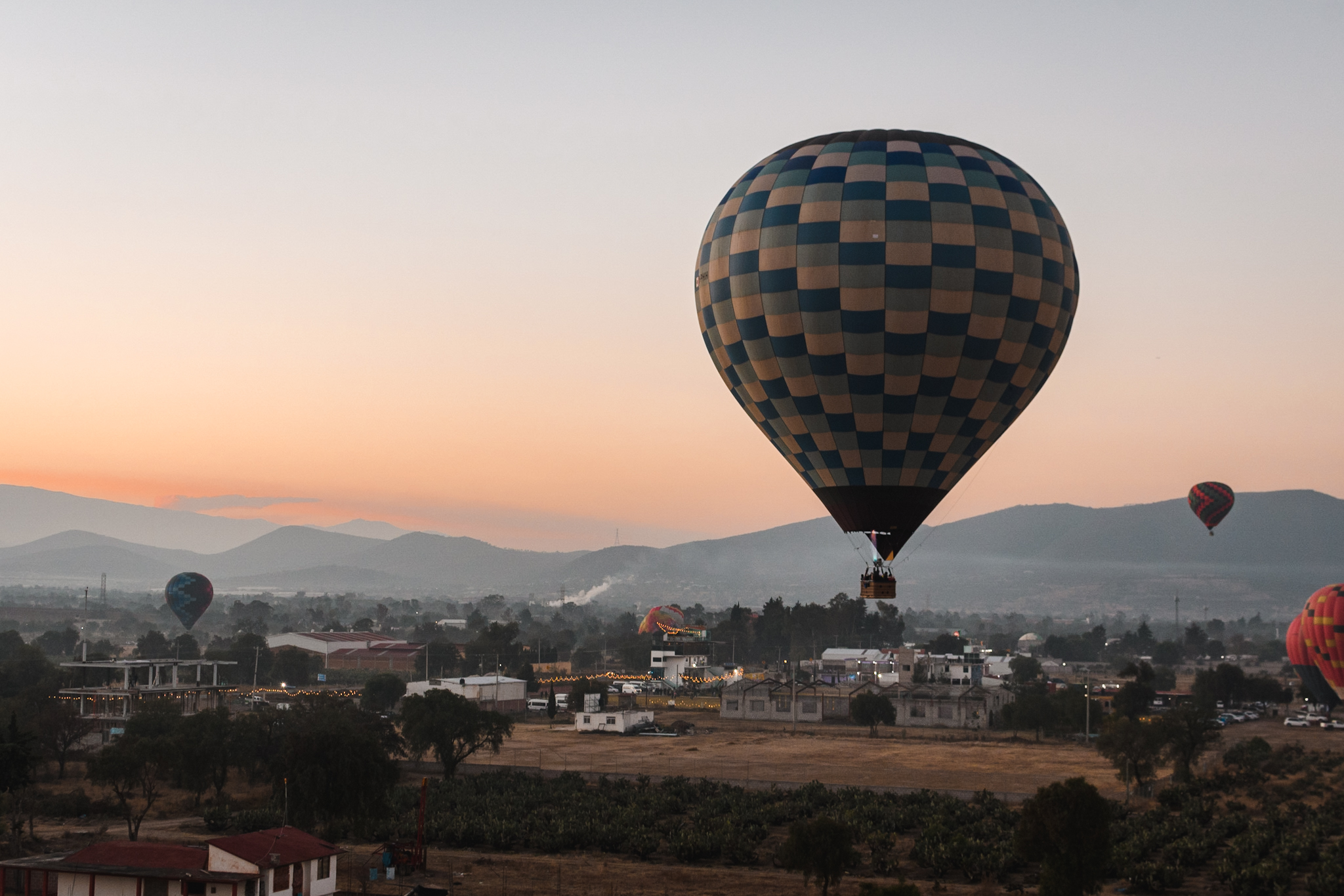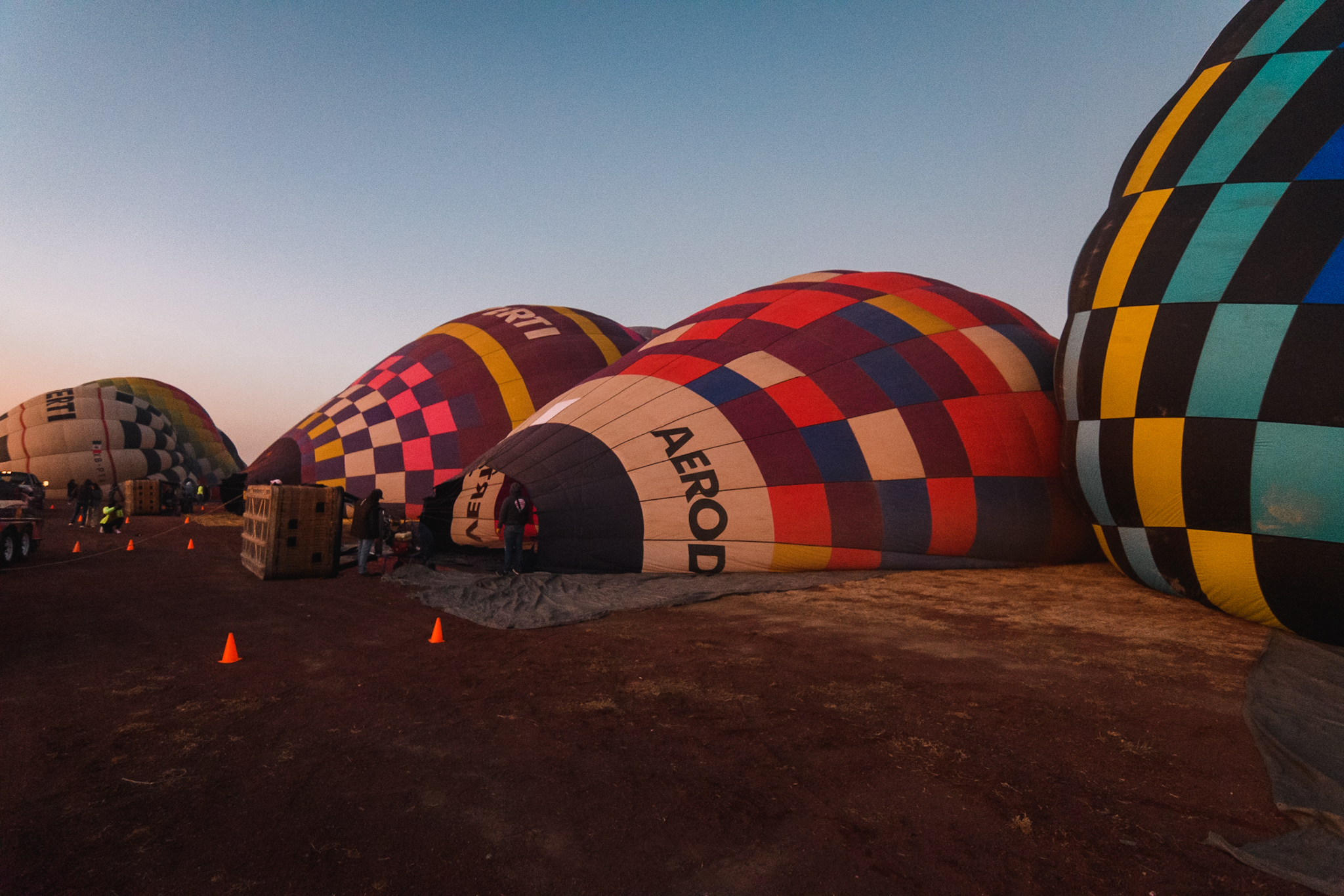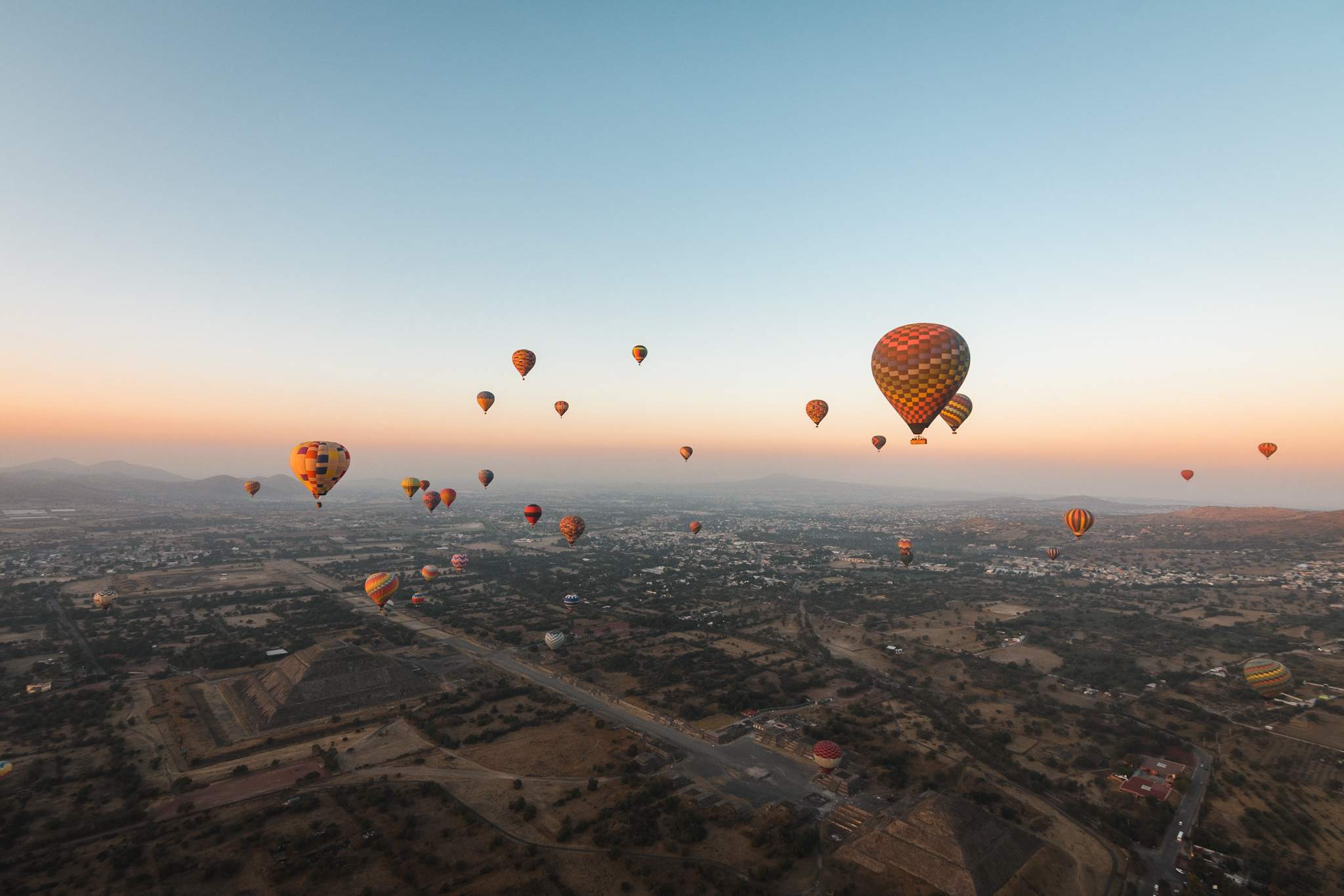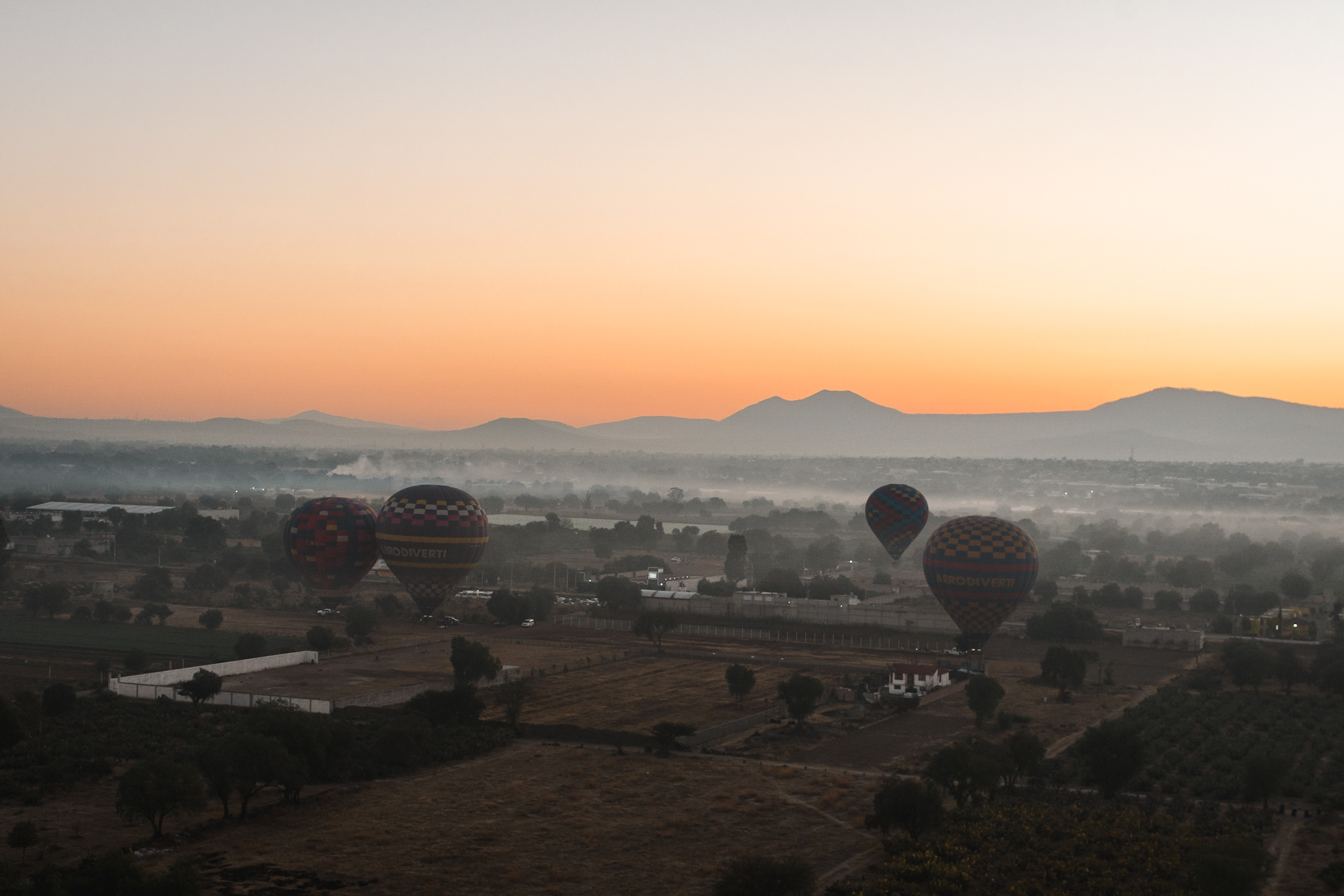 En effet, on a décidé de faire un tour en montgolfière au lever du soleil au dessus des temples de tehotihuacan. Le réveil a 4h du matin est difficile. On va en uber jusqu’au point de rendez-vous où on attend car on est arrivées trop tôt (on voulait être sûres d’être là à temps). La ville de México étant située à plus de 2000m d’altitude, les nuits sont froides et on grelotte. Mais ils finissent par arriver et on se réchauffe sous un champignon. On nous explique les règles de sécurité et on place nos affaires dans des casiers. Quand le soleil commence à se lever, on quitte le bâtiment vers le champ derrière et la on découvre toutes les montgolfières qui sont en train d’être préparées. Après quelques photos, on monte dans la nacelle et alors que les rayons du soleil comment à nous réchauffer, on s’envole.