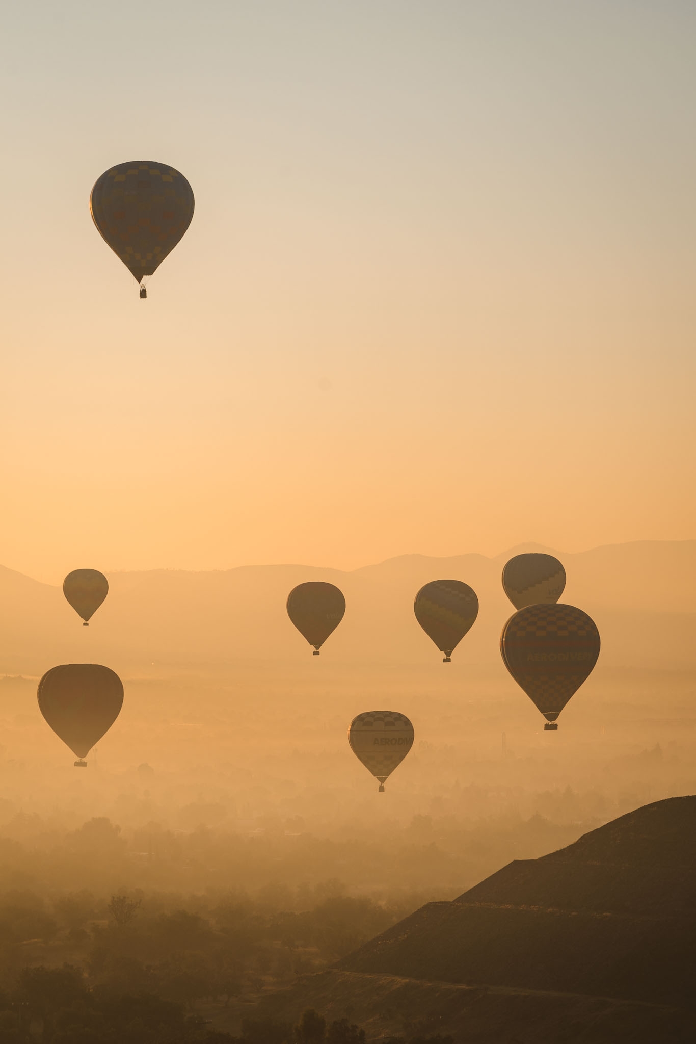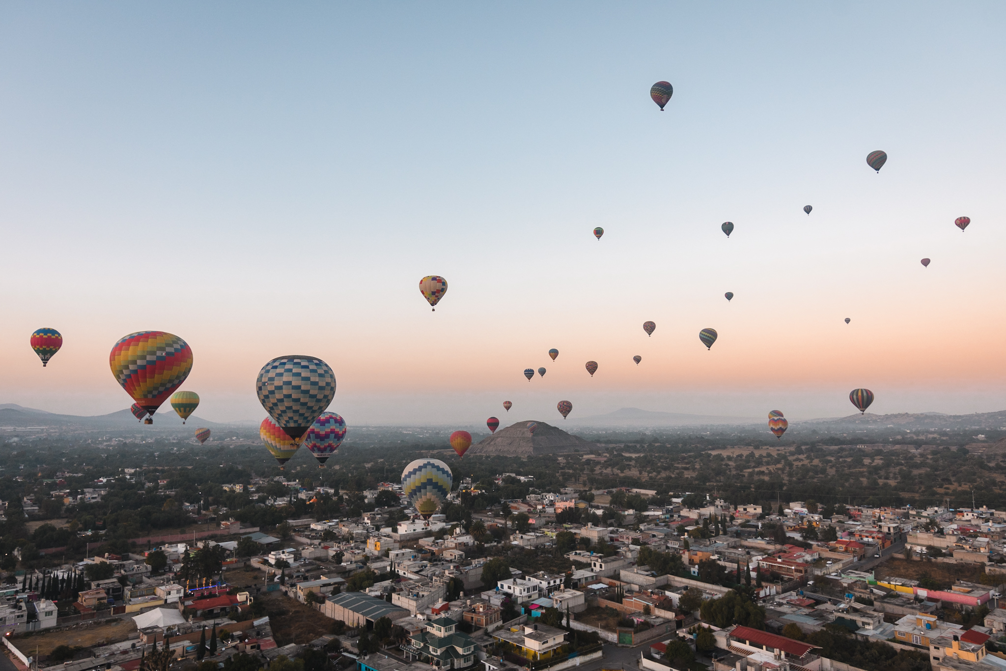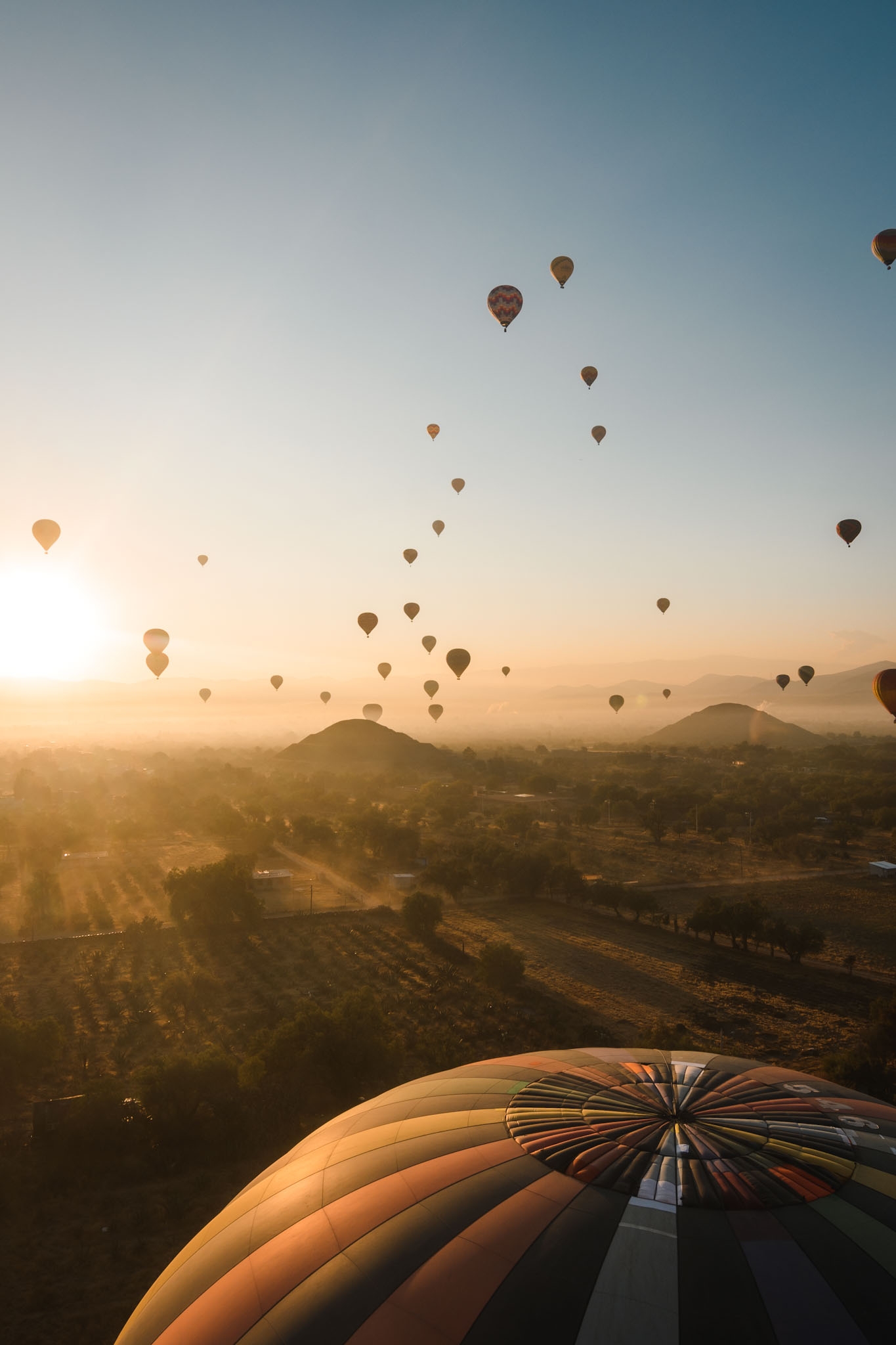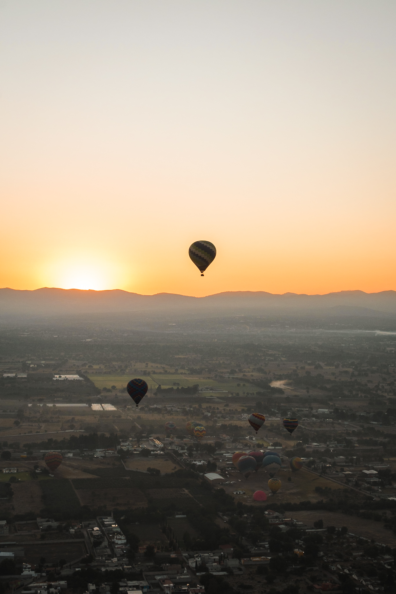 En effet, on a décidé de faire un tour en montgolfière au lever du soleil au dessus des temples de tehotihuacan. Le réveil a 4h du matin est difficile. On va en uber jusqu’au point de rendez-vous où on attend car on est arrivées trop tôt (on voulait être sûres d’être là à temps). La ville de México étant située à plus de 2000m d’altitude, les nuits sont froides et on grelotte. Mais ils finissent par arriver et on se réchauffe sous un champignon. On nous explique les règles de sécurité et on place nos affaires dans des casiers. Quand le soleil commence à se lever, on quitte le bâtiment vers le champ derrière et la on découvre toutes les montgolfières qui sont en train d’être préparées. Après quelques photos, on monte dans la nacelle et alors que les rayons du soleil comment à nous réchauffer, on s’envole.