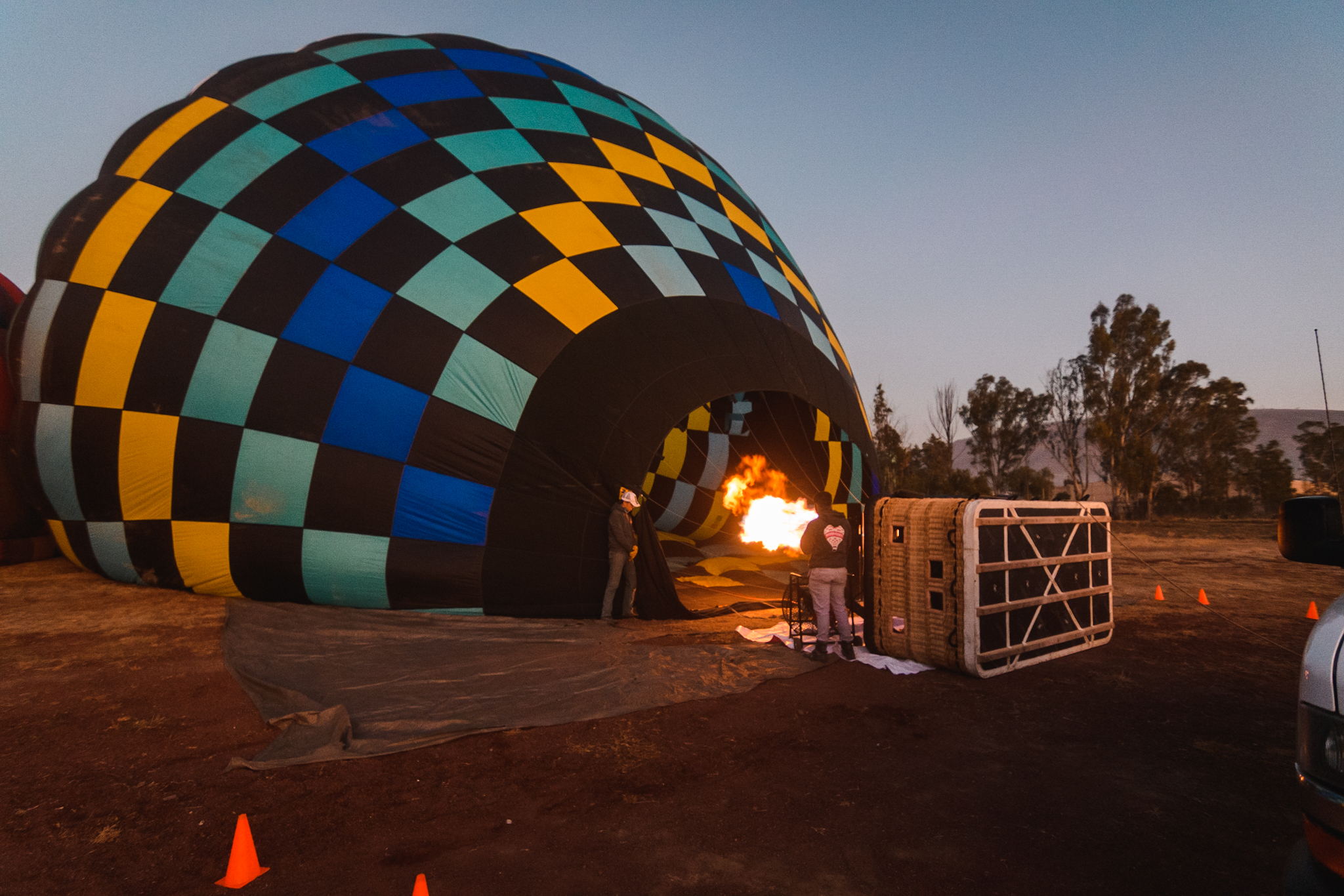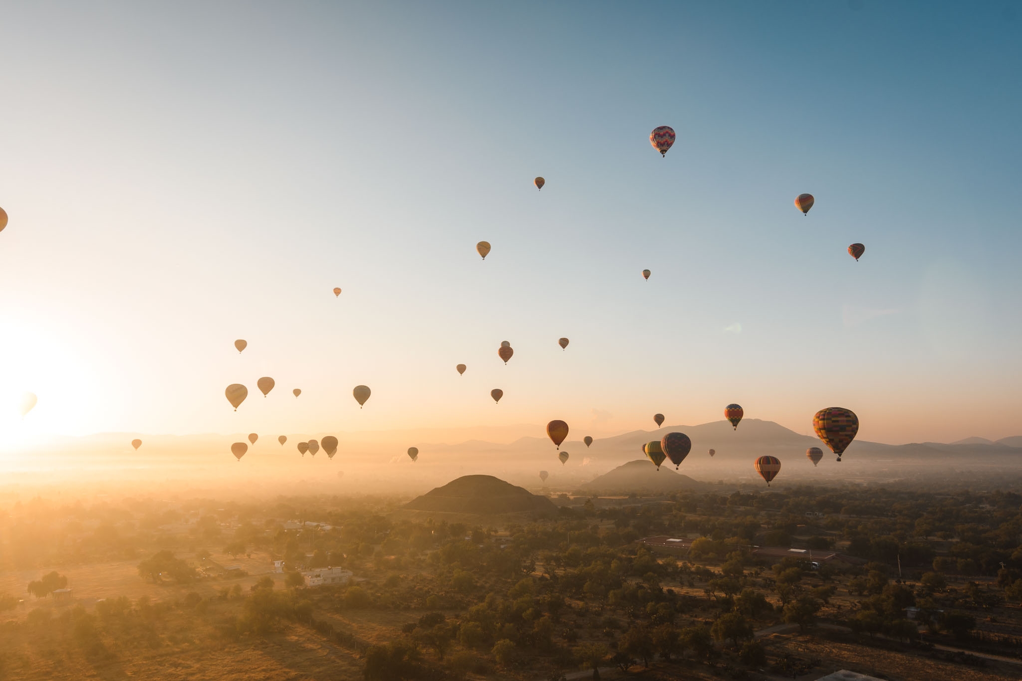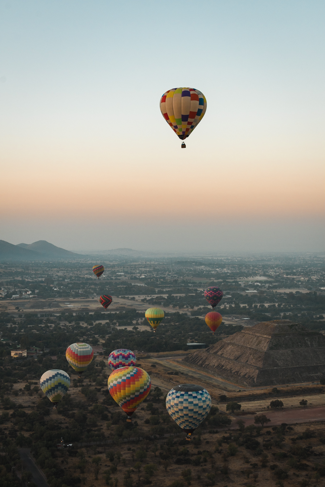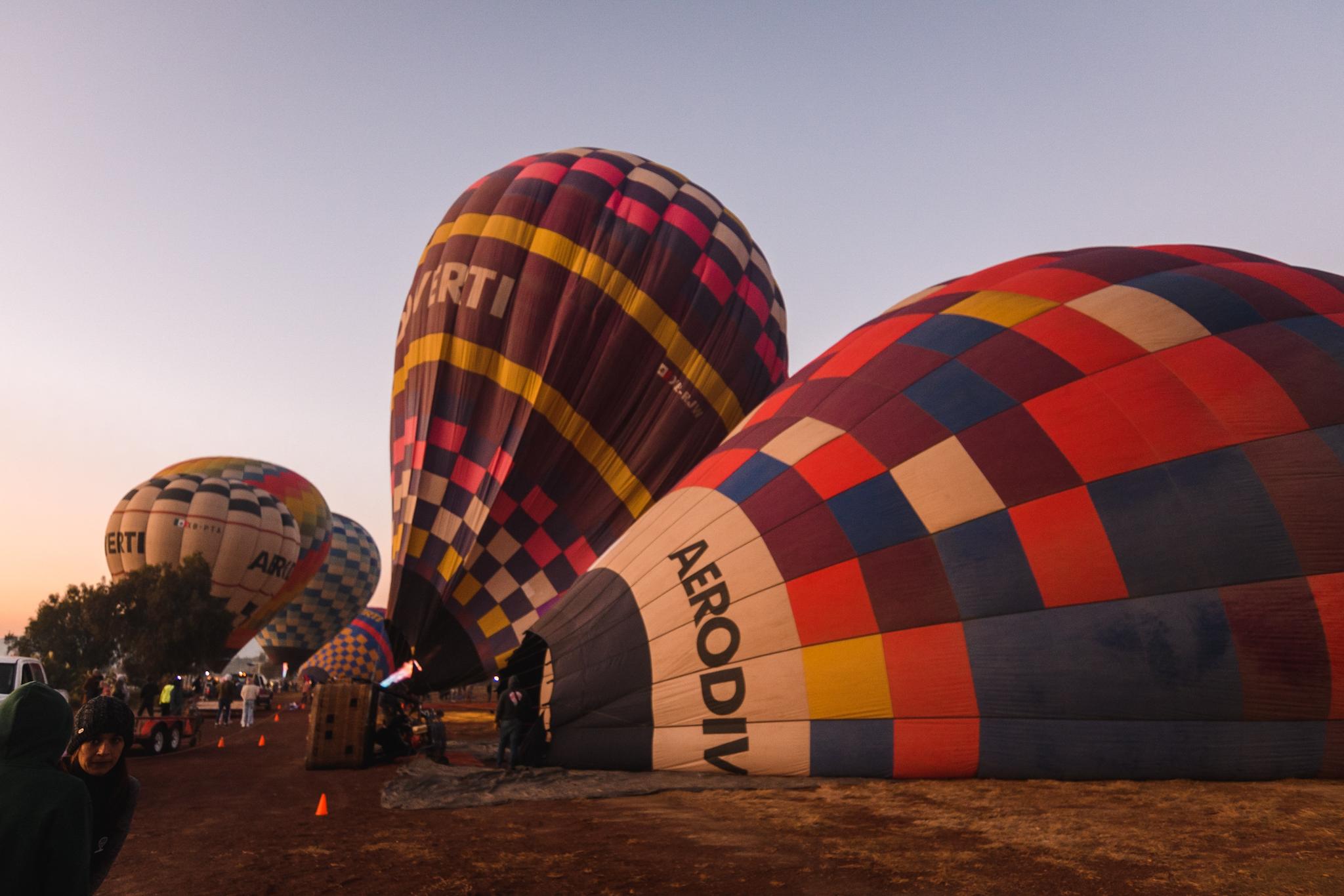 En effet, on a décidé de faire un tour en montgolfière au lever du soleil au dessus des temples de tehotihuacan. Le réveil a 4h du matin est difficile. On va en uber jusqu’au point de rendez-vous où on attend car on est arrivées trop tôt (on voulait être sûres d’être là à temps). La ville de México étant située à plus de 2000m d’altitude, les nuits sont froides et on grelotte. Mais ils finissent par arriver et on se réchauffe sous un champignon. On nous explique les règles de sécurité et on place nos affaires dans des casiers. Quand le soleil commence à se lever, on quitte le bâtiment vers le champ derrière et la on découvre toutes les montgolfières qui sont en train d’être préparées. Après quelques photos, on monte dans la nacelle et alors que les rayons du soleil comment à nous réchauffer, on s’envole.