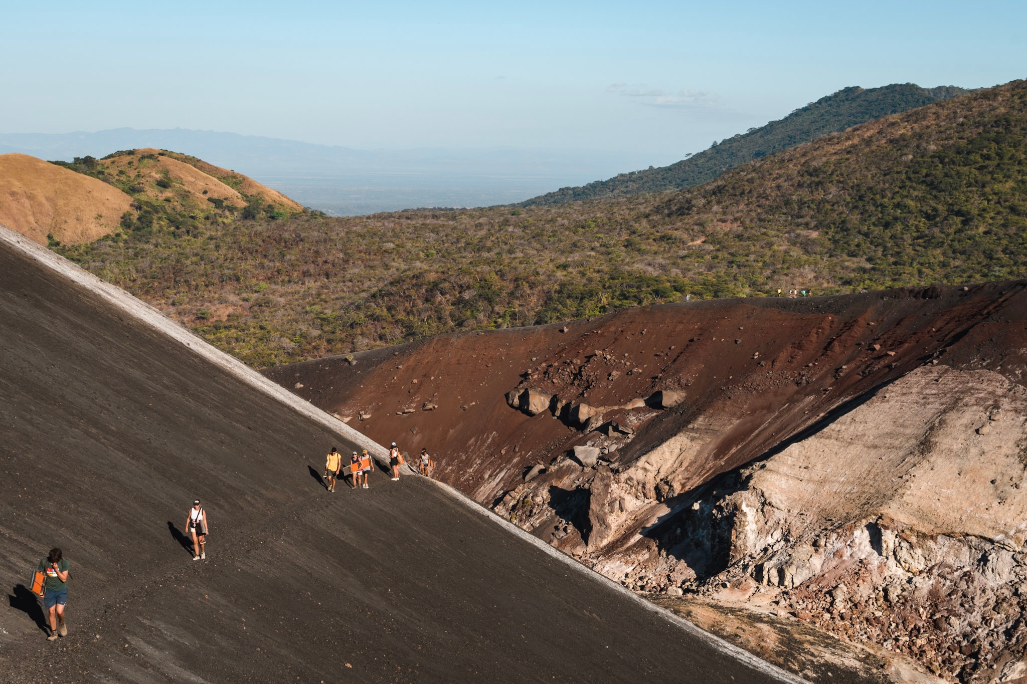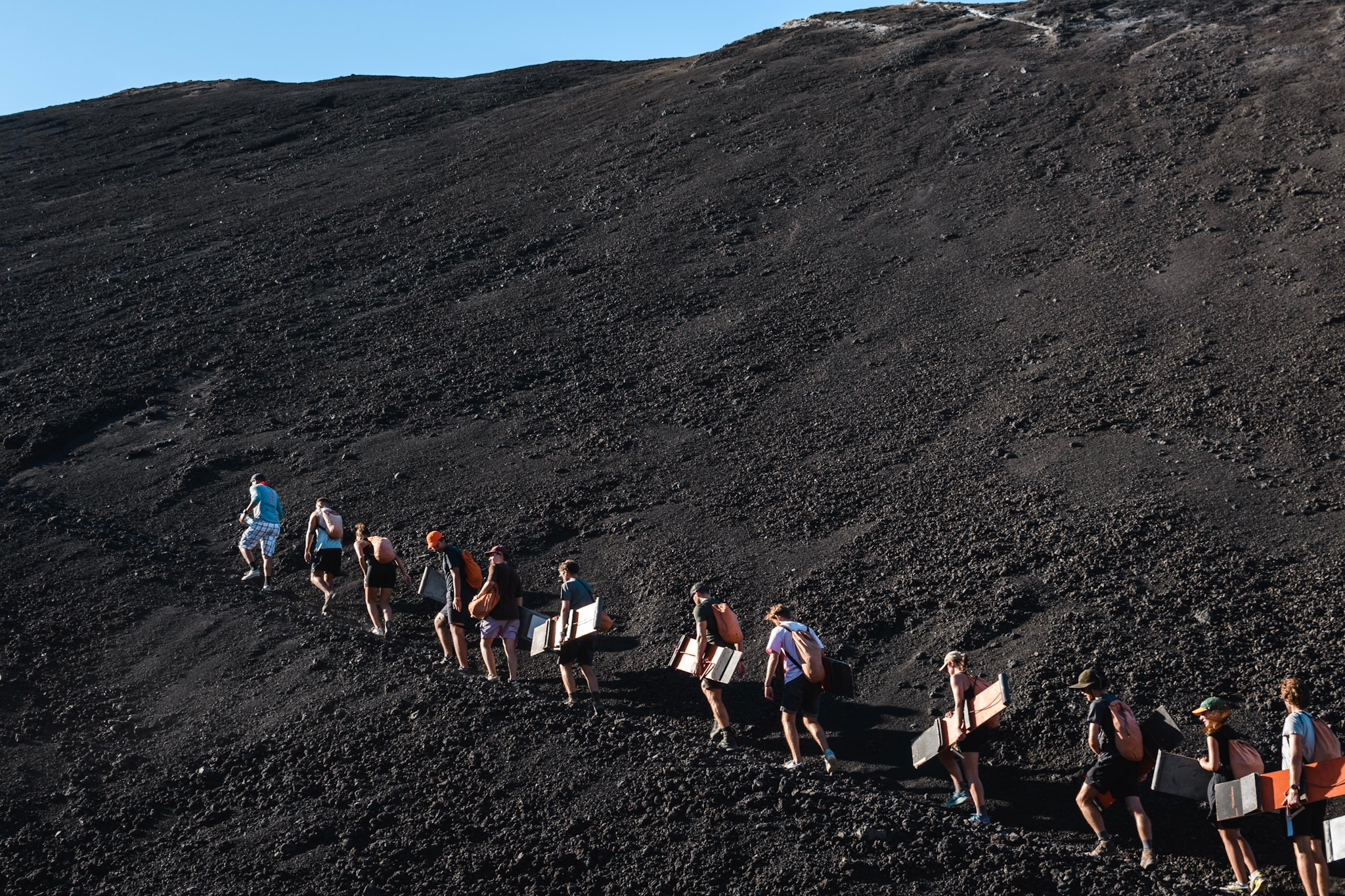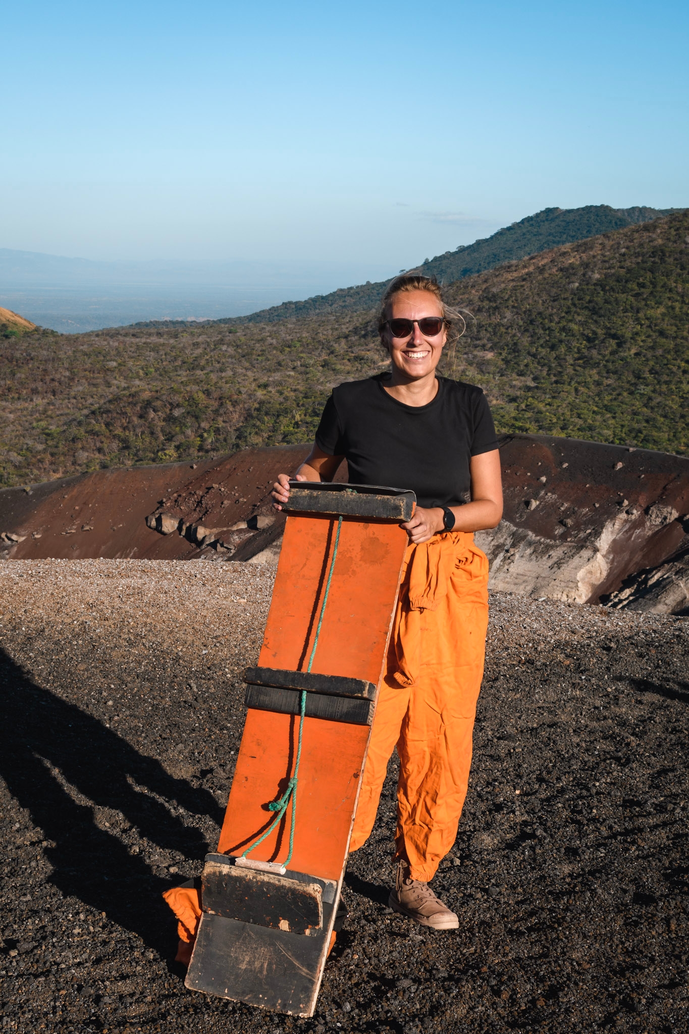 Pendant une heure, on grimpe le volcan Cerro Negro, le plus actif et la plus jeune du Nicaragua (le deuxième plus jeune au monde). En haut, on s’équipe, on fait quelques photos et on se prépare pour la descente. C’est un des seuls endroits au monde où on peut faire de la luge sur un volcan. C’est un australien qui a eu l’idée de descendre le volcan et il a testé plusieurs méthodes pour le faire, notamment une porte de frigo. Ce sont maintenant des planches de bois équipées de métal et de formica qui sont utilisées. Le record de vitesse est de plus de 100km/h.