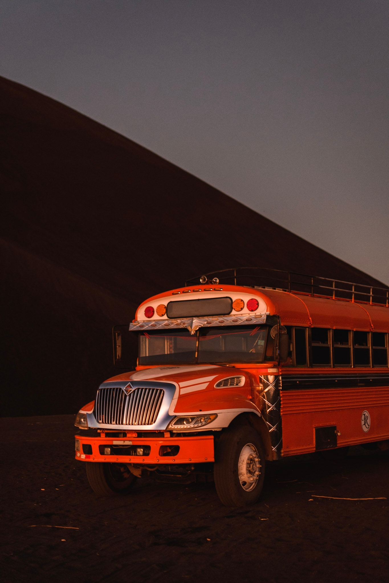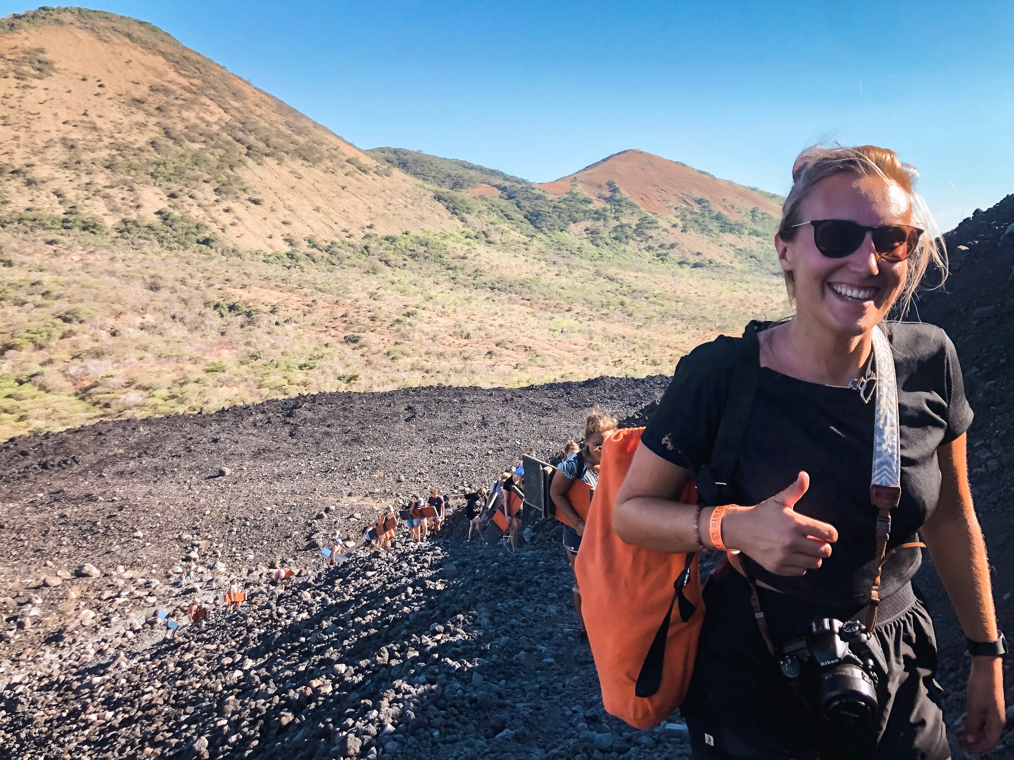 Le lendemain matin, je change d’auberge pour une plus animée. Je discute avec quelques touristes et ils m’indiquent qu’ils font le volcano boarding dans l’après midi. Il reste de la place et je m’inscris au tour. Ce dernier part vers 13h. On commence par une heure de bus dans un chicken bus, on est une petite quarantaine de voyageurs. On arrive au pied du volcan, l’équipe nous donne notre matériel : combi orange, lunettes de protection, sac et planche et c’est parti. La planche est lourde et je la donne à un local qui la porte jusqu’en haut pour quelques euros. J’ai les mains libres pour prendre des photos du coup.