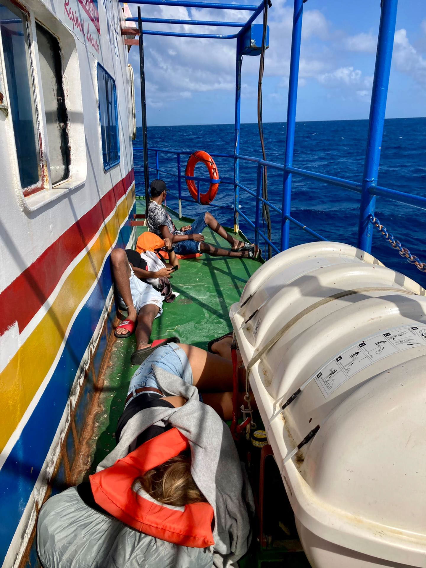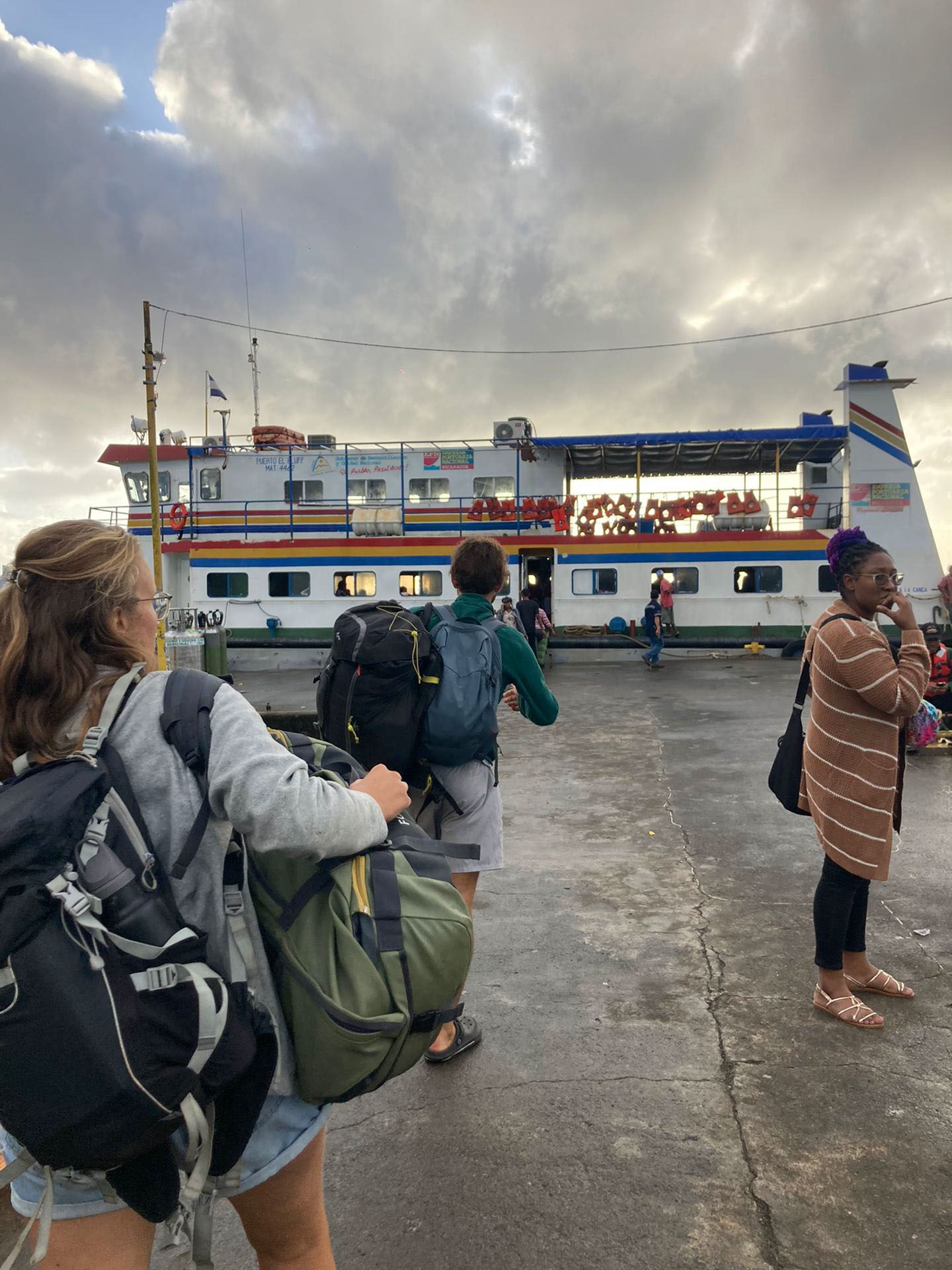 Vendredi on profite de notre dernière journée à la plage. A midi on se fait une salade et vers 15h on attrape de justesse un bus pour retourner vers Léon où on débute un long périple pour traverser le pays. On enchaîne donc un chicken bus, un taxi pour changer de terminal à Léon, un bus pour aller jusque Managua, la capitale d’où on prend un premier taxi pour une station de bus où on nous annonce que le bus qu’on souhaite prendre est complet. On a juste le temps de prendre un autre taxi jusqu’à une autre station et d’acheter les dernières places pour Bluefields, petite ville sur la côte est du Nicaragua. C’est un bus de nuit de 8h qui part à 20h. Le confort est quasi inexistant, c’est simplement un chicken bus qui roule la nuit. L’état de la route ne nous aide pas à dormir, ce sont des bosses et des trous et les fenêtres sont grandes ouvertes. Bref, vers 4h du matin, on arrive à Bluefields bien fatigués. En montant dans le bus, un couple de voyageurs nous a annoncé que le bateau que nous comptons prendre est annulé pour cause de mauvais temps et les locaux nous le confirme quand on arrive. On décide qund même d’attendre 6h du matin pour voir ce que l’ont peut trouver comme solution. Heureusement, les conditions météo se sont améliorées et on peut acheter nos places. Bastian et Caro font les courses pendant que je fais la file et vers 9h, le bateau démarre. Le voyage dure 5 à 6h et est mouvementé mais les vagues sont moins fortes que ce à quoi je m’attendais (où c’est le médicament anti mal de mer qui fait son travail). Je passe les 7h de trajet (plus long que prévu au final) sur le ponton, en essayant tant bien que mal de me cacher du soleil mais c’est peine perdue et je me retrouve avec des beaux coups de soleil. Quand je retrouve Caro et Bastian resté en bas, ils me racontent que pas mal de sacs plastiques ont été distribués…