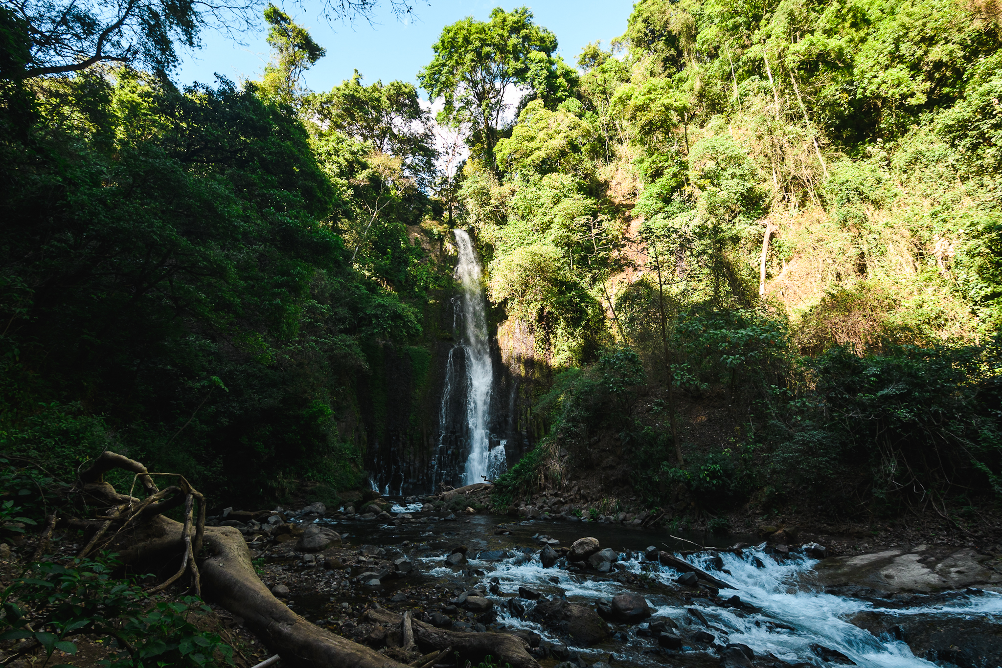 Lundi matin, on déjeune tout en discutant de notre programme des prochaines semaines. En fin de matinée, on récupère notre van qui sera notre maison et moyen de transport au Costa Rica. Ce pays étant très cher, une manière de limiter les frais est de le visiter en van. C’est un VW T3 et Lauranne, la connaisseuse, fait le tour avec le loueur. Une fois que tout est en ordre, on démarre. Première etape: le plein et les courses. On quitte San José ensuite pour le nord. On visite la cascade de Los Chorros. Il n’y a personne, c’est parfait.