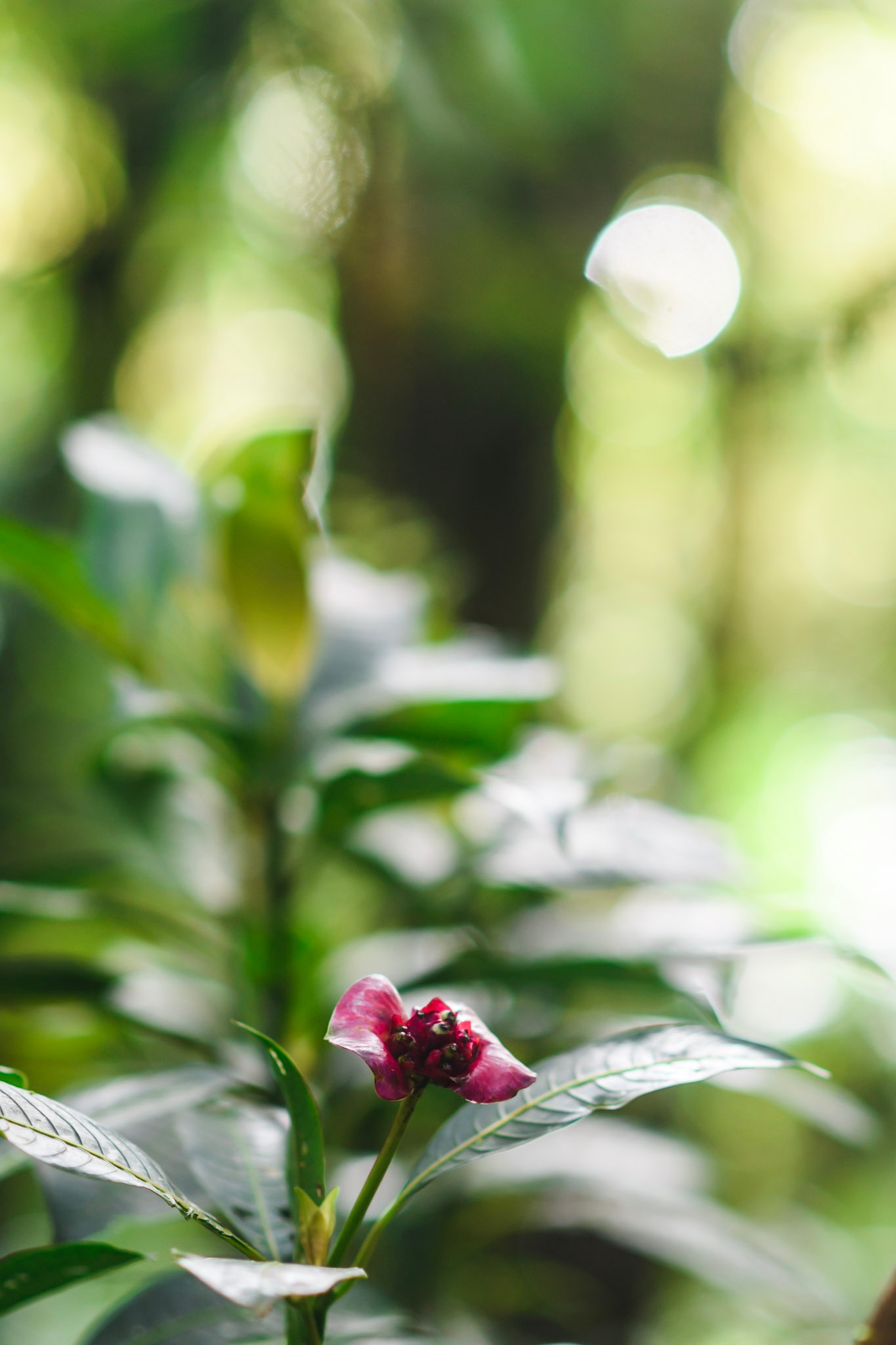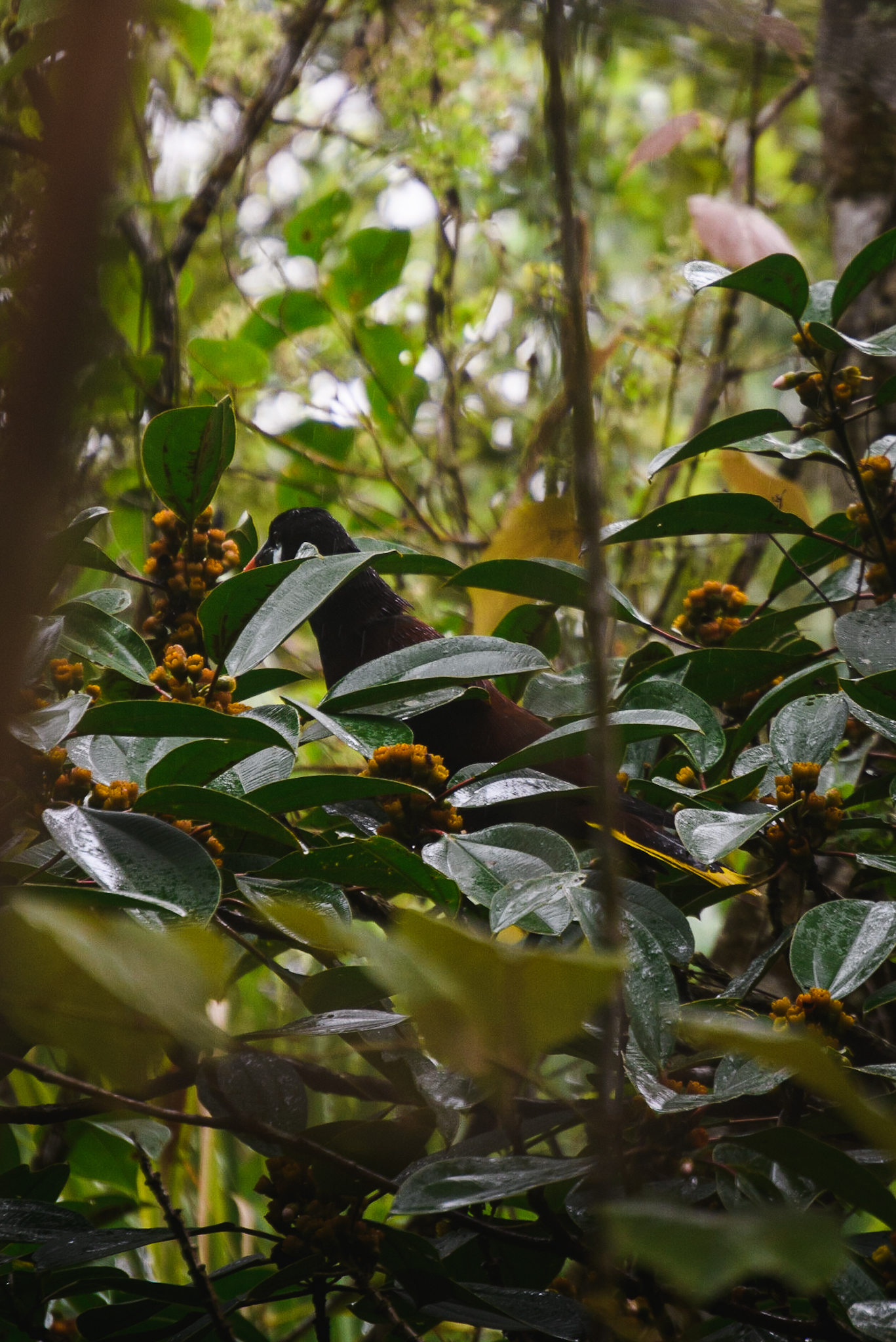 Le lendemain matin, on réserve une deuxième nuit, le van ne sera réparé que jeudi apparemment. On fait quelques emplettes le matin et puis on prend un taxi vers le parc national du volcan Arenal. Volcan qu’aujourd’hui on ne voit pas du tout depuis la ville tellement il y a des nuages. La météo n’est pas au rendez-vous mais pas le choix, on y va. Le taxi nous dépose et on commence à parcourir les différents sentiers du parc. Ces derniers sont très boueux et on a de la boue un peu partout. On admire la forêt verdoyante (grâce au volcan) et on aperçoit plusieurs oiseaux, un singe/coati/taira (trop vite pour savoir ce que c’est) et un couple de gros dindons. On passe à côté d’immenses arbres également. On marche jusqu’à un mirador mais impossible de voir le volcan et de plus il se met à bien pleuvoir. Heureusement dans la forêt on est un peu à l’abri. Après un lunch entre deux averses, on marche jusqu’à un dernier mirador où on attend que la vue se dégage un peu pour voir le volcan. Heureusement pour nous, c’est le cas et le volcan se dévoile un peu.