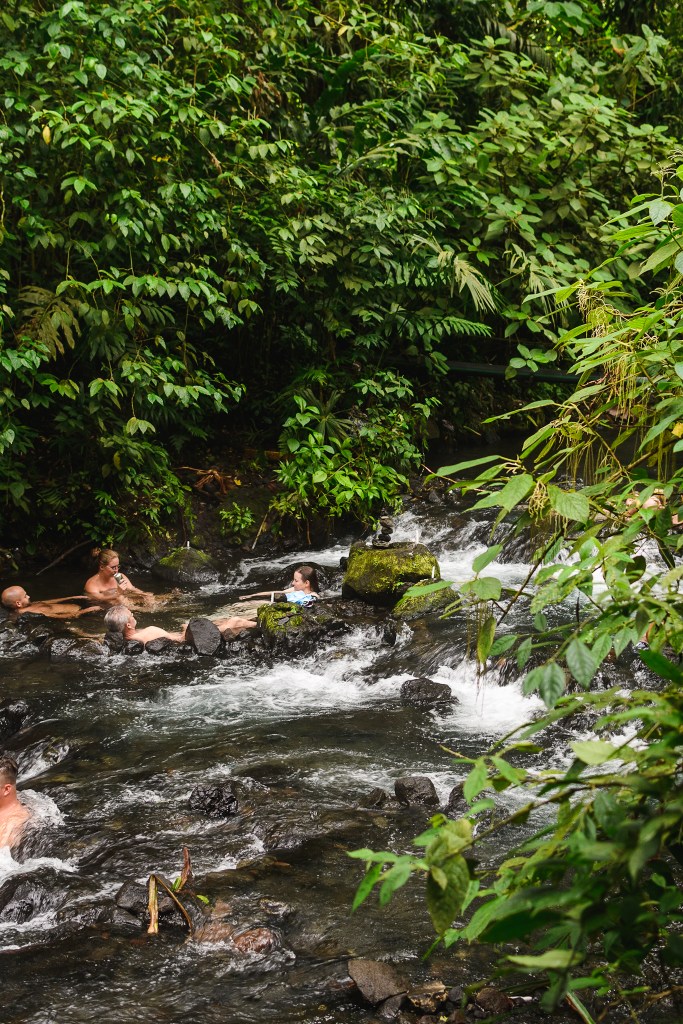 On rebrousse chemin et on marche jusque l’entrée du parc d’où on fait du stop et grâce à deux voitures, on arrive aux sources d’eau chaude el Choyin. Ce sont les seules accessibles gratuitement, le reste est privatisé par des hôtels. Il y a du monde mais il y a bien assez de petites piscines pour que chacun ait son espace. C’est agréable, l’eau est à température idéale et on se prélasse (sous un peu de pluie) avant de rentrer en stop à la Fortuna. Une bonne nouvelle viendra égayer notre soirée, le van est réparé et en route. Il arrive après le souper.