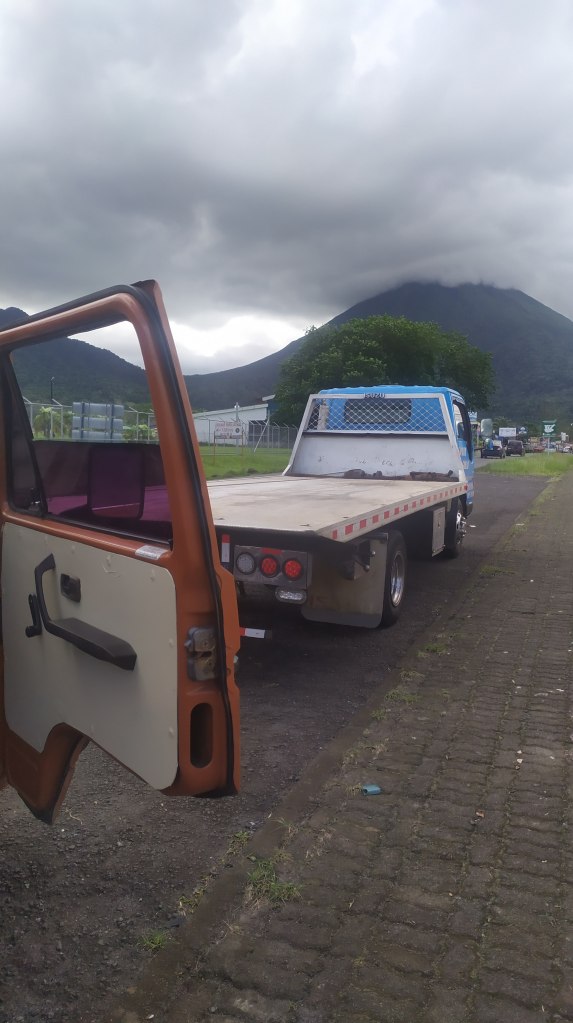 On continue notre route vers le nord et 2h de route sinueuse plus tard, on arrive à la fortuna où l’on fait quelques courses. Cinq minutes après avoir redémarré, le van a du mal, les vitesses ne s’enclenchent plus et on se met sur le côté de la route. Ouille, c’est mauvais signe. On contacte le loueur et après quelques échanges et des vidéos, un remorqueur arrive. On l’aura attendu en regardant le volcan Arenal, notre destination espérée, devant nous. Le remorqueur nous dépose à la Fortuna où nous louons une chambre dans un petit hôtel.