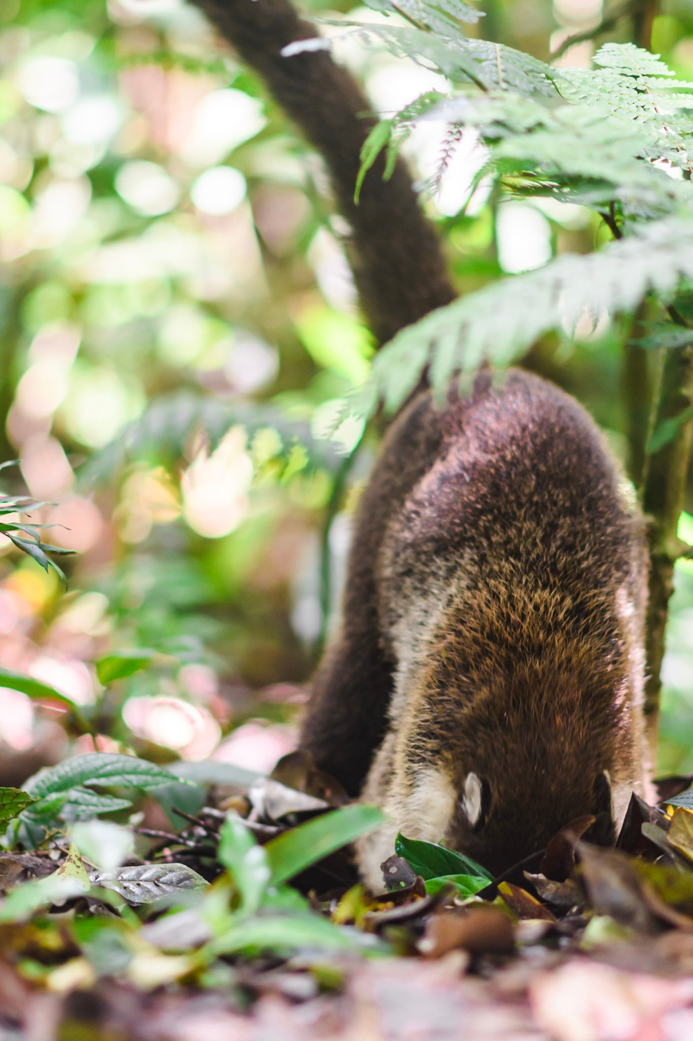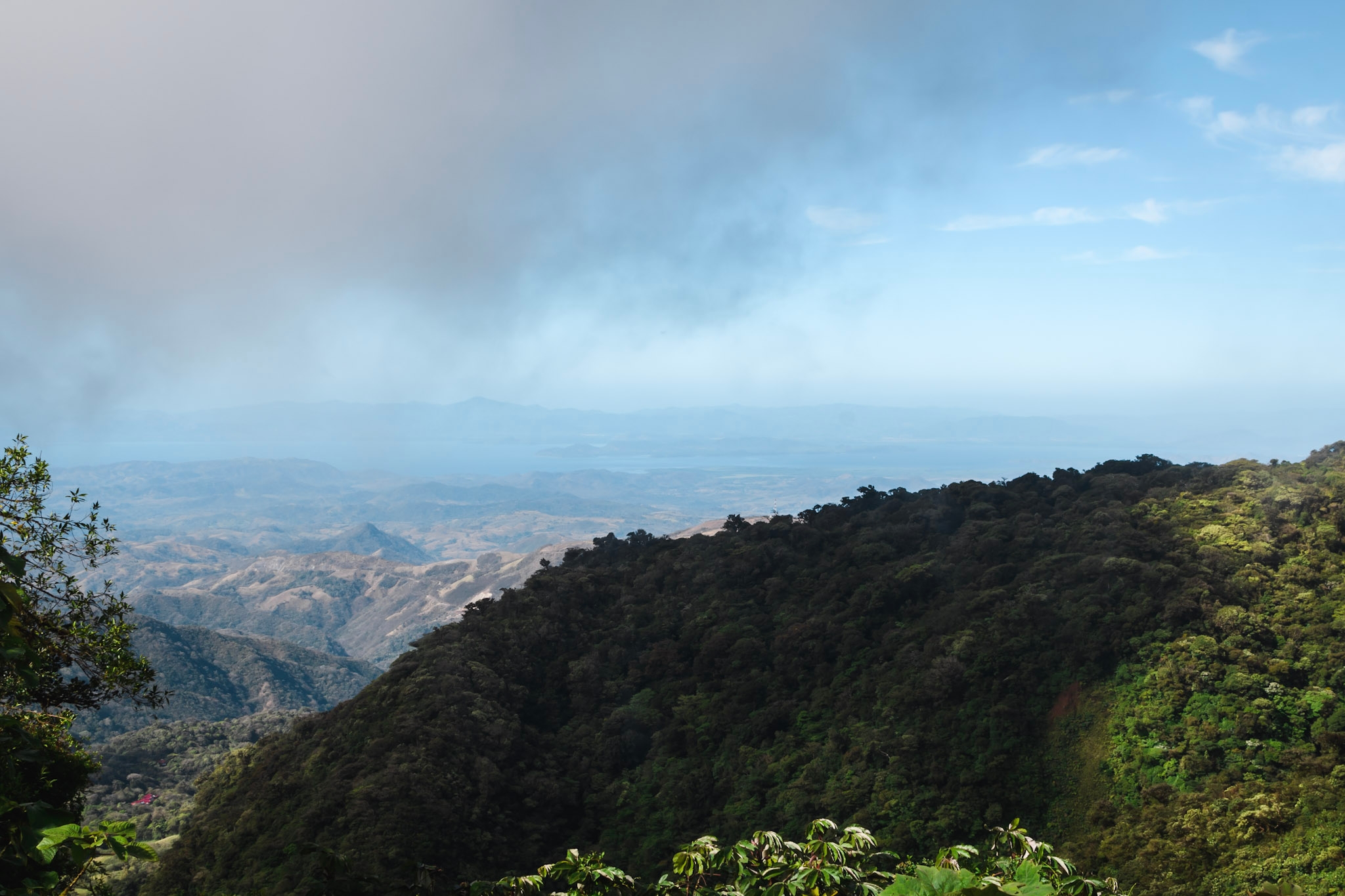 Samedi matin, le soleil est la et le vent aussi. On arrive un peu avant l’ouverture du parc. Ce dernier étant assez réputé, il y a souvent du monde et on a préféré se lever tôt pour pouvoir en profiter sans personne. On parcourt differents sentiers jusqu’à atteindre un point de vue. D’un côté on voit la cloudforest et le vent souffle très fort, de l’autre côté on voit jusqu’à ma péninsule de Nicoya et c’est bien plus calme. Un panneau nous explique qu’à partir d’ici, une goutte tombant sur notre gauche ira jusqu’à l’atlantique tandis que si elle tombe sur notre droite elle atteindra le pacifique. Sur le chemin du retour, le vent se calme et le soleil arrive. On repère plusieurs petits oiseaux, un serpent qui vient de muer et des singes hurleurs. Un peu plus loin, on passe au milieu d’une famille de coatis, occupés à chercher leur déjeuner.