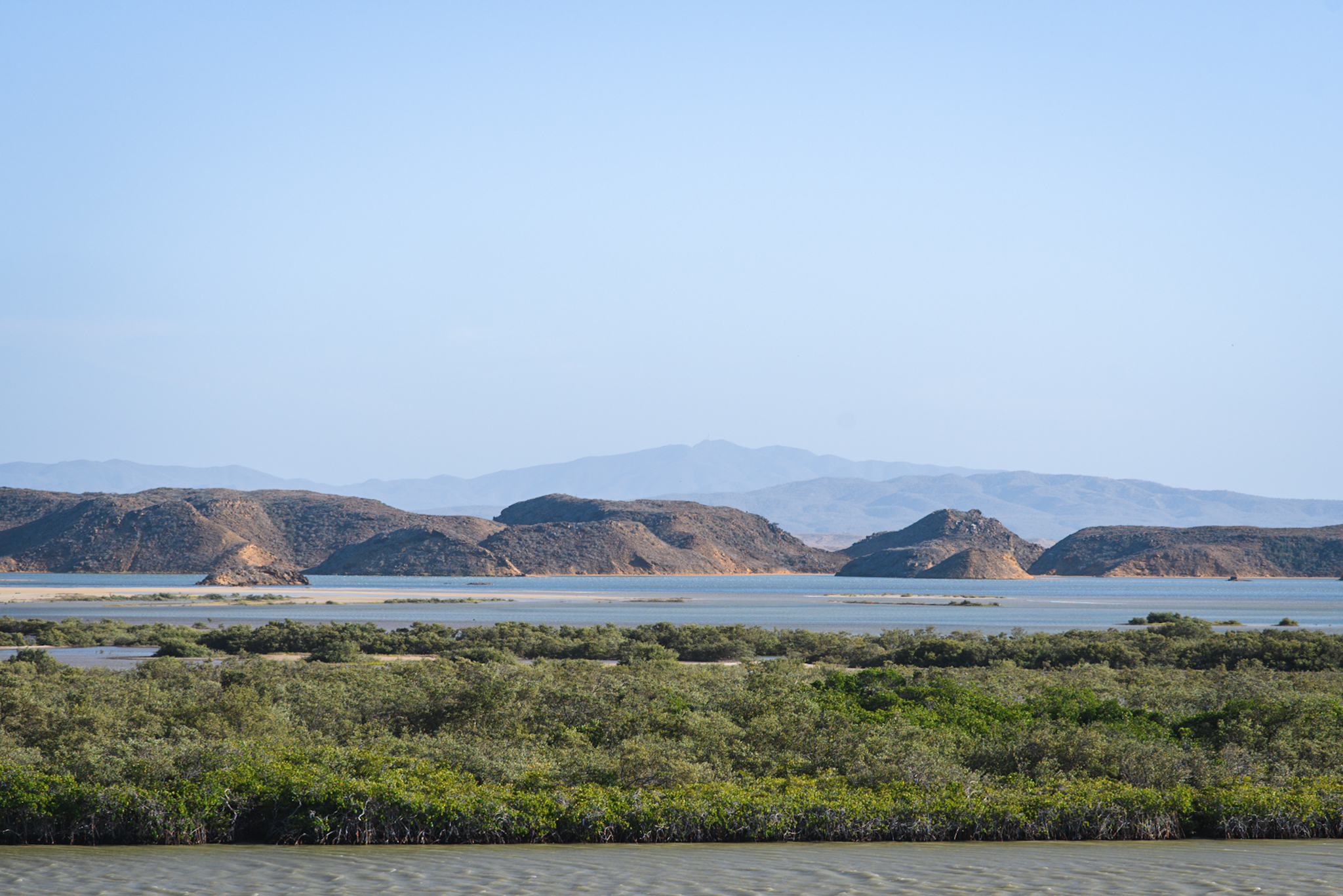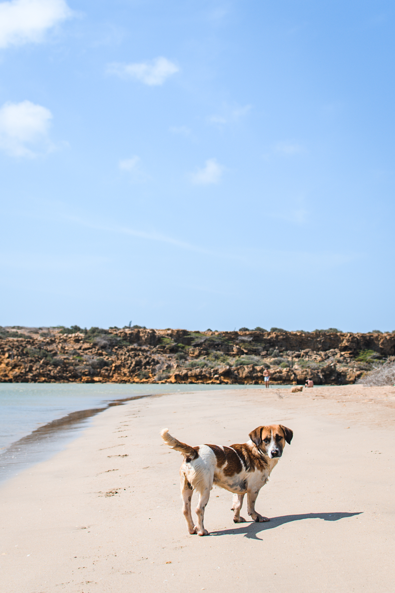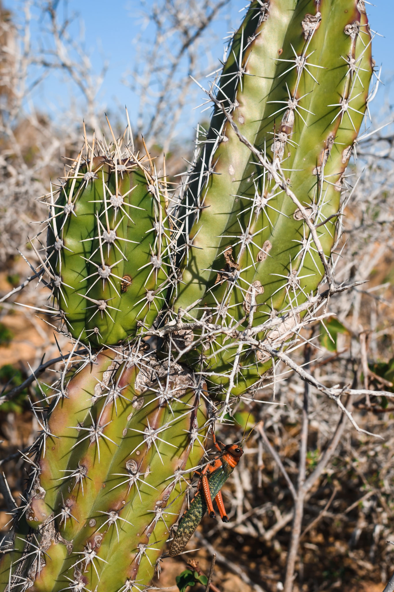 On mange à midi au bord de la mer et puis on roule encore un peu jusqu’à une autre plage. La, Peter vient nous chercher en bateau et nous emmène au milieu de la baie sur une ile. On monte jusqu’au mirador pour la vue. Pour observer une sauterelle géante, je m’aventure dans les cactus et je finis avec mes slashs remplie de picos. J’en enlèverai encore deux jours plus tard tellement ils sont bien enfoncés.