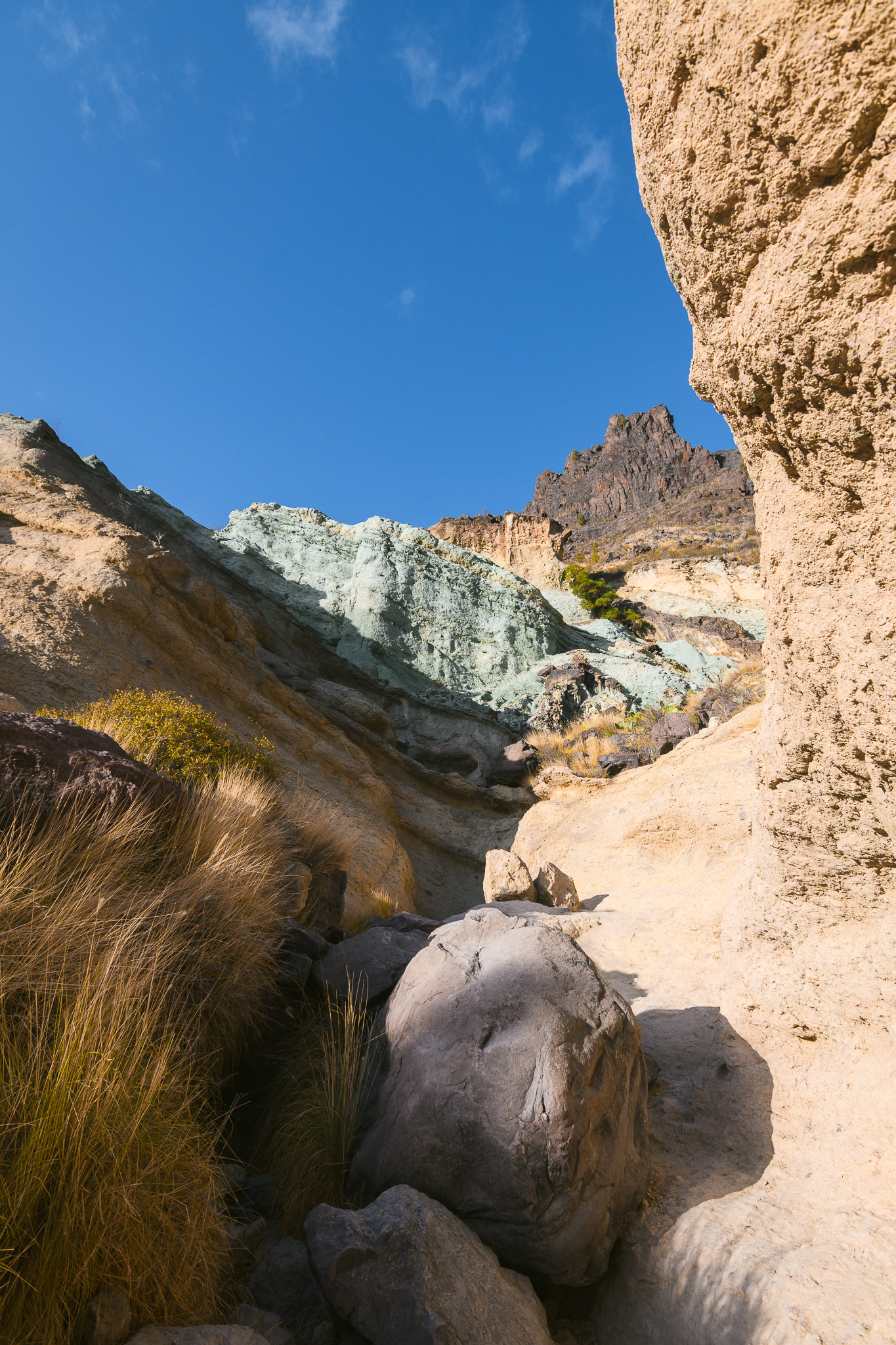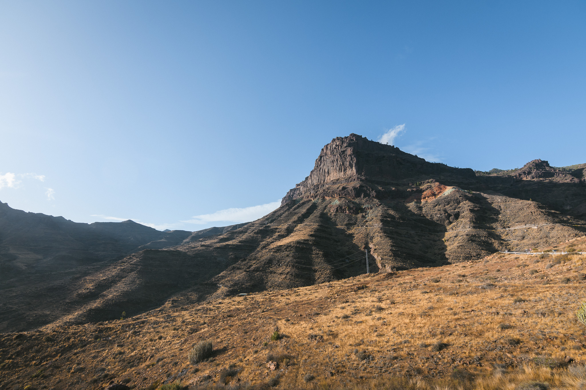 Samedi, on se réveille avec le soleil qui se lève sur le Roque Bentayga. Et une heure plus tard, on se retrouve au pied de ce dernier après une courte randonnée. De là, on voit le Roque Nublo, un rocher isolé qui surplombe la caldeira de Tejeda. C’est notre objectif de l’après midi.
