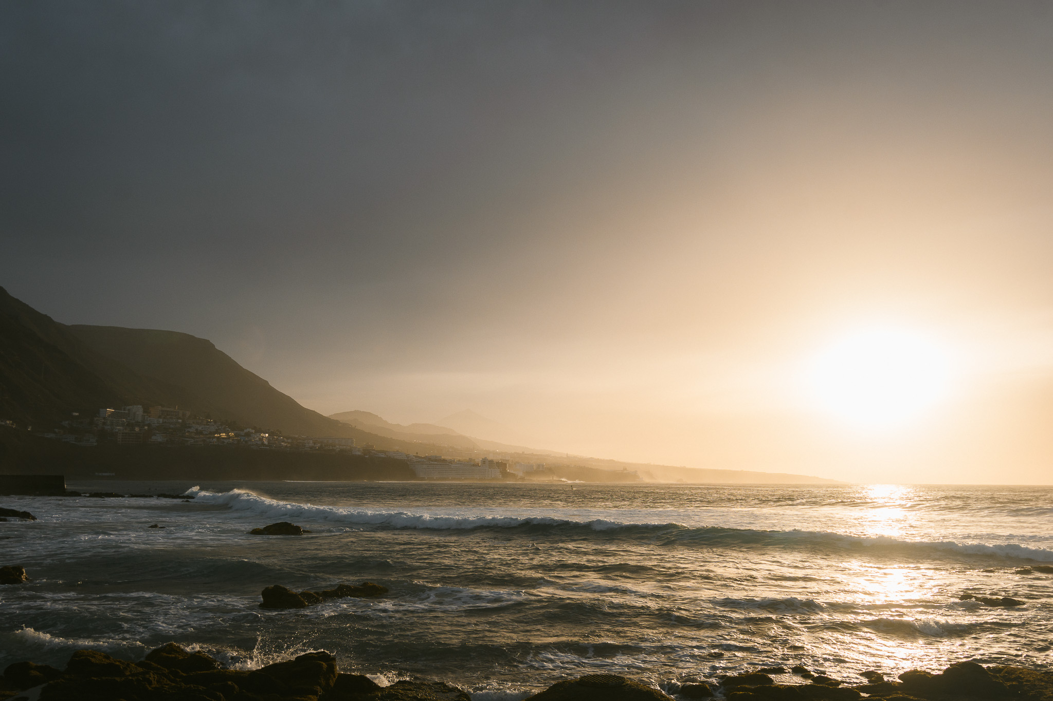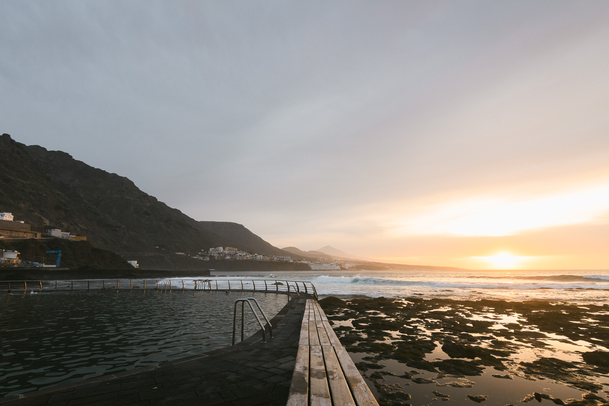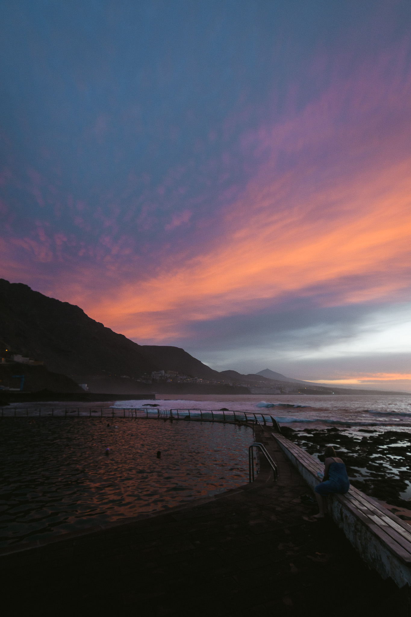 Pour le coucher de soleil, on décide de se rendre à la piscine naturelle de Punta del Hidalgo. Il y a en a plein tout autour de l’île mais on ne pourra pas toutes les explorer. Le soleil se cache derrière les nuages mais il apparaît juste pour le coucher du soleil heureusement. C’est très beau et on a un peu l’impression d’être à Cape Town!
