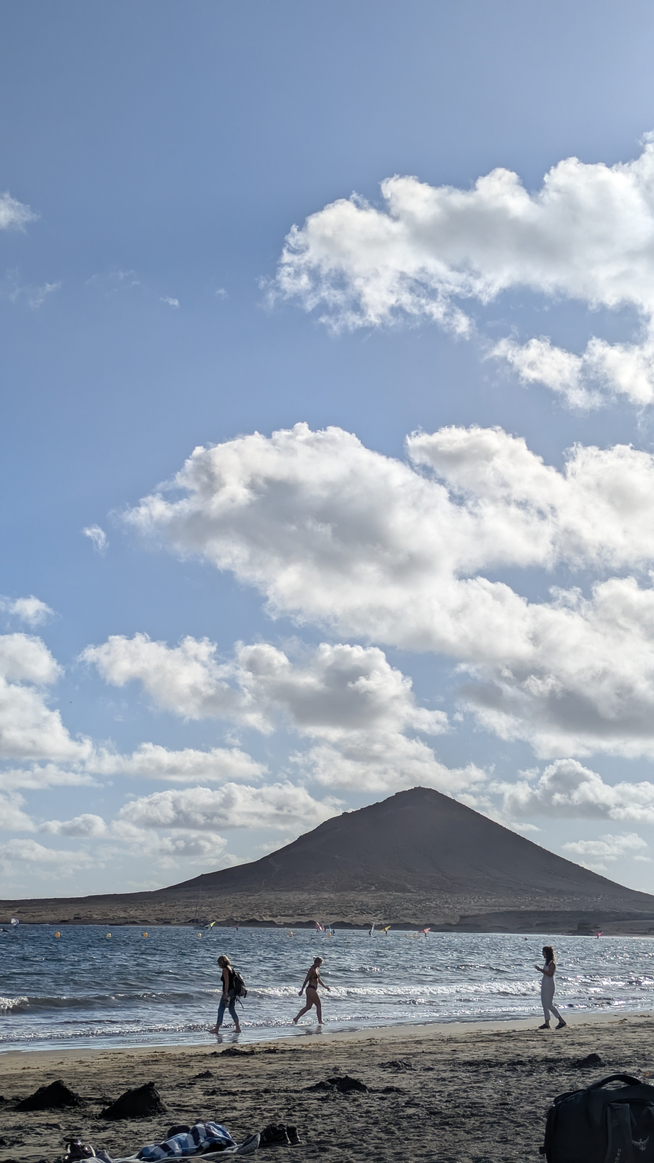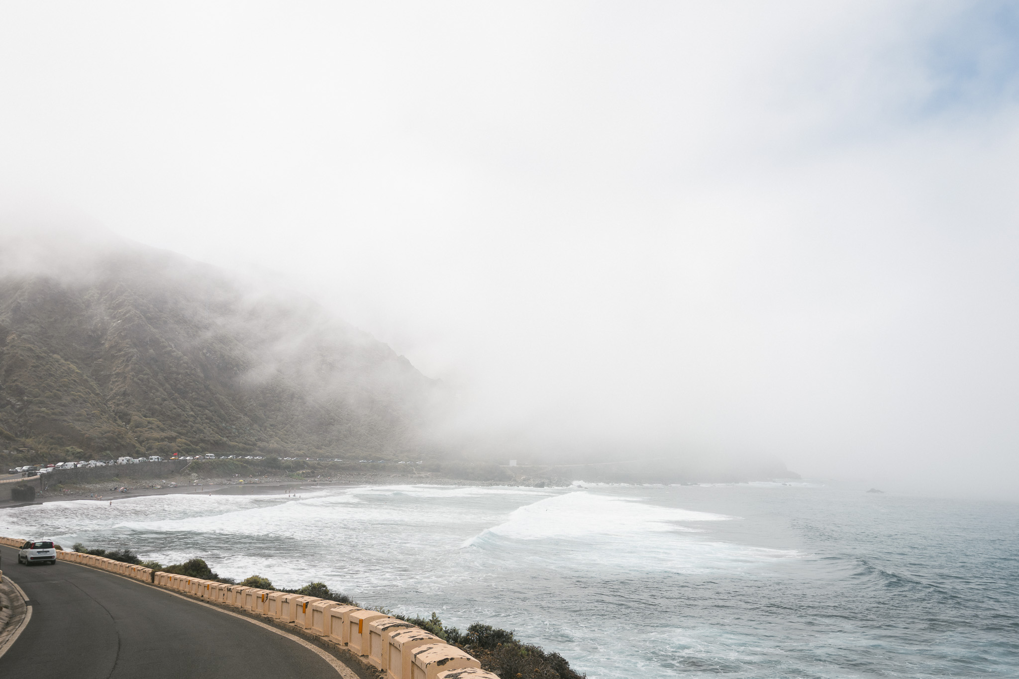 Là, on décide de se parquer à la playa del Roque de las Bodegas et de continuer jusqu’à la prochaine plage à pied. Il fait grand soleil, les surfeurs profitent des vagues et on marche une demi heure jusqu’à un mirador. Là on pique nique et on voit les nuages arriver… Le chemin du retour se fait dans les nuages, c’est fou comme ça a changé en quelques minutes. On comptait s’installer à la plage mais on décide à la place de remonter et redescendre de l’autre côté de la montagne, et de l’île. Là il fait grand soleil, on fait donc bronzette sur la playa de las Teresitas, une plage dont le sable a été importé du Sahara !
