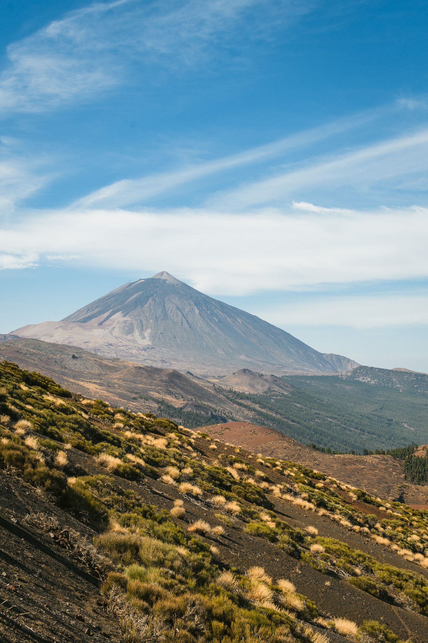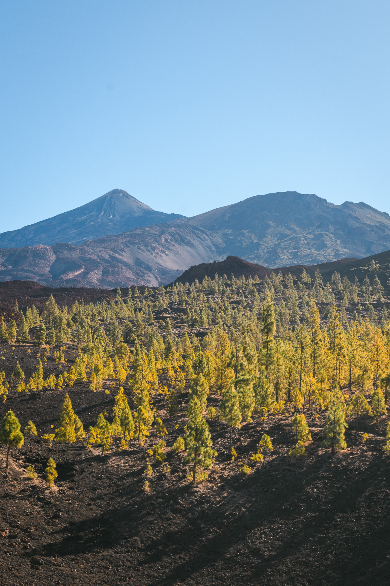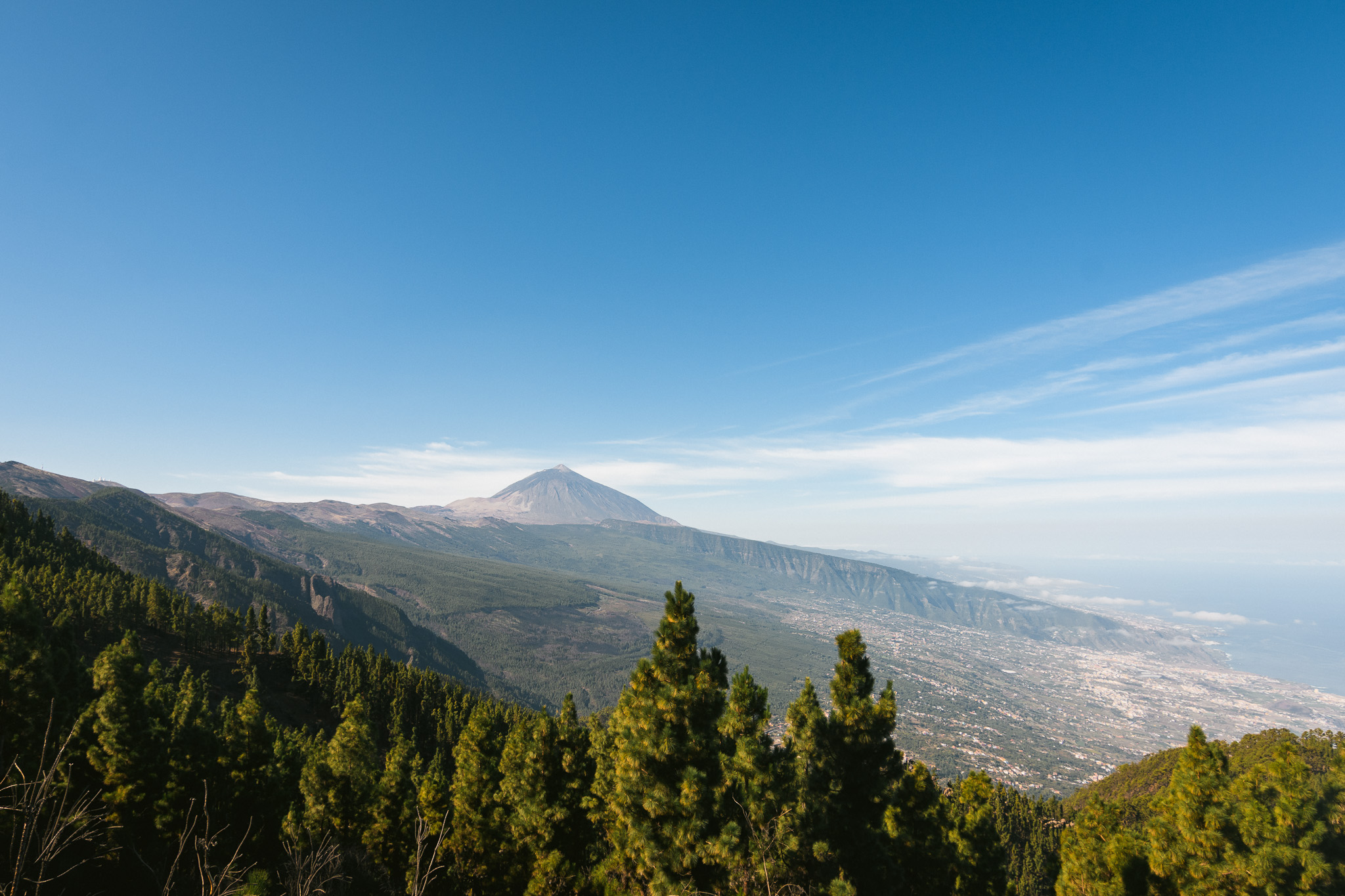 Jeudi, on part pour une grande journée! On commence par rouler vers l’ouest de l’île pour arriver dans le parc national du Teide par un autre chemin. On grimpe et on voit déjà l’île voisine: la Gomera. On s’arrête au Mirador de Samara et de là on fait un balade d’1h30 à travers les forêts de pins et les coulées de lave, toujours avec une vue sur le Teide et son voisin : le pico Viejo.