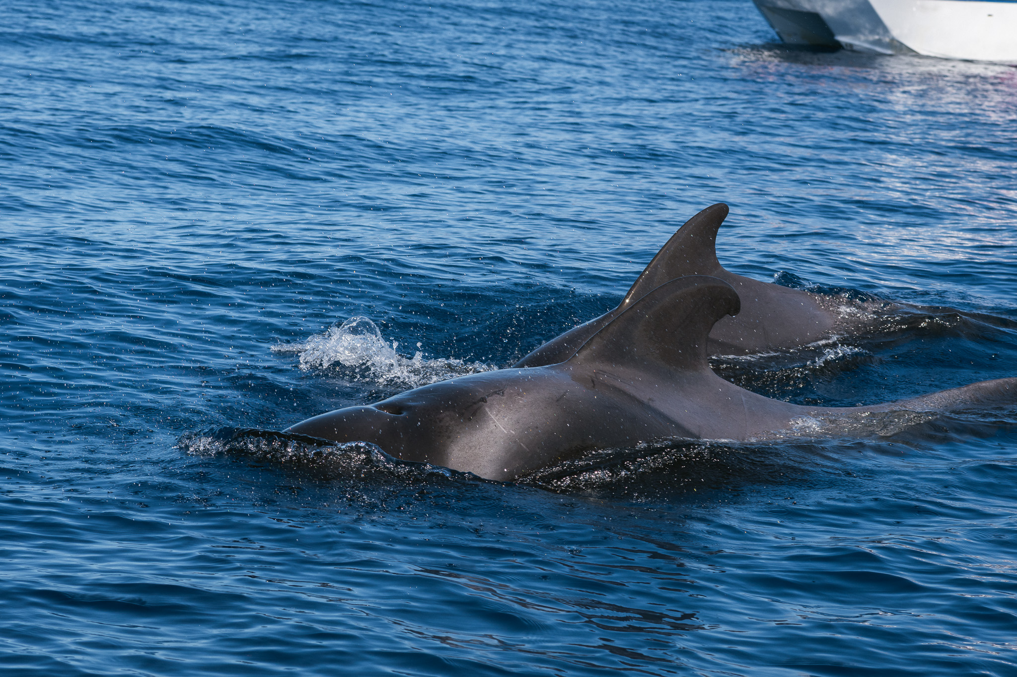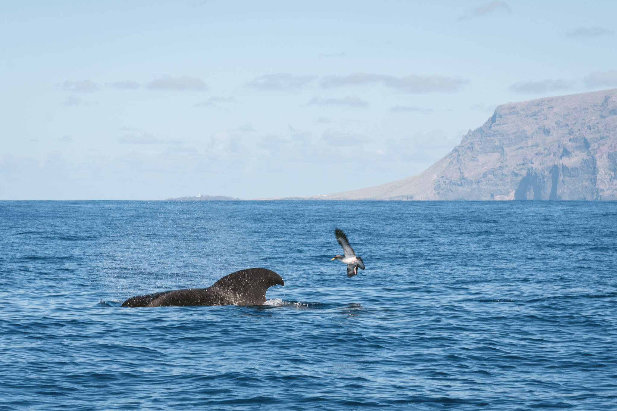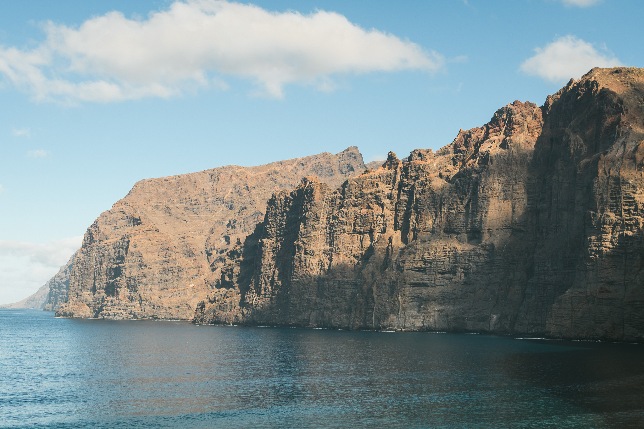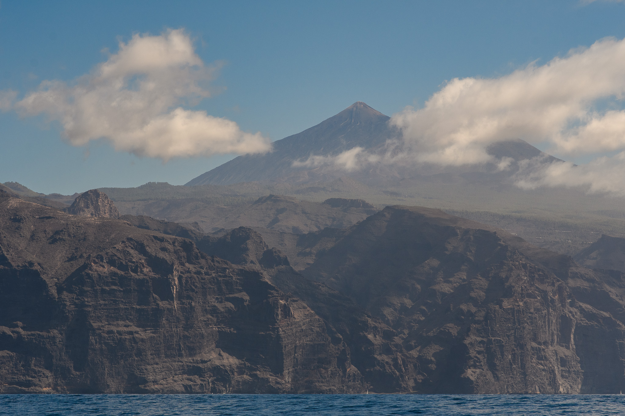 Vendredi on a une nouvelle grosse journée au programme ! Direction Los Gigantes pour voir non seulement des falaises de 600m de haut mais aussi des baleines (et dauphins) ! Les baleines pilotes sont présentes toute l’année ici et il y a 90% de chance de les apercevoir ici. On est sur un petit bateau, à 12 et notre capitaine file au milieu de la mer. On ne voit rien autour de nous jusqu’à ce qu’il nous dise: devant à droite ! Et la on voit un aileron (ce sont des petites baleines avec un aileron). C’est un mâle solo mais plus tard on en verra deux autres. On les suit calmement, c’est parfait!